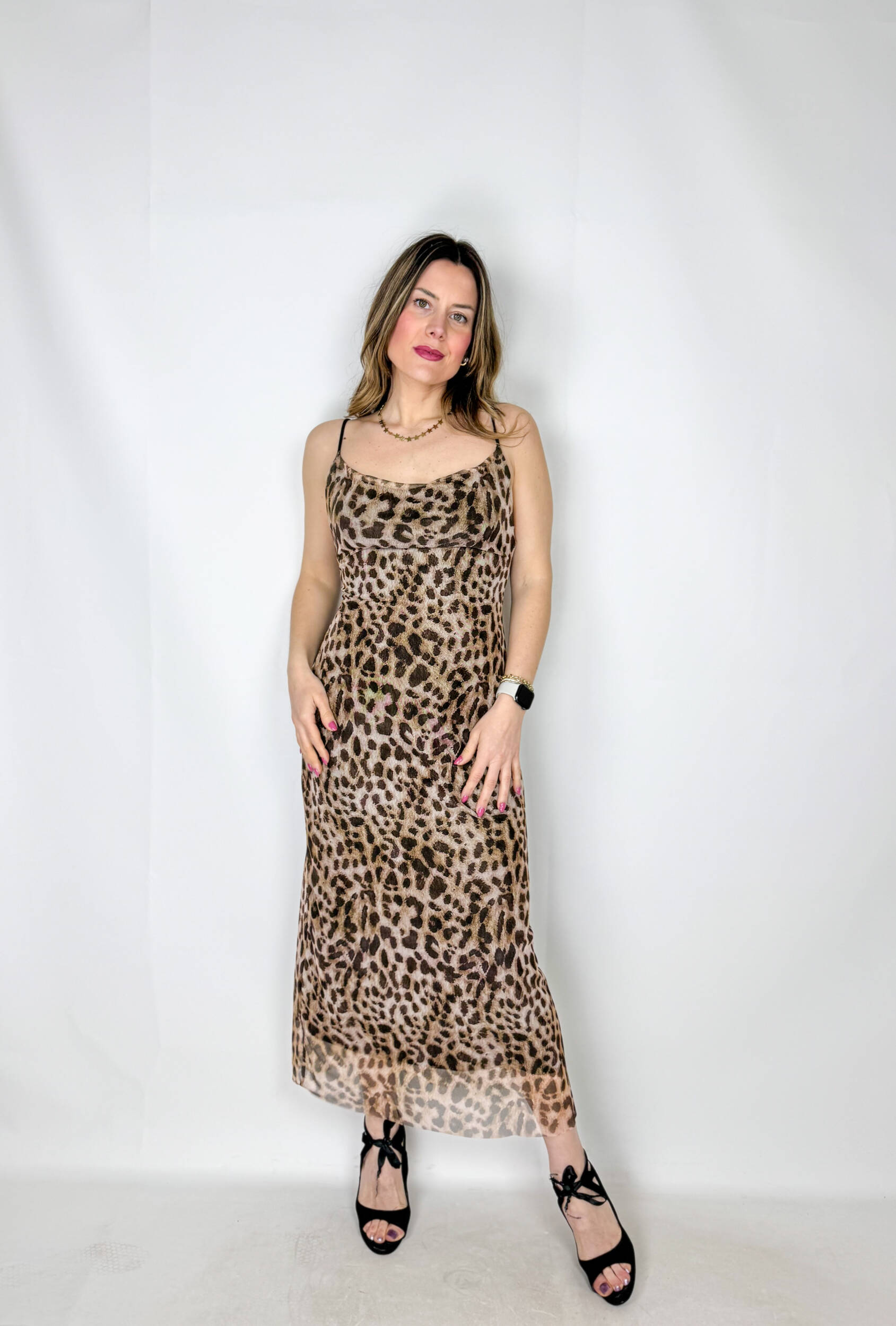 Abito Amanda lungo in fantasia leopardata, realizzato in tessuto elasticizzato che avvolge la silhouette esaltandone le forme con naturale eleganza. Il modello presenta uno scollo a barchetta raffinato, che valorizza le spalle, mentre la schiena leggermente scoperta aggiunge un tocco sensuale e sofisticato. La lunghezza alla caviglia slancia la figura, rendendo il capo ideale sia per il giorno che per la sera.