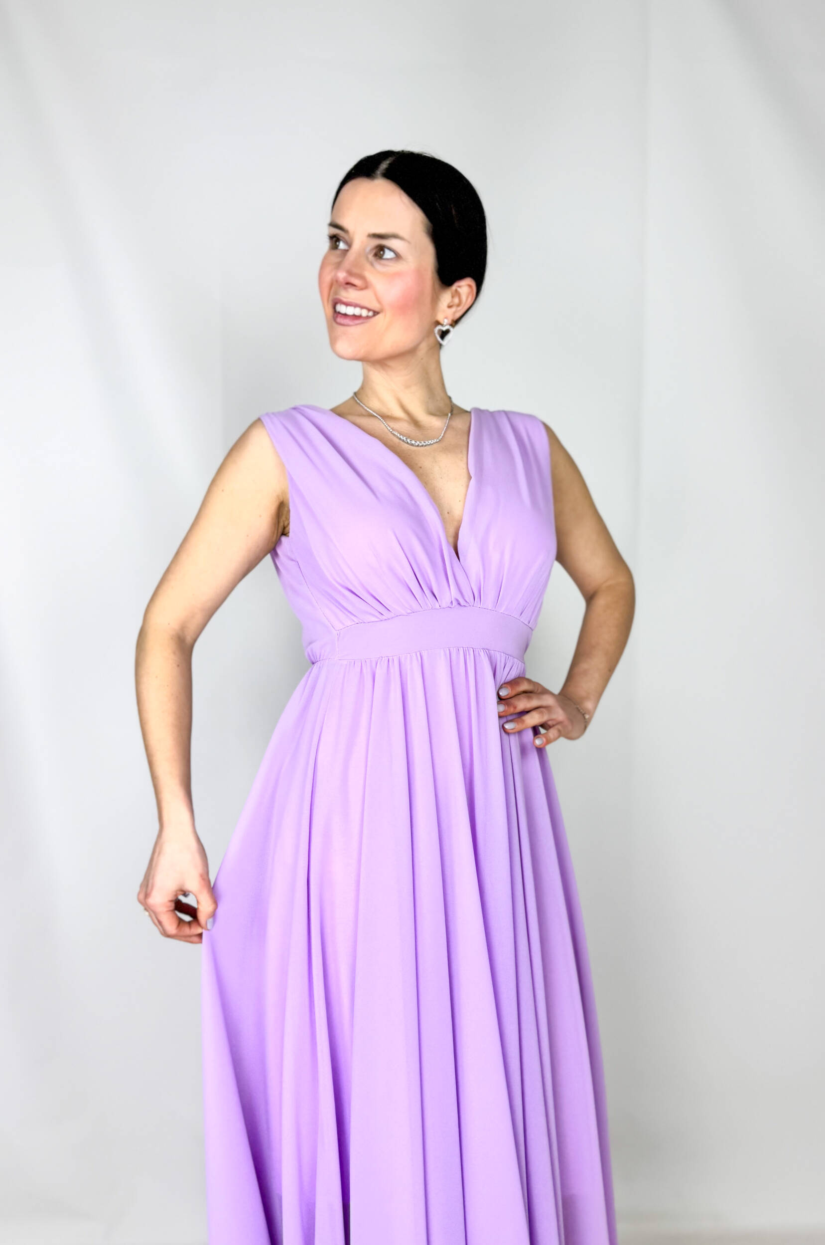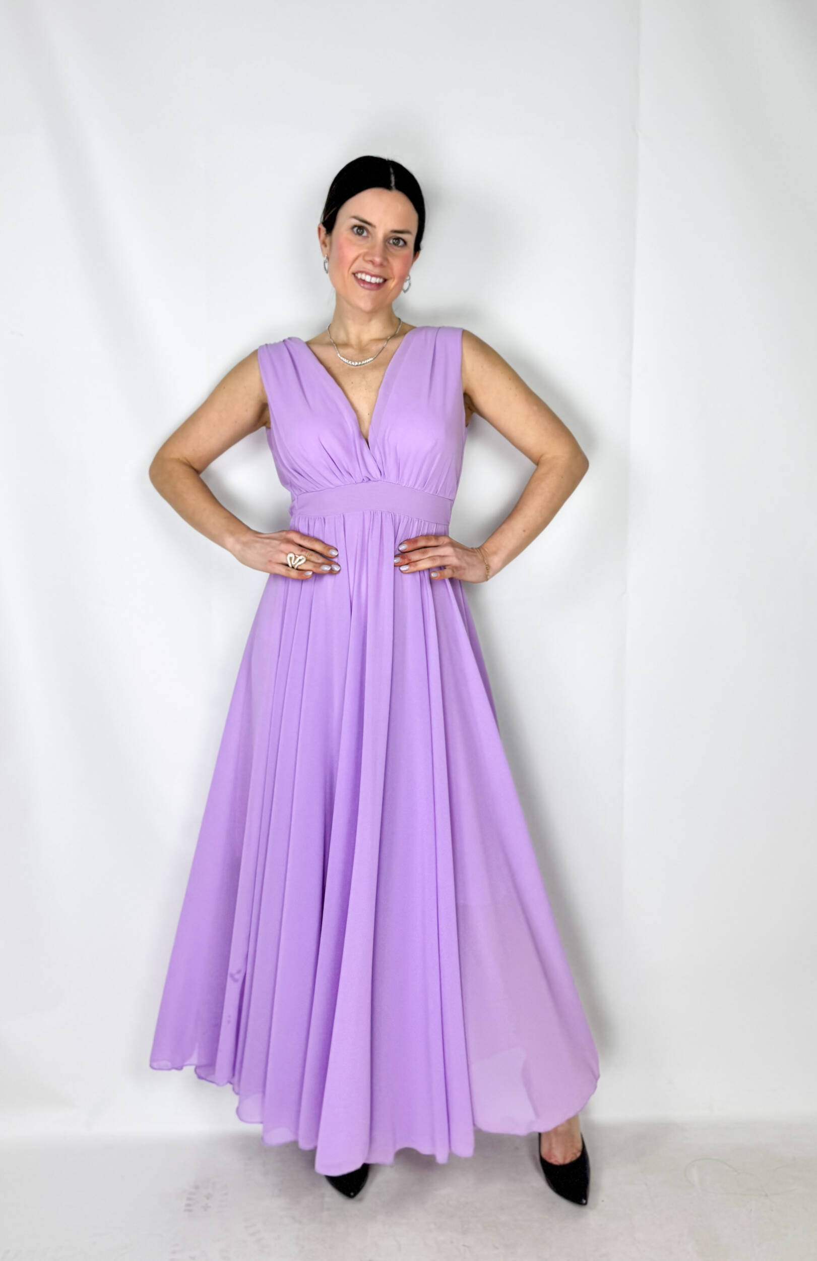 Abito Aurora romantico e femminile con scollo a V sia davanti che sul retro, che valorizza delicatamente il décolleté e la schiena. La vita con elastico definisce la silhouette garantendo comfort e vestibilità. La gonna è arricchita da una morbida sottogonna in cotone con strati di tulle color lilla che donano volume, leggerezza e un elegante effetto vaporoso. Perfetto per cerimonie, feste ed eventi speciali.