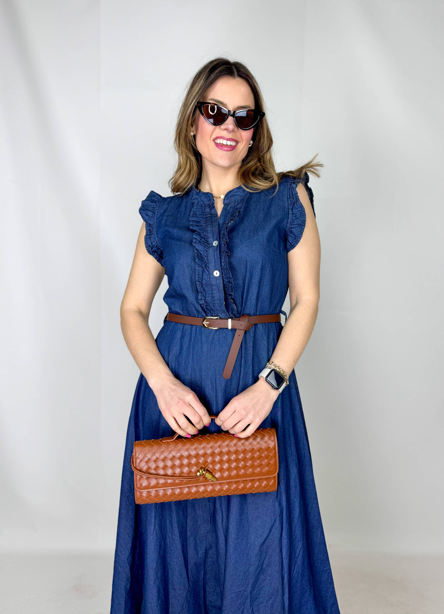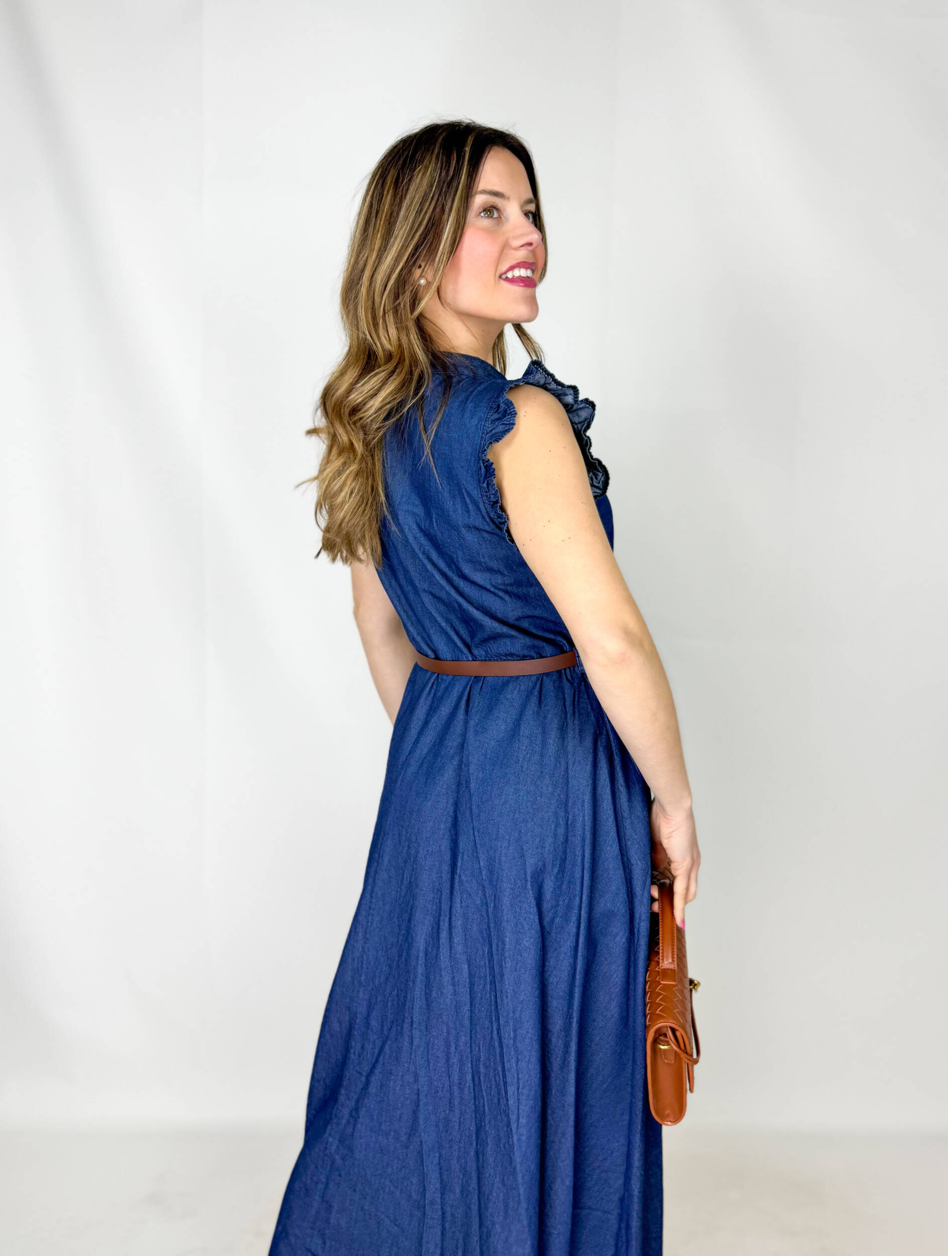 Abito Romance in 100% denim di cotone, dal carattere fresco e contemporaneo, perfetto per uno stile casual-chic. Il top smanicato presenta un elegante collo alla coreana e un delicato rouge sul petto che aggiunge volume e femminilità al design. La gonna morbida scende fluida, donando movimento e comfort alla silhouette. In vita, la cintura regolabile marrone sottolinea il punto vita e completa il look.