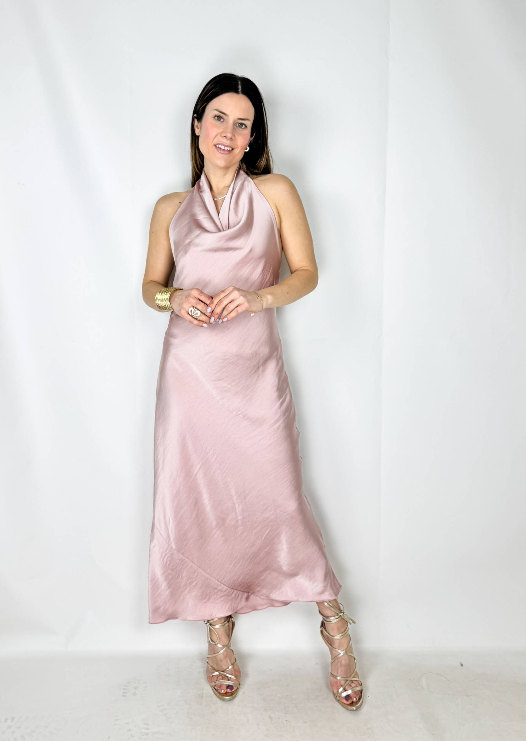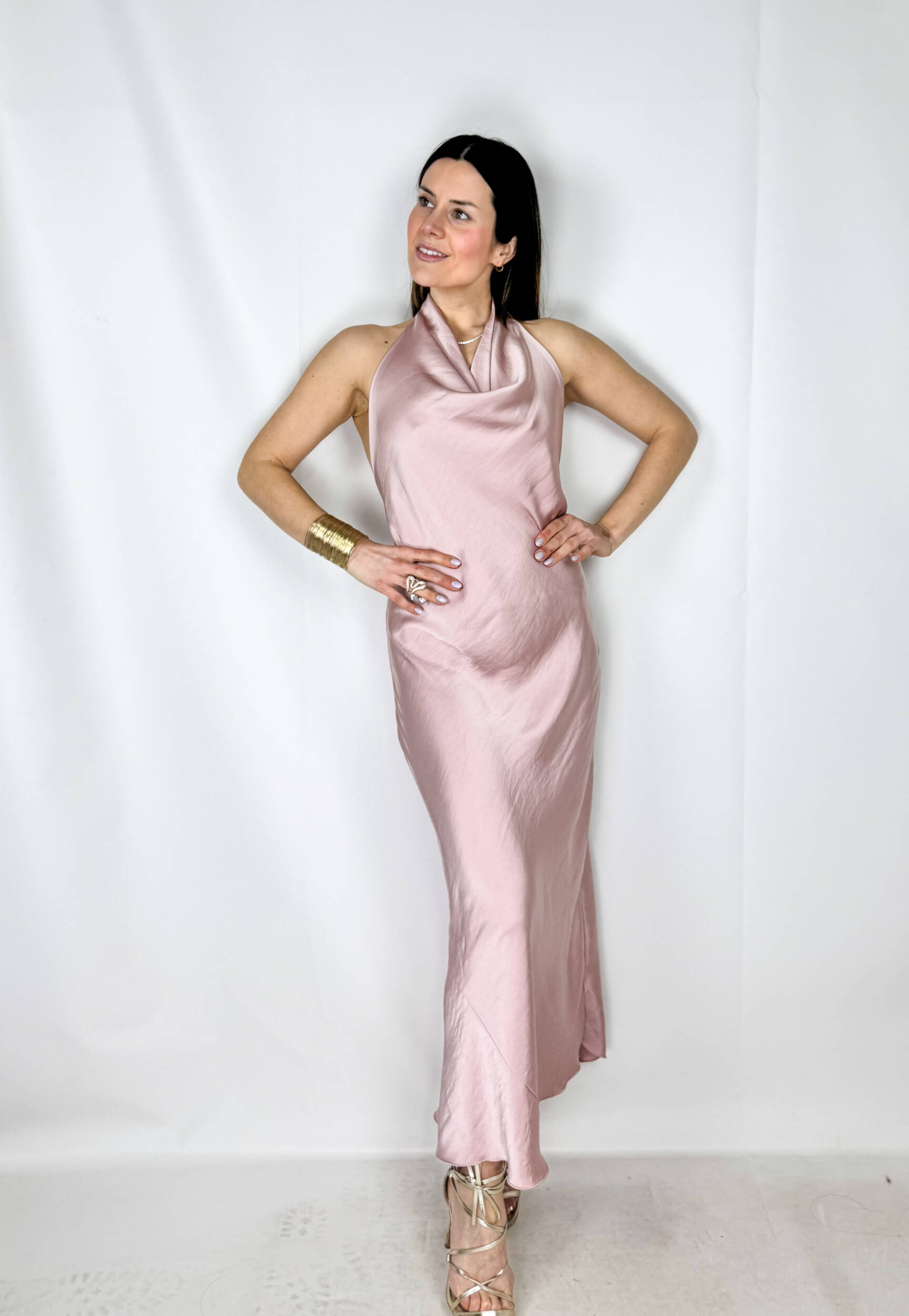 Abito Rosa di Seta lungo in satin color rosa, elegante e delicato. Il modello si allaccia dietro al collo lasciando la schiena leggermente scoperta, creando un effetto raffinato e femminile. Il tessuto satinato scende morbido lungo la silhouette fino alla caviglia, valorizzando le forme con naturalezza e leggerezza. Un abito romantico e sofisticato, perfetto per cerimonie, eventi eleganti e serate speciali.