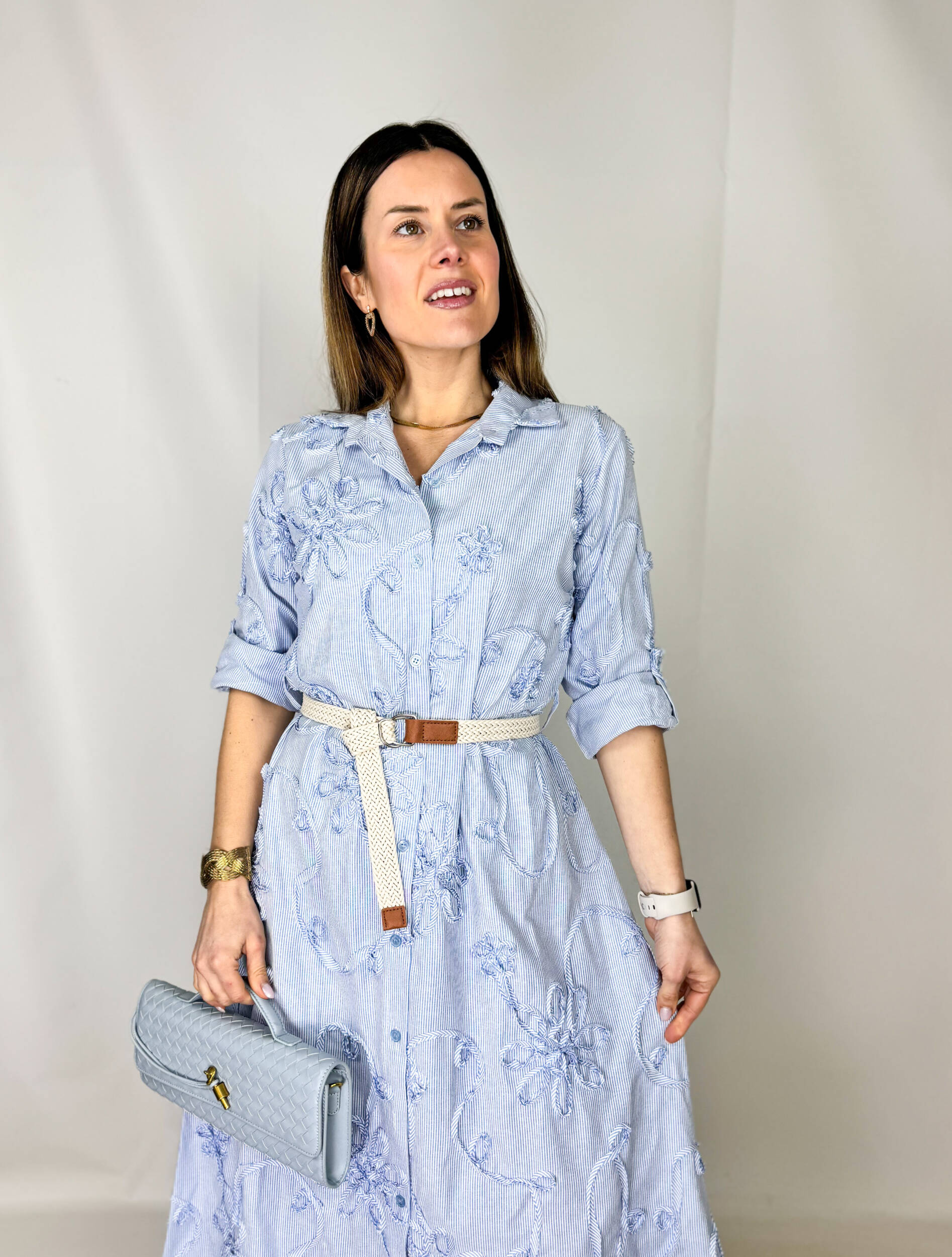 I ricami delicati aggiungono un tocco artigianale e sofisticato, mentre la cintura in vita permette di valorizzare la silhouette creando una linea armoniosa e femminile.