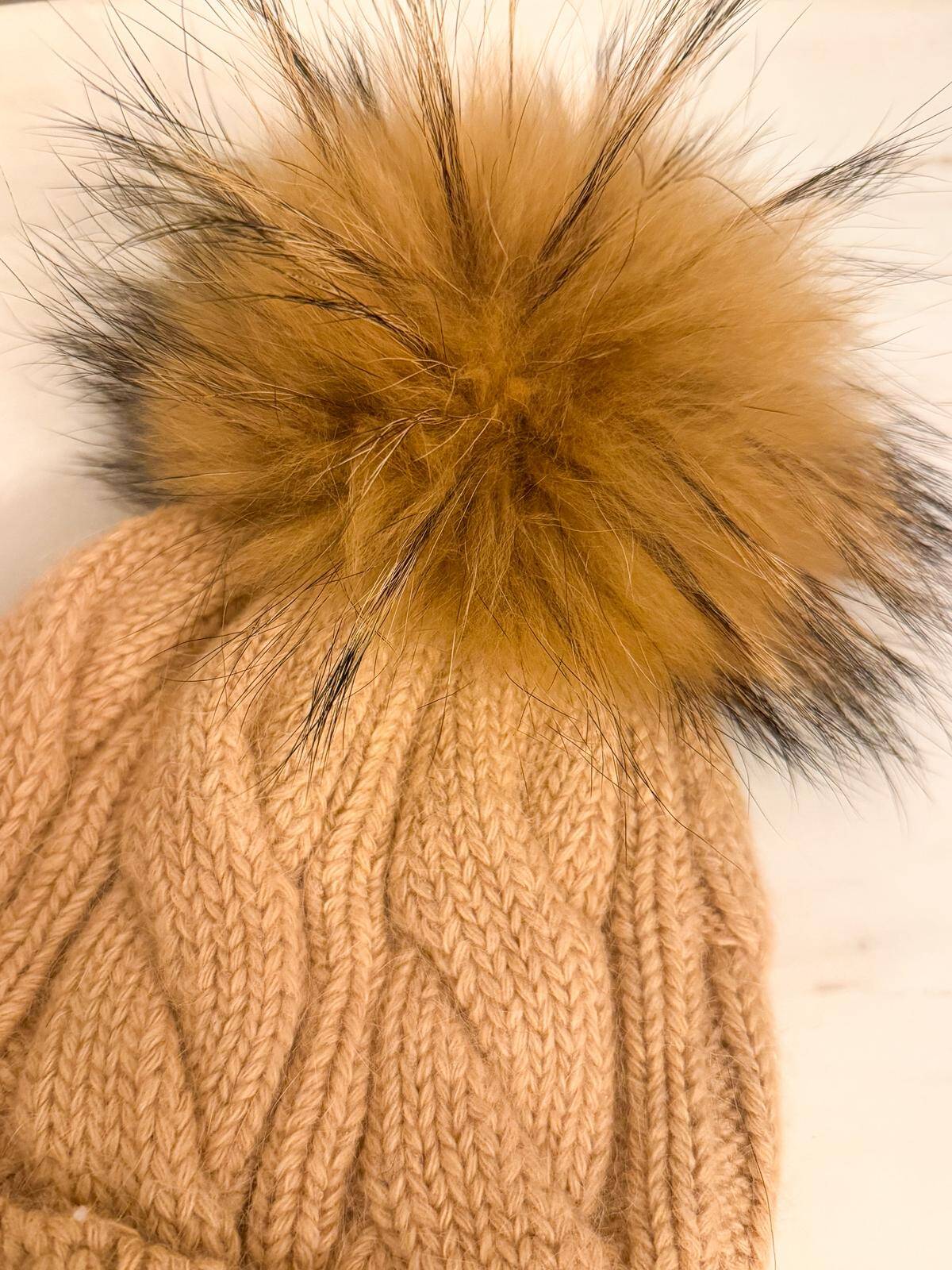 Berretto Sankt Moritz invernale, foderato e lavorato a treccia con pompon in eco pelliccia.