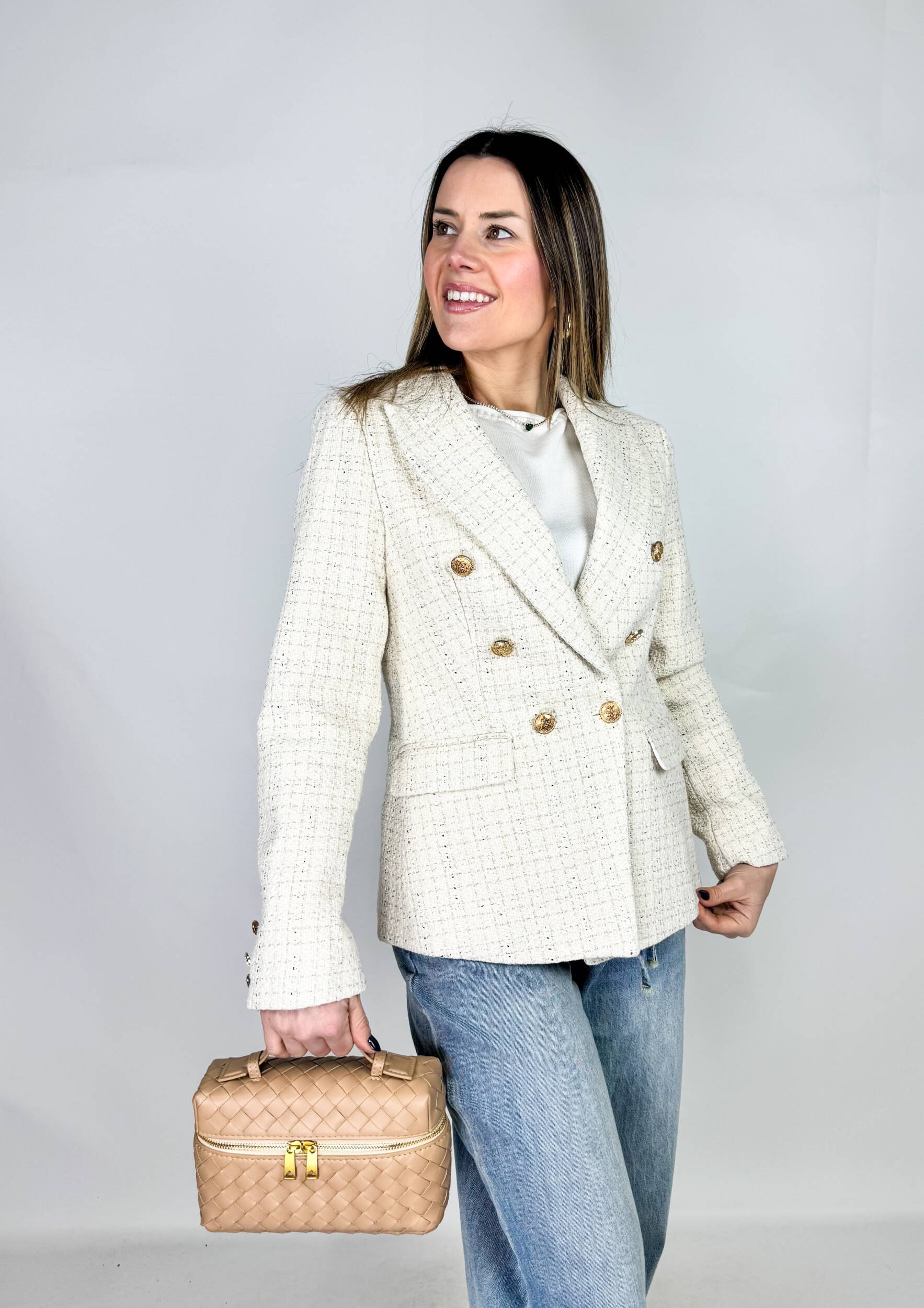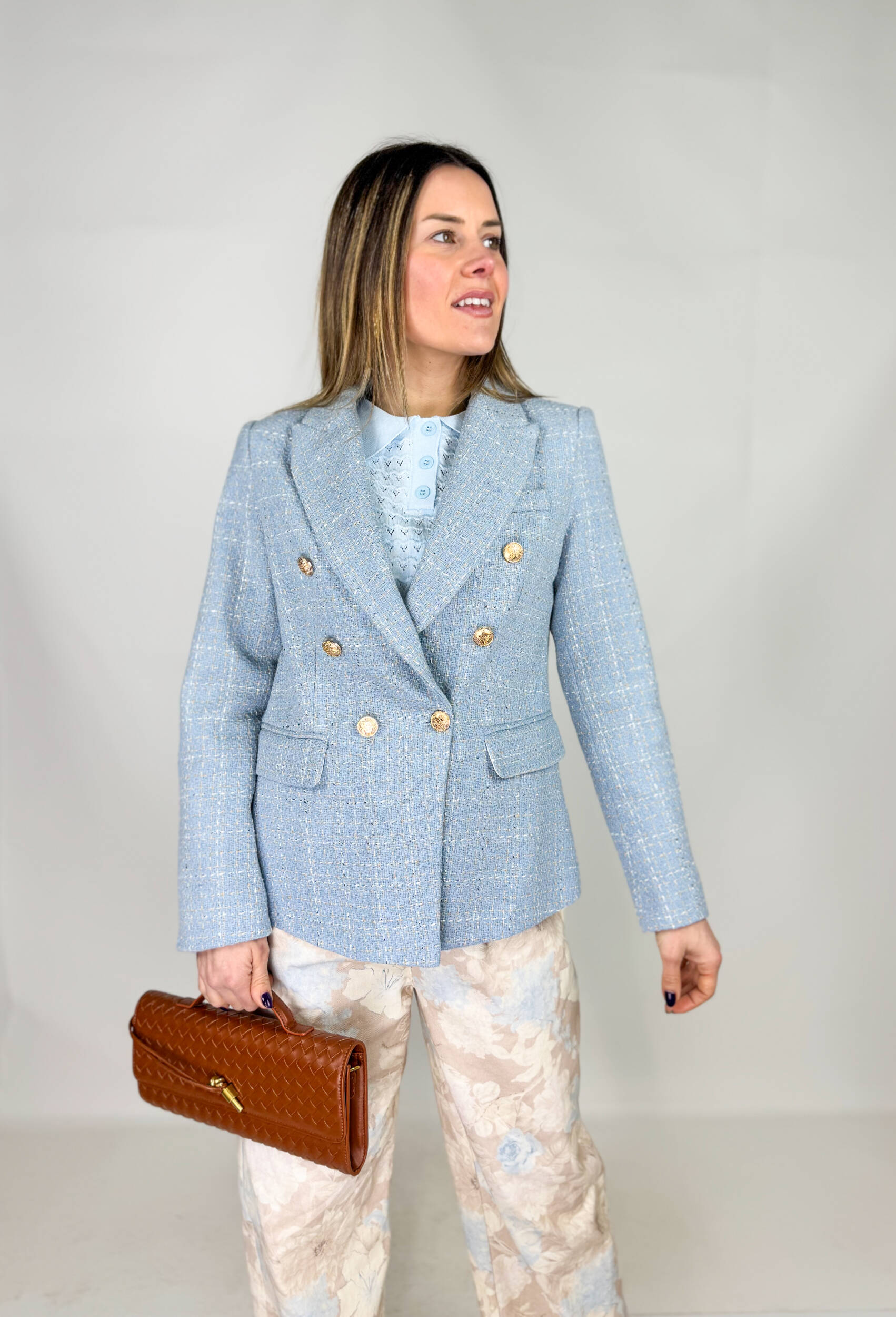 Blazer Anny in tweed luminoso, dal design raffinato e senza tempo. Il tessuto รจ impreziosito da leggere trame brillanti. Modello doppiopetto chiuso con bottoni dorati, rever classico e tasche frontali decorative.