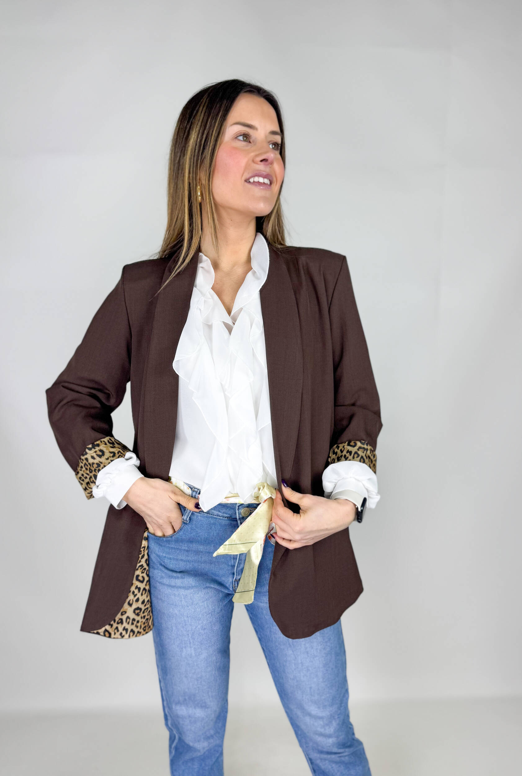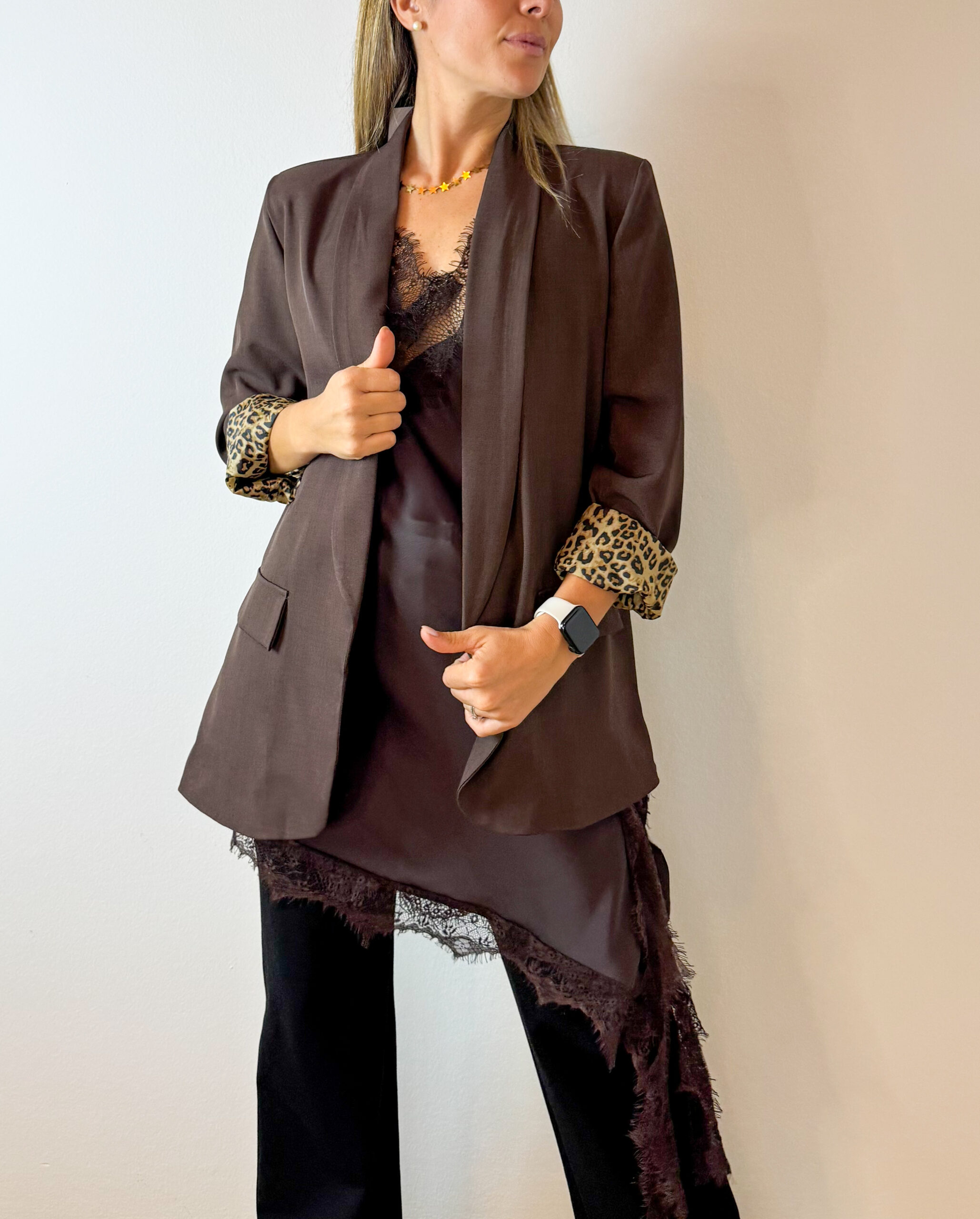 Blazer Dubai aperto sul davanti con spalline imbottite. Collo revers. Fodera leopardata.