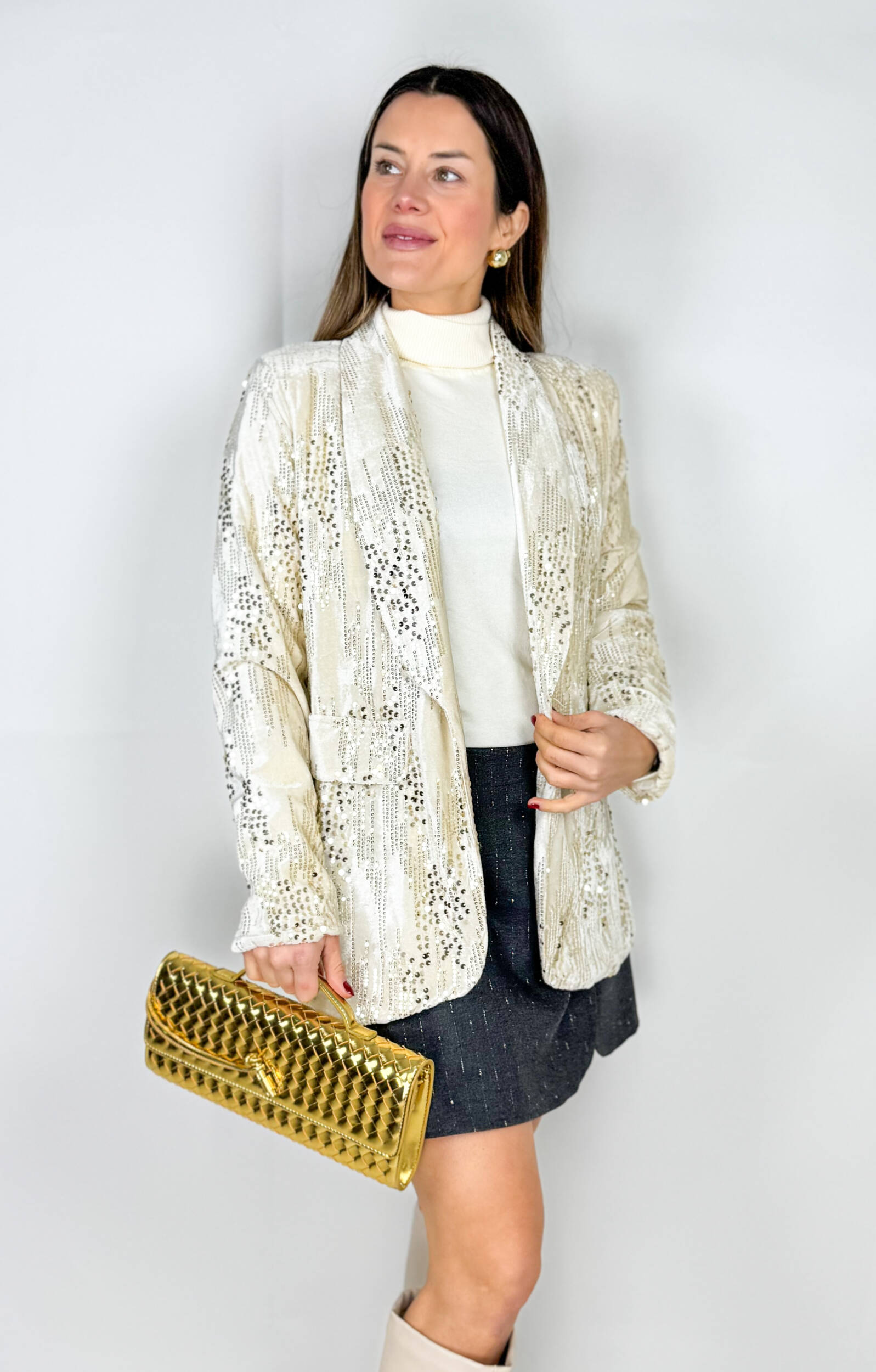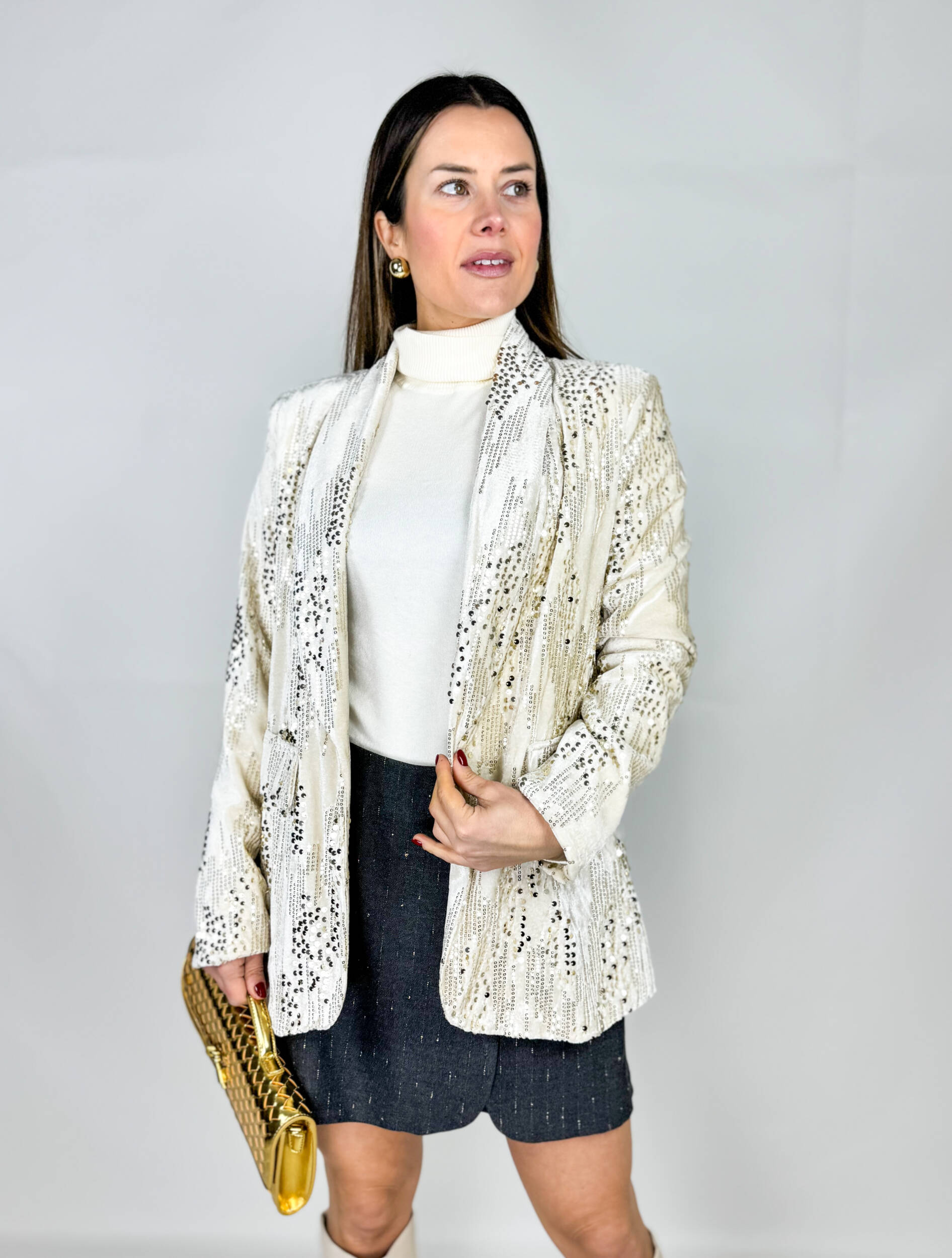 Blazer Mary in velluto con pailettes applicate color panna. Aperto sul davanti con collo revers.