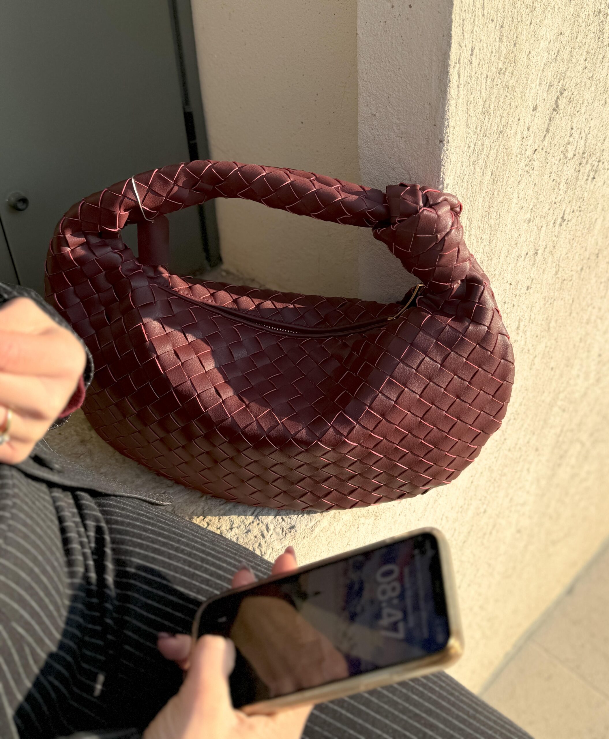 Borsa Alice in vera pelle intrecciata a mano, modello di un noto marchio italiano. Nodo sul manico. Ideale a spalla o a mano. Dona un tocco di grinta a qualsiasi outfit.