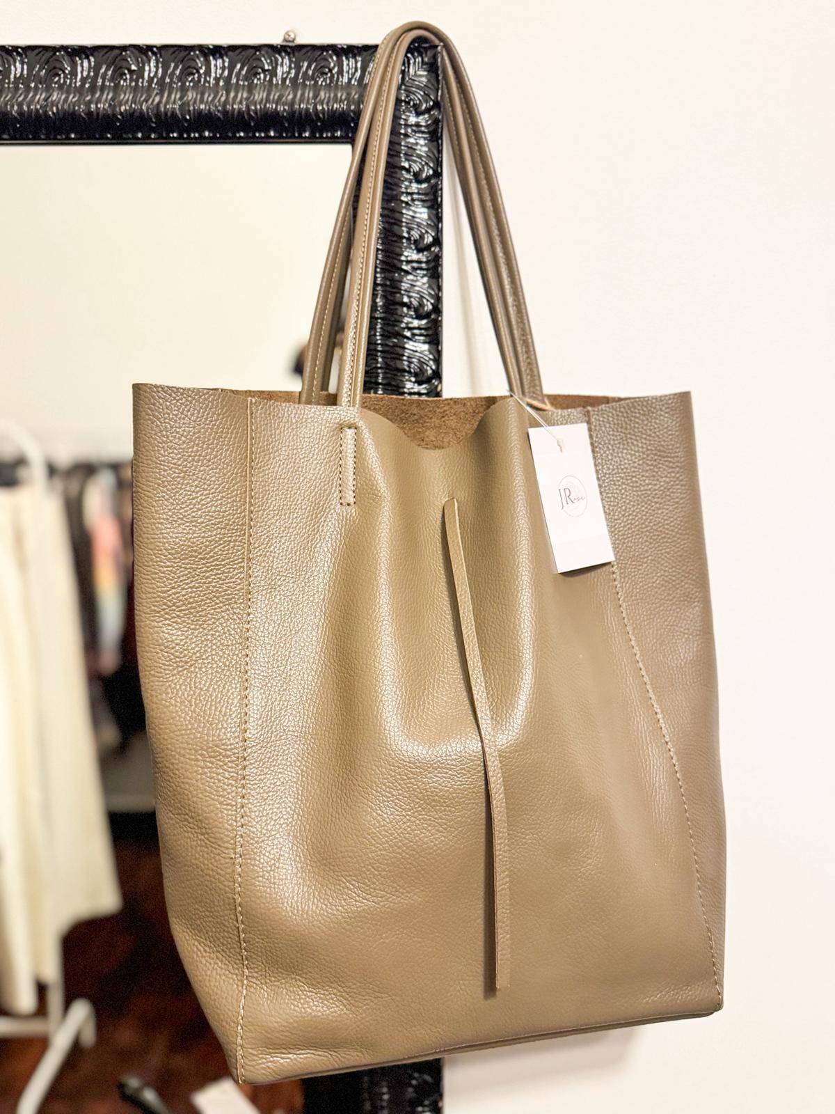 Borsa in pelle beige modello Taupe con manico da sotto spalla e taglio vivo con tasca interna chiusa.
