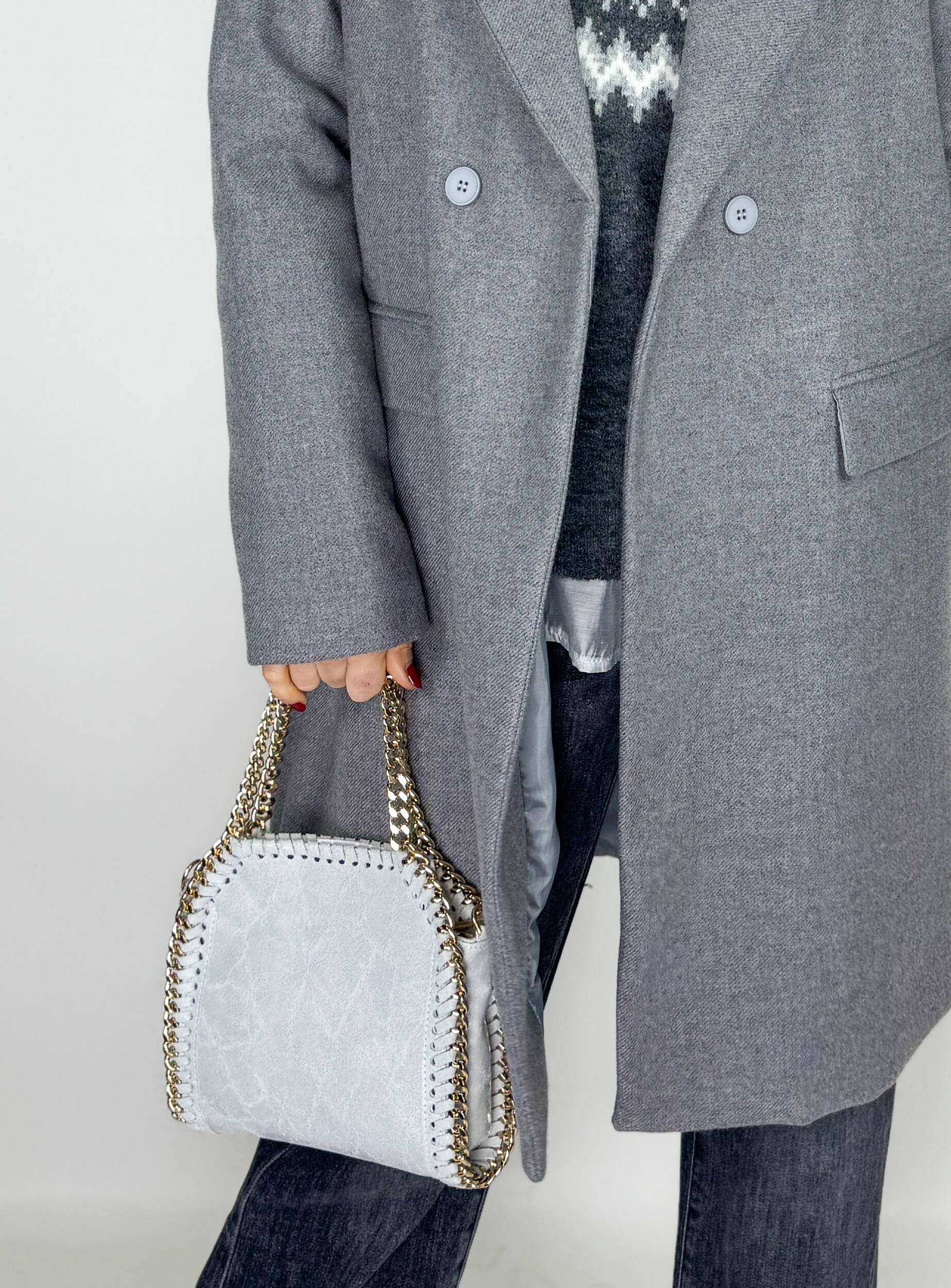 Borsa titti color ghiaccio in pelle vera con finiture a catena con taglio a diamante. Chiusura con zip, tascha interna con zip e tracolla a catena inclusa.