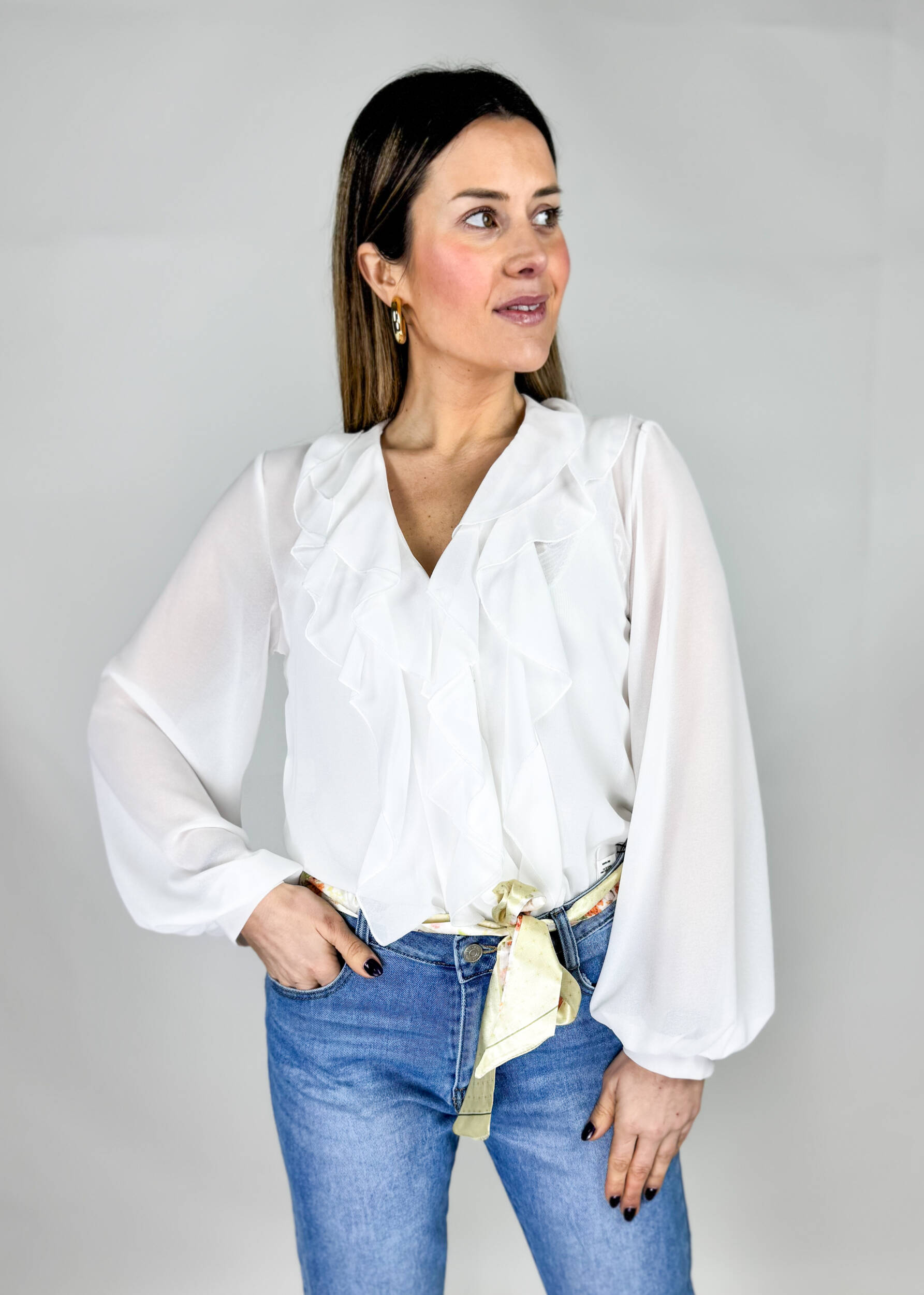 Camicia Adele in tessuto velato, scollata a V con eleganti balze sul davanti. Maniche morbide con polsini elasticizzati. Ideale da ufficio o per look eleganti.