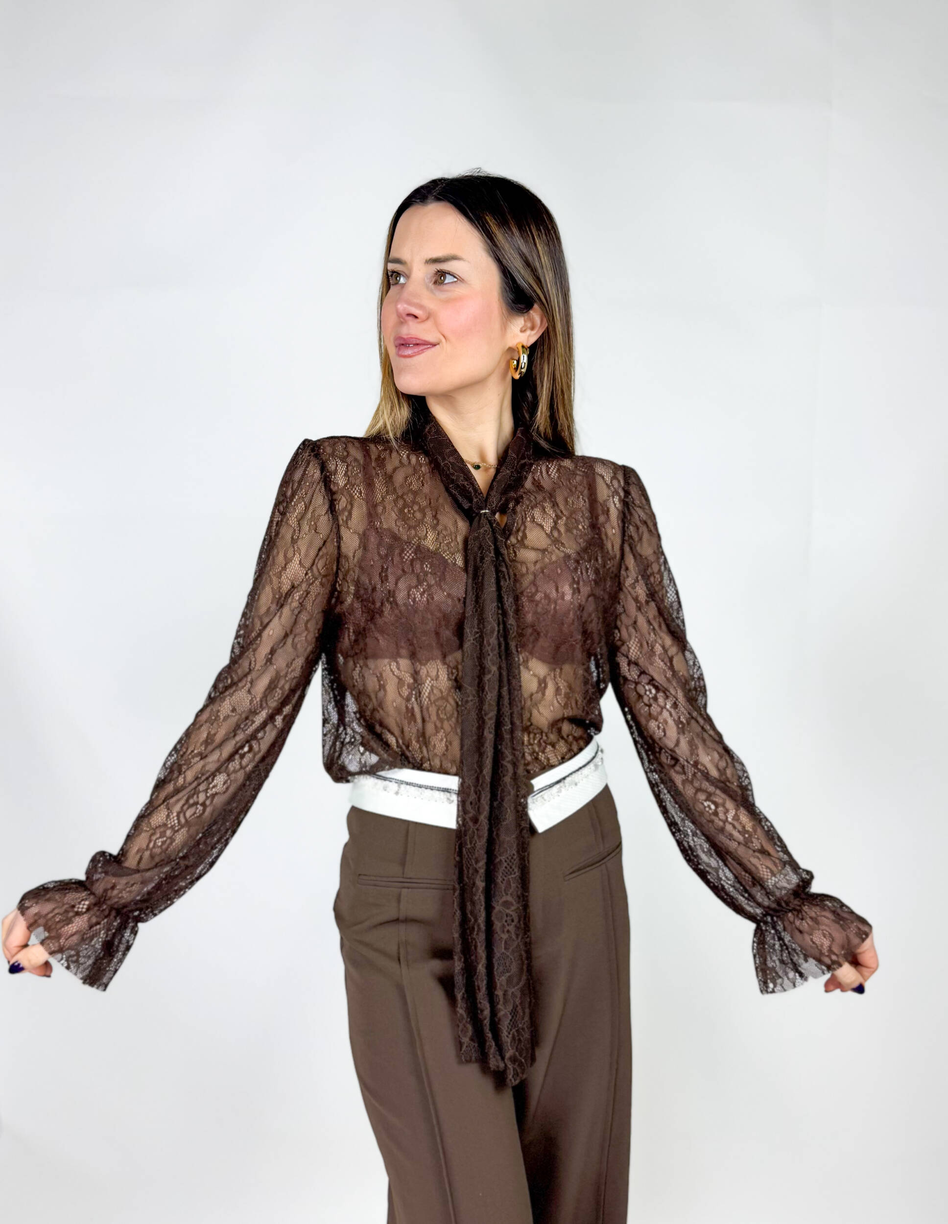 Camicia in pizzo con dettaglio cravattino regolabile, maniche a sbuffo. Non pizzica e non prude. Vestibilità leggermente over.