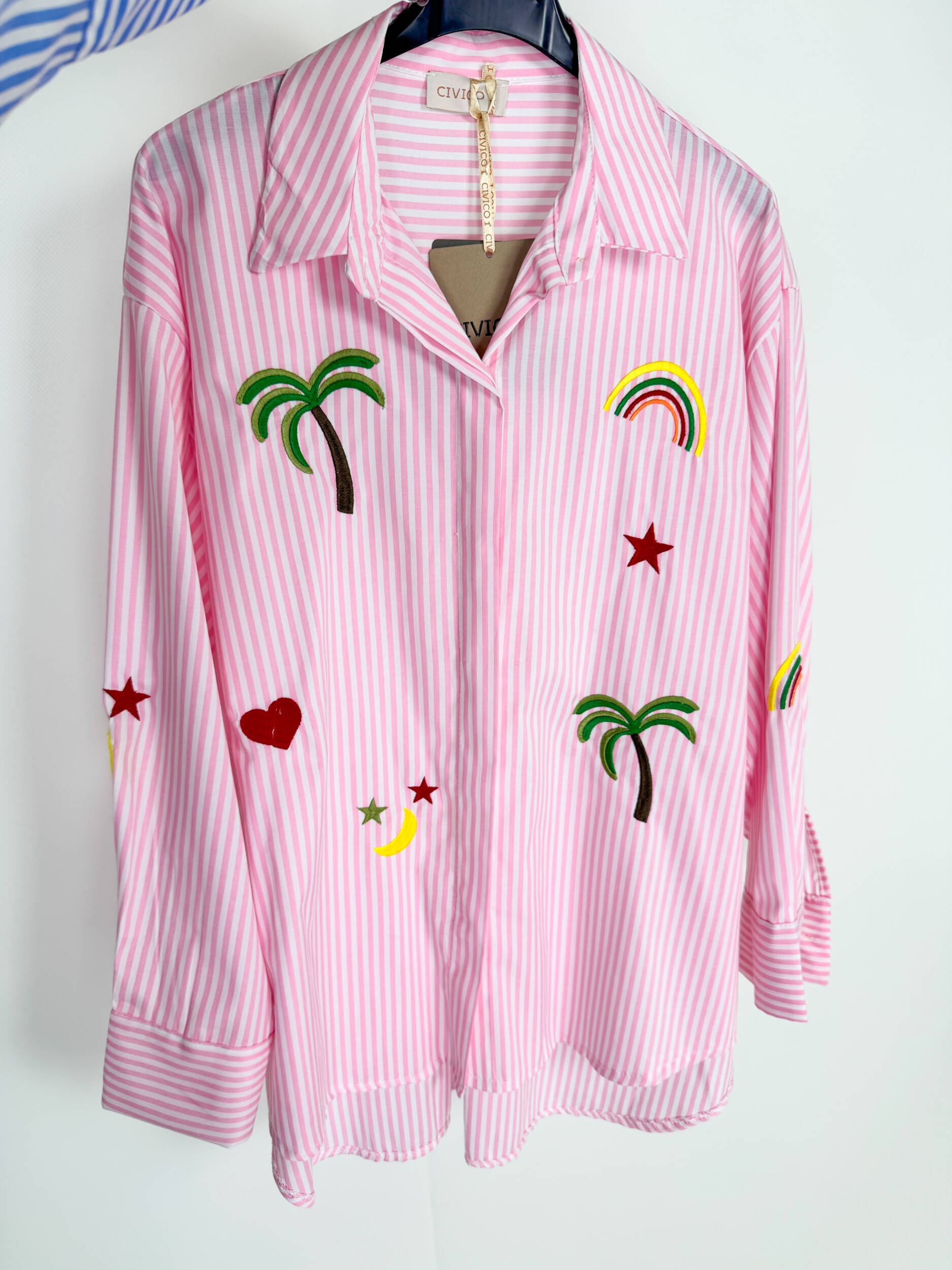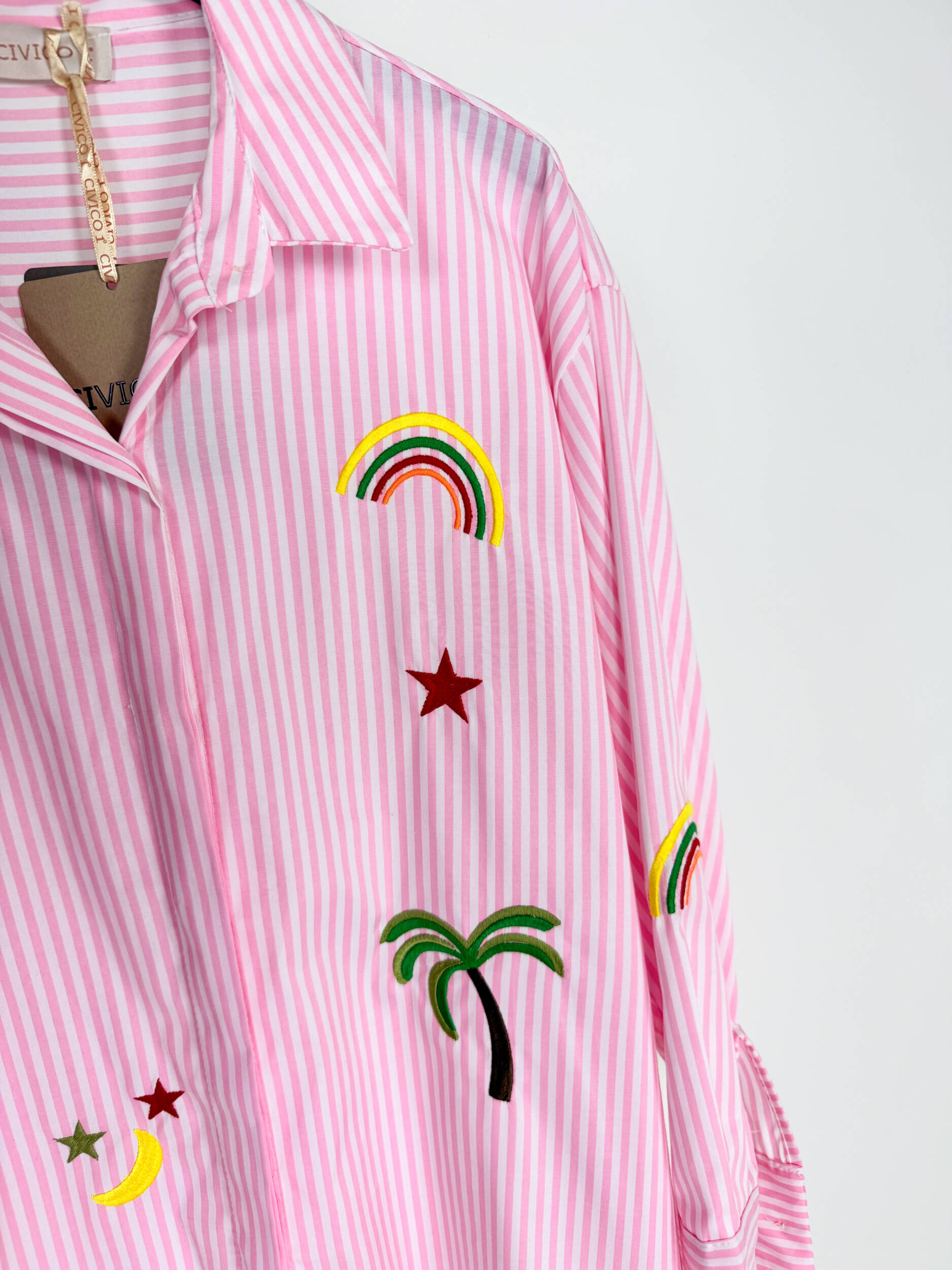 Camicia lemon a righe bianche con simpatici ricami colorati. Più lunga sulla schiena. Ideale con un pantalone bianco o un jeans, per un look casual sbarazzino.