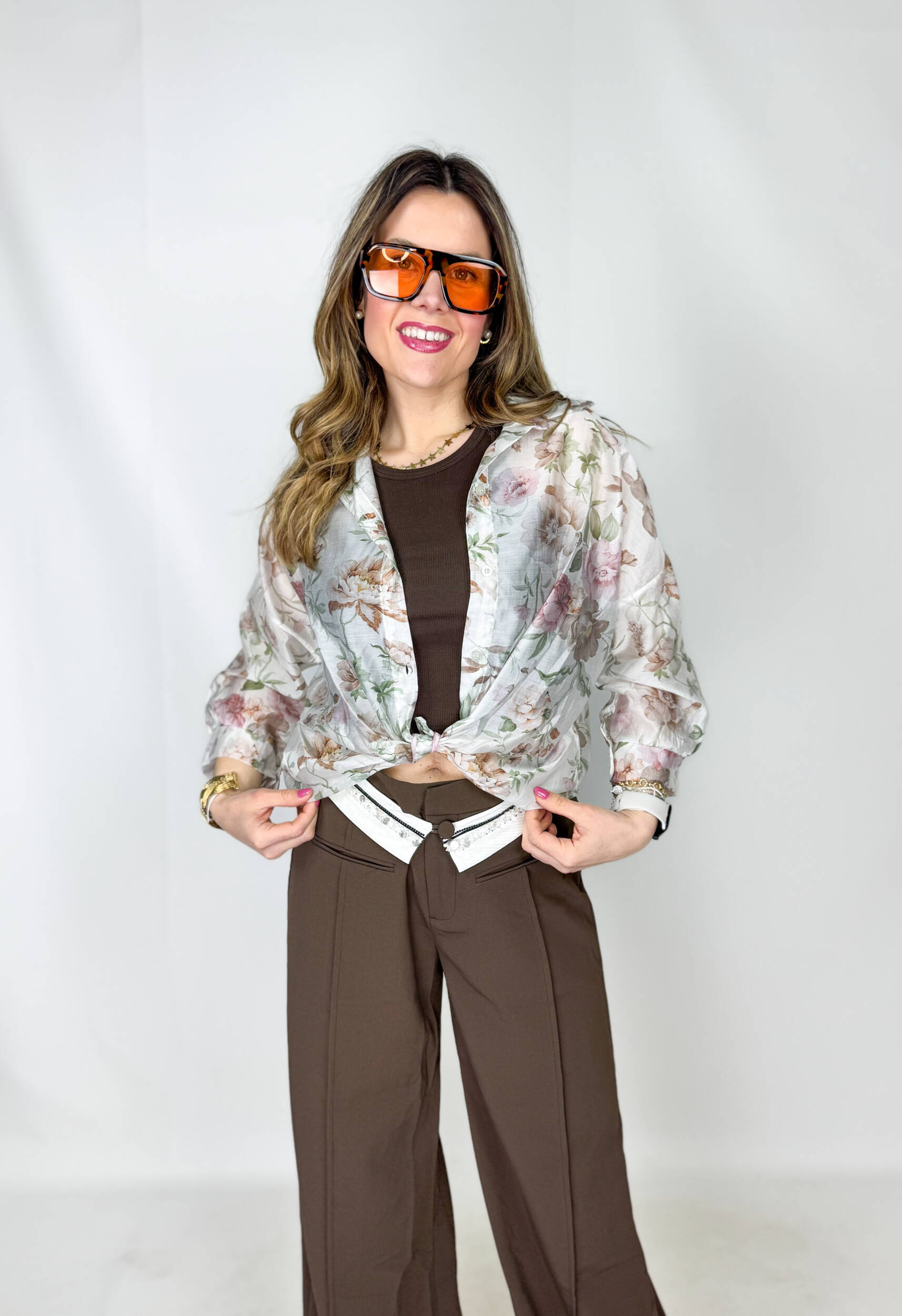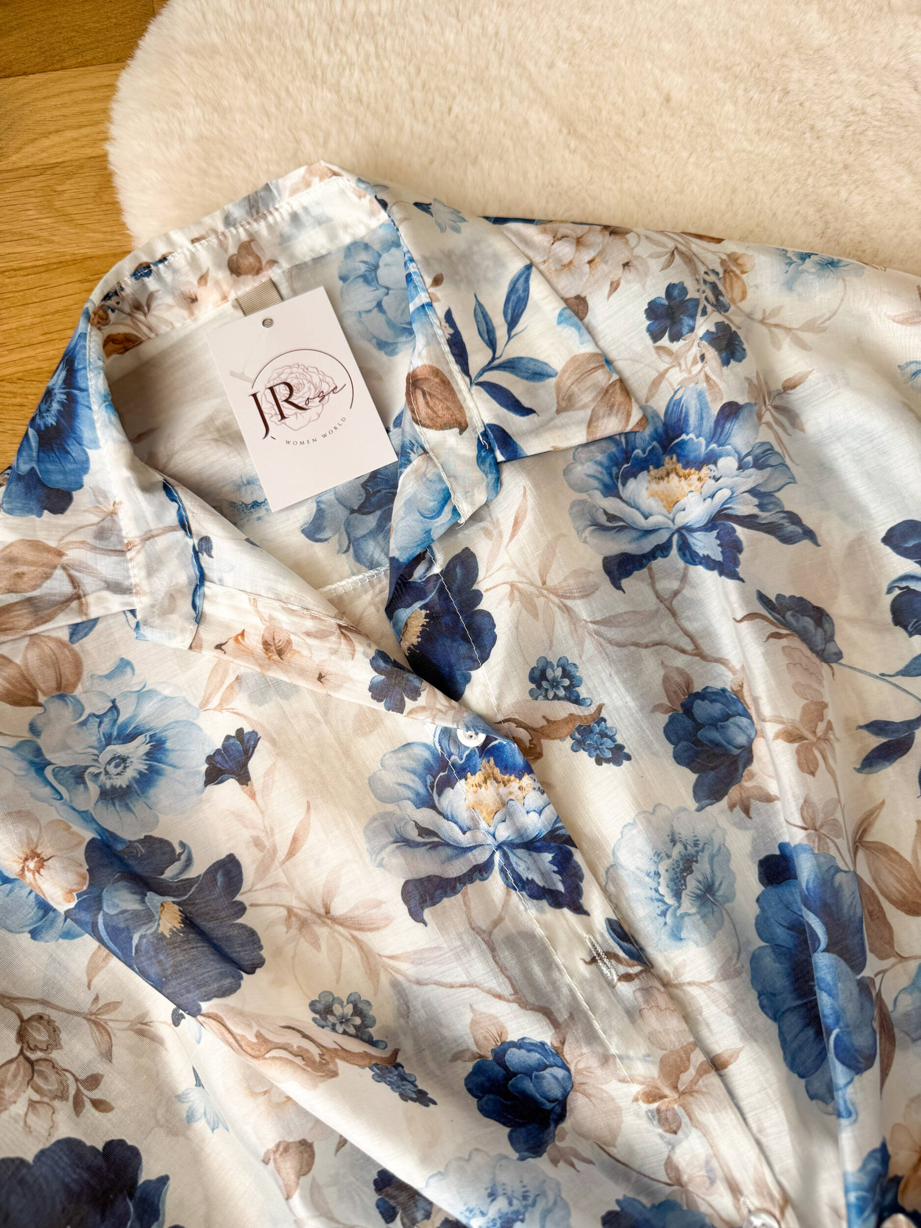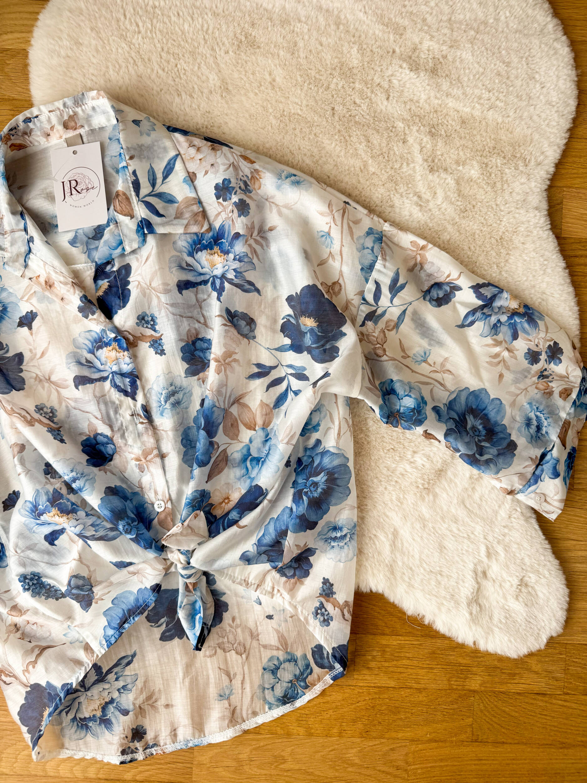 Camicia Lia velata dalla delicata fantasia a fiorellini, leggera e femminile, perfetta per la stagione primaverile. Il tessuto impalpabile accarezza la silhouette, mentre le maniche 3/4 morbide donano movimento e comfort. Versatile e di tendenza, può essere indossata annodata in vita per un look fresco e dinamico, oppure lasciata morbida per un effetto più romantico e rilassato.