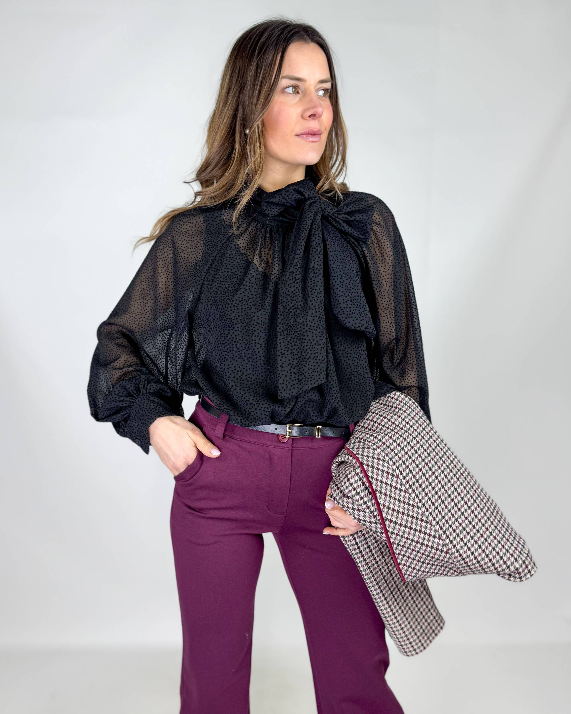 Camicia Maria effetto puntinato con fiocco sul collo a destra.