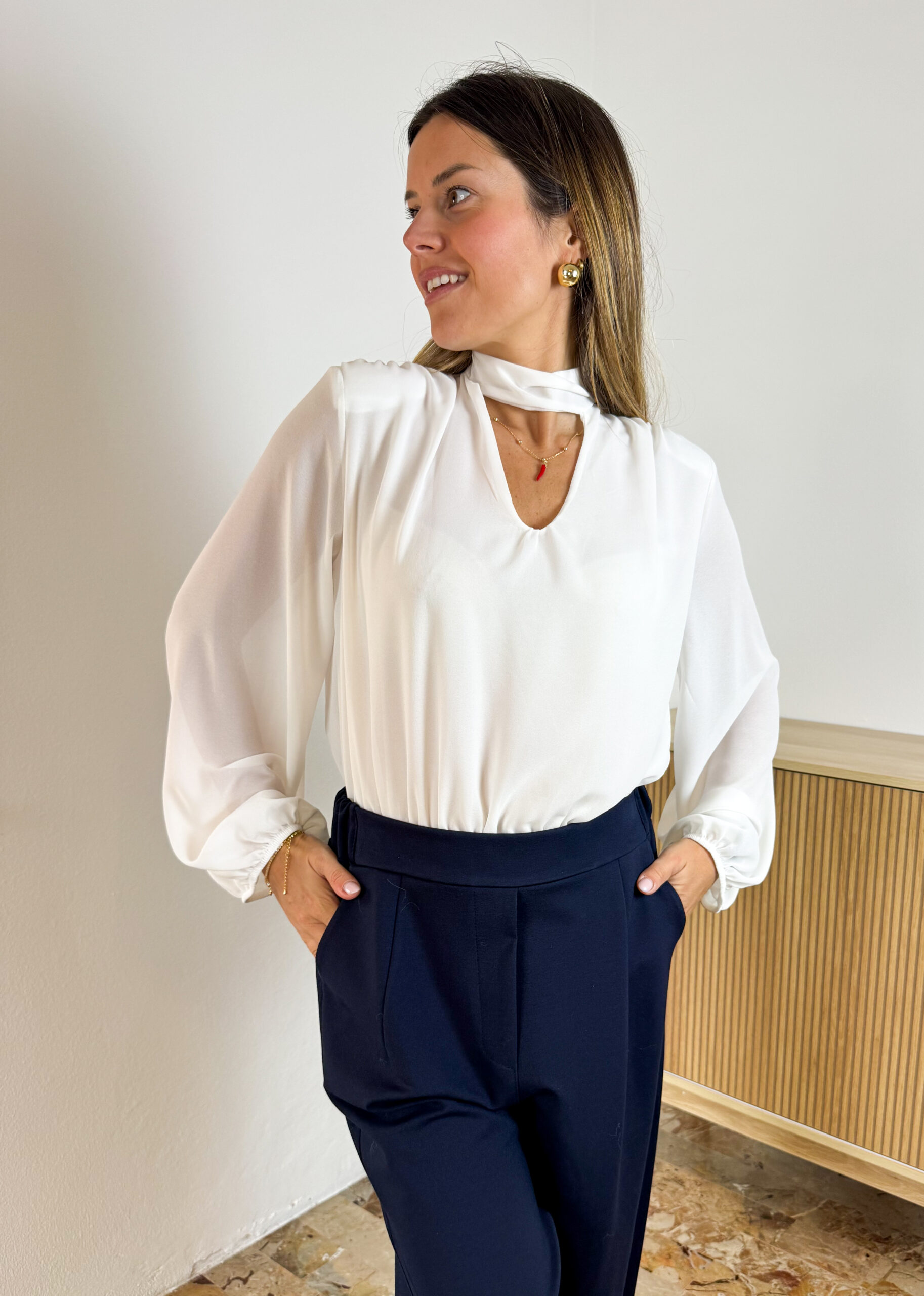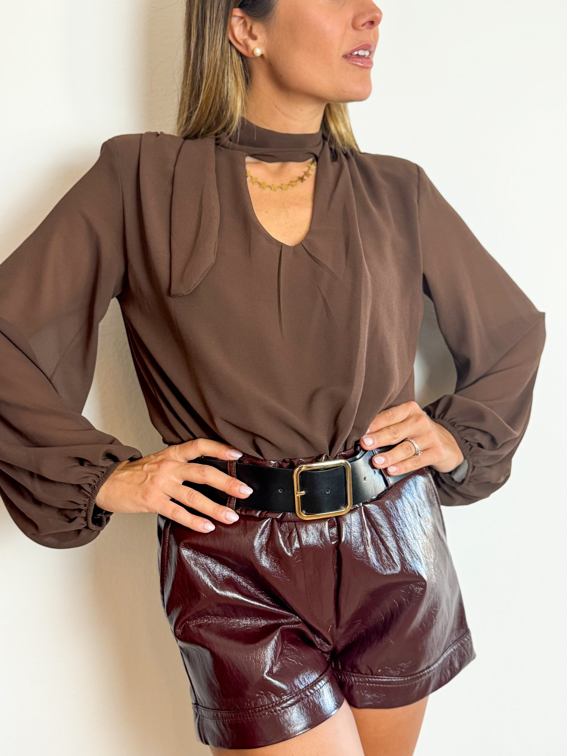 Camicia Sara a body con spalline imbottite e cut out sul petto. Allacciata dietro al collo con apertura sulla schiena a goccia.