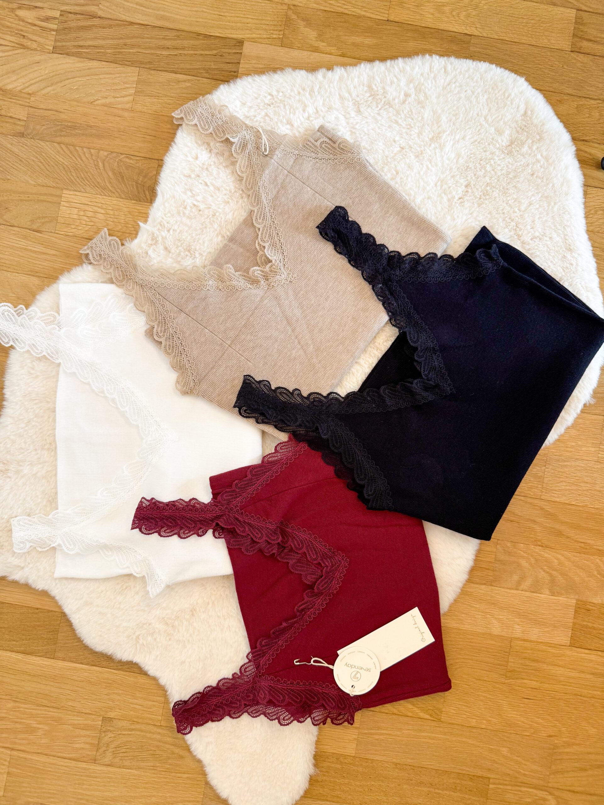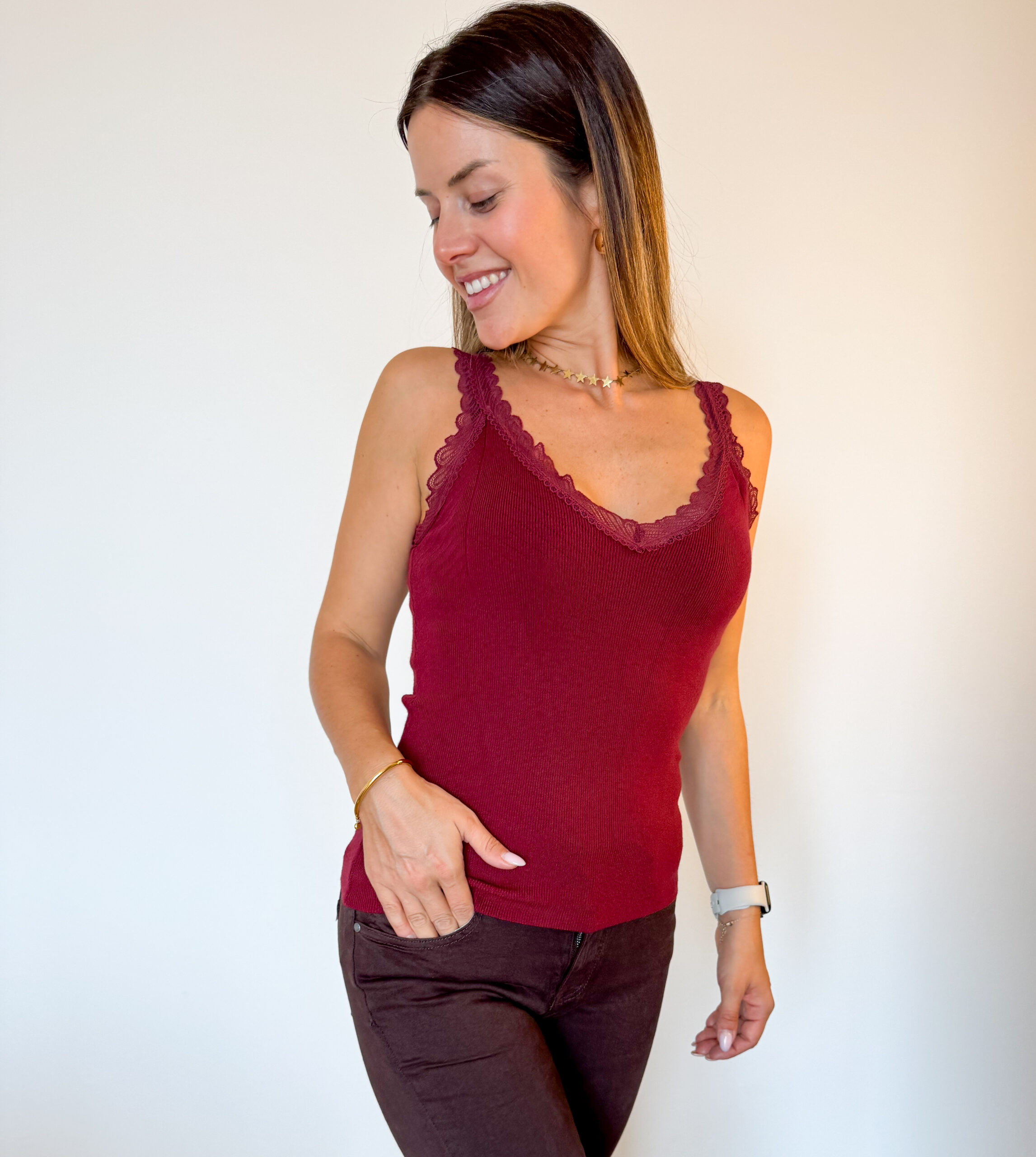 Canotta in Viscosa scollata a V davanti e dietro con pizzo sugli orli. Maglia a costine.