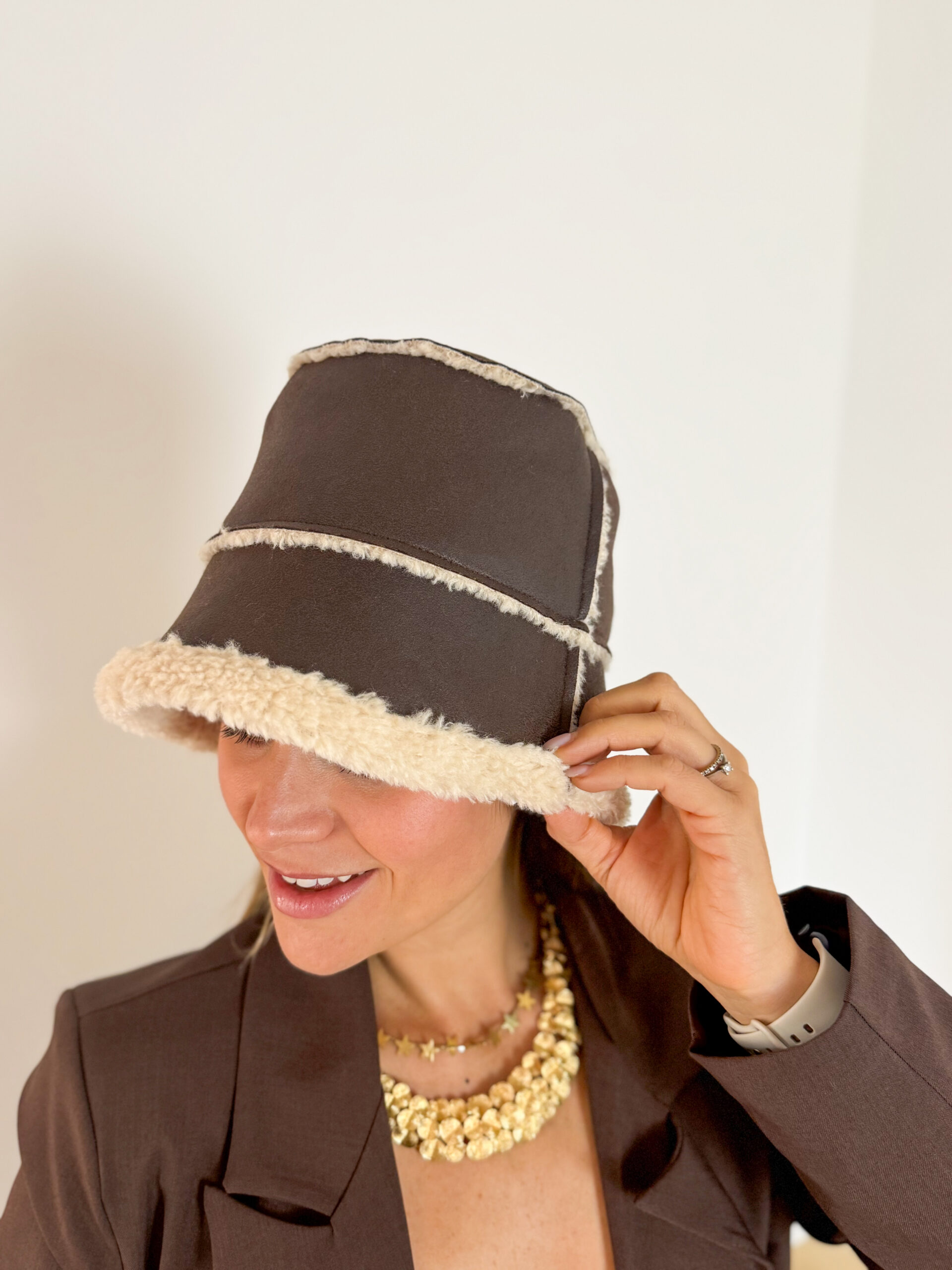 Cappellino Cortina modello pescatore con interno teddy bianco e esterno scamosciato marrone.