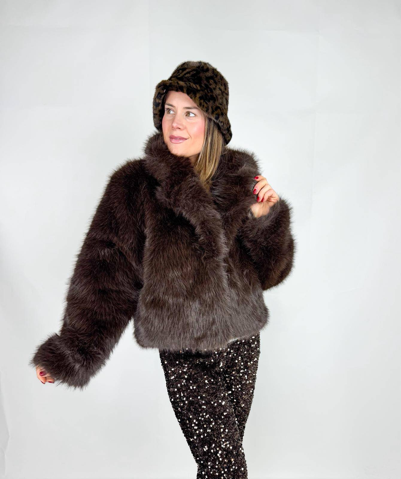 Cappello bucket con finitura morbida al tatto è realizzato in eco pelliccia effetto teddy leopardato.
