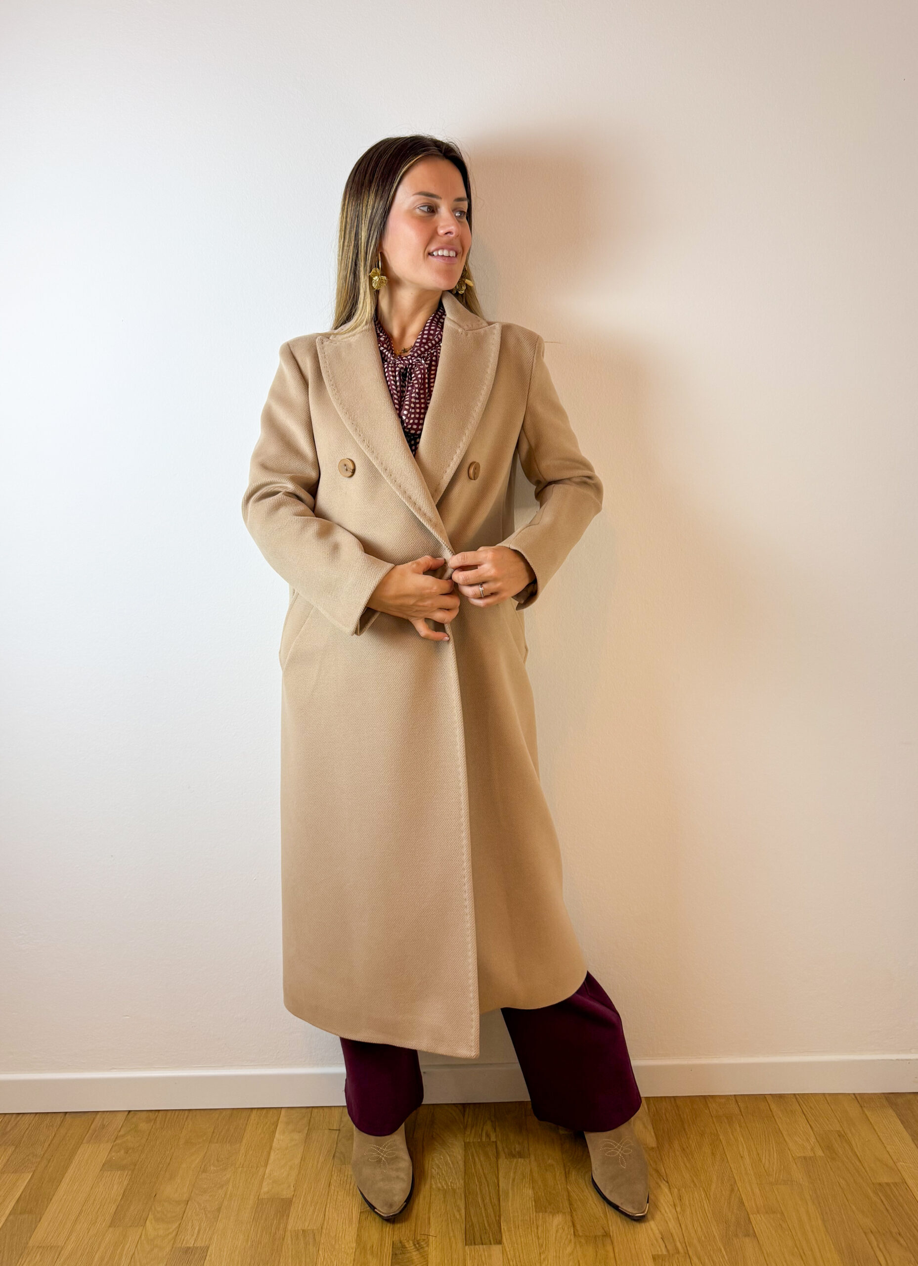 Cappotto doppiopetto soft color cammello vestibilità over. Collo revers. Tasche a filetto sul davanti. Lungo al polpaccio. Con fodera.