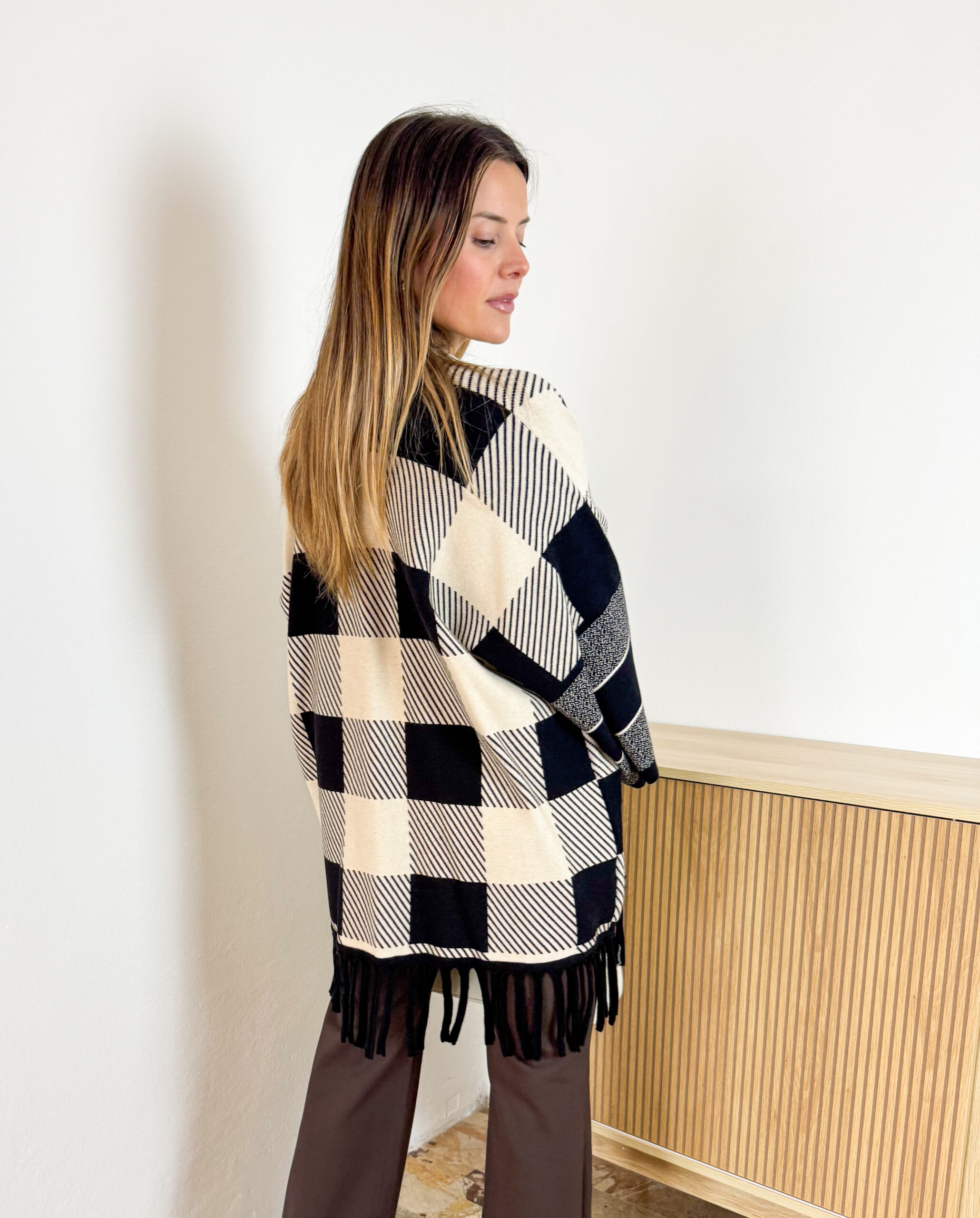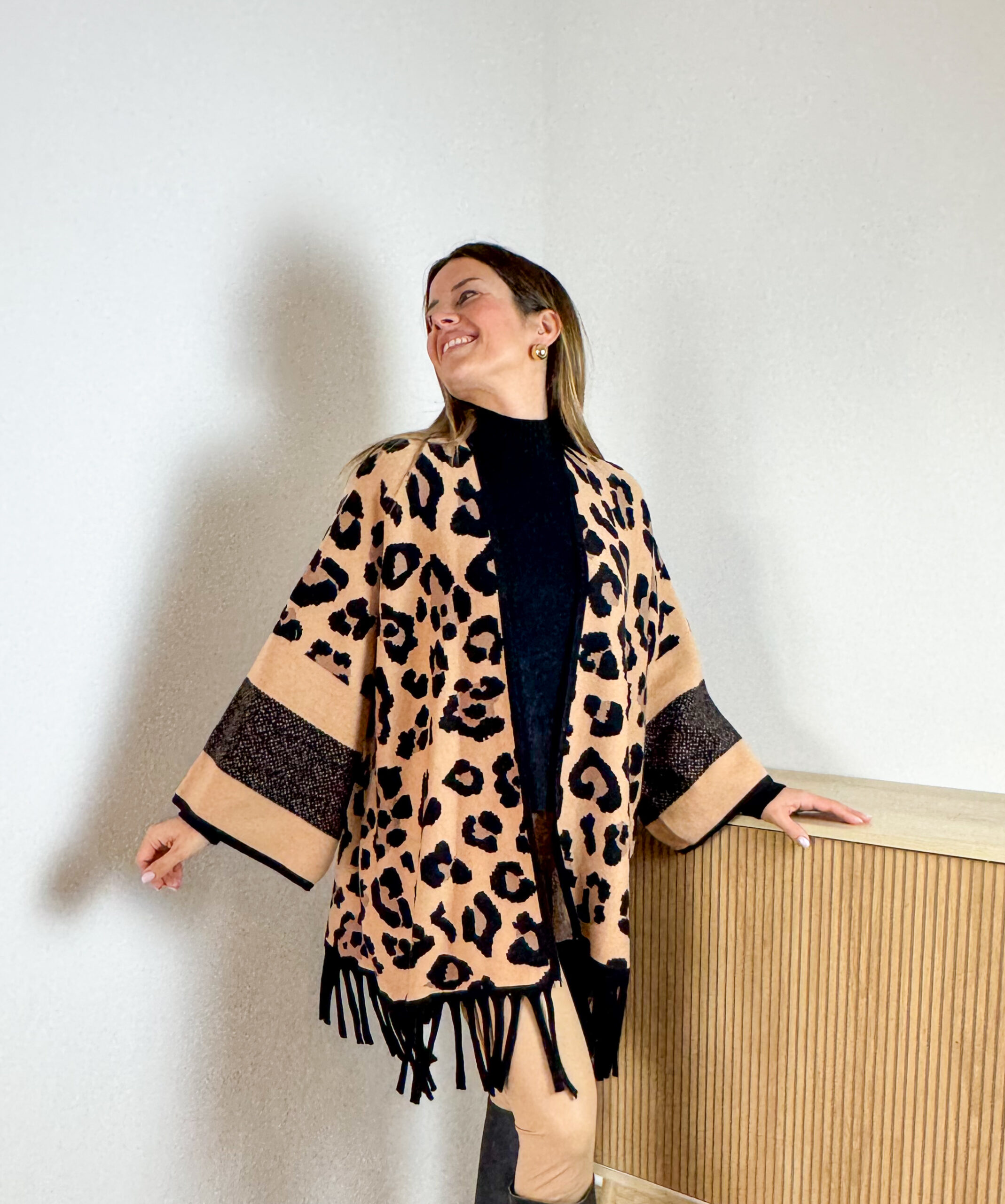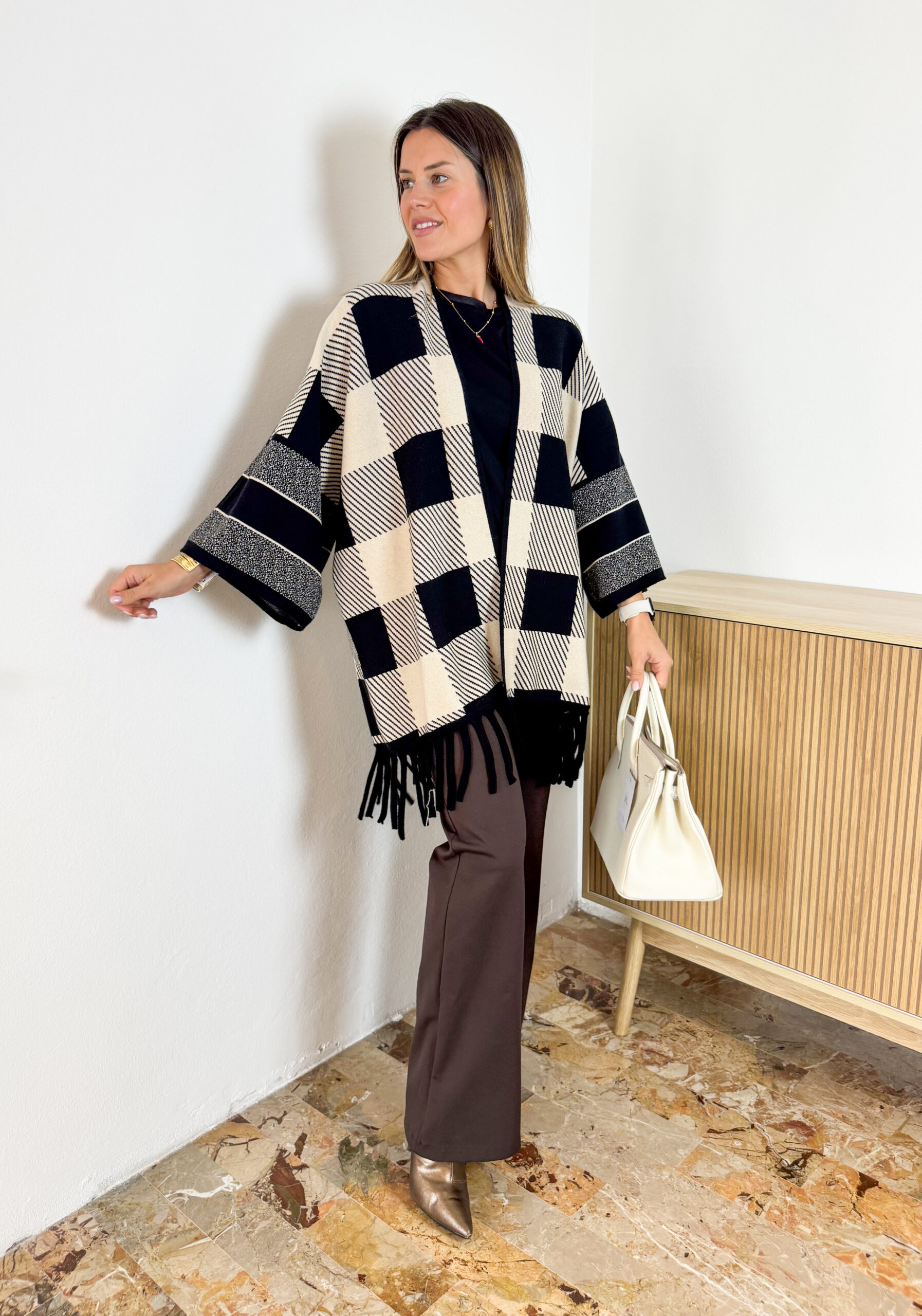 Cardigan Bella in fantasia aperto sul davanti. Maniche ampie. Frange sul fondo.