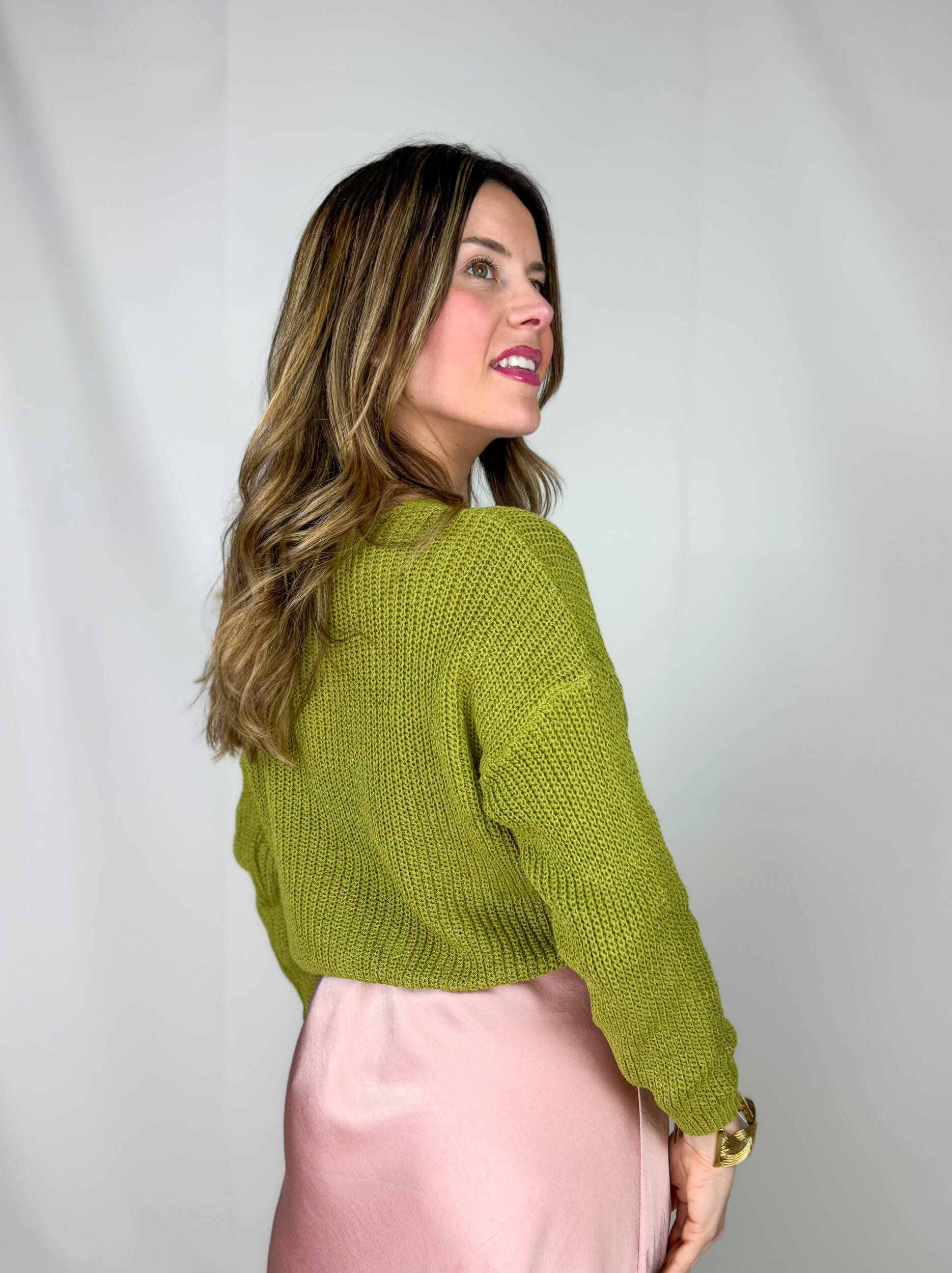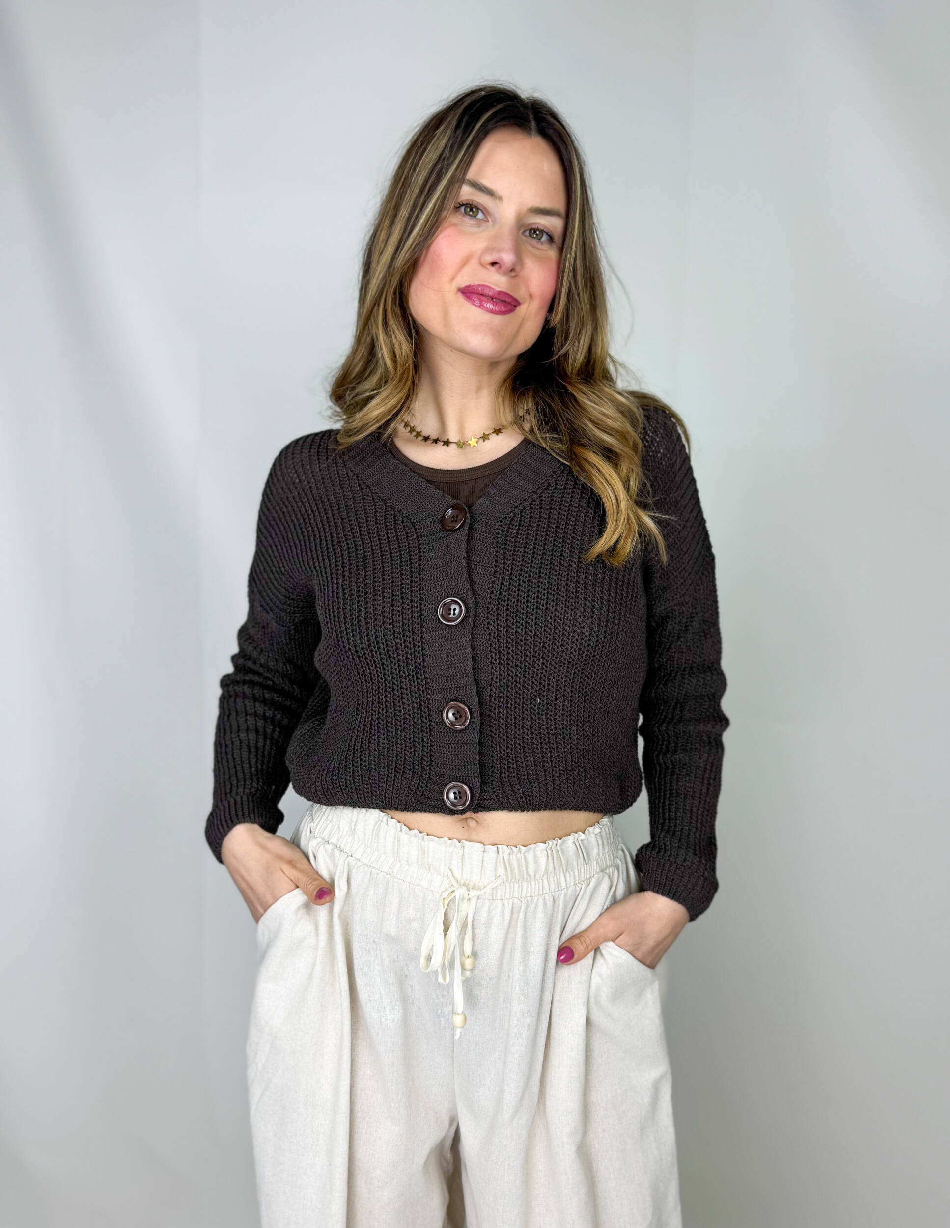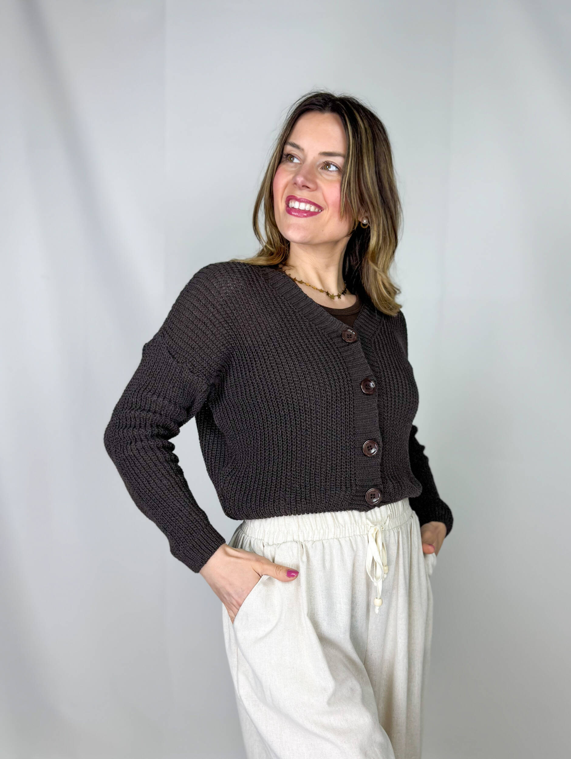 Cardigan Essential in cotone leggero dal taglio crop, perfetto per completare look freschi e femminili. Il design con scollo a V valorizza il décolleté, mentre i bottoni sul davanti aggiungono un dettaglio classico e versatile. Ideale da indossare sopra top e abiti o abbinato a pantaloni e gonne a vita alta, per uno stile semplice ma curato.