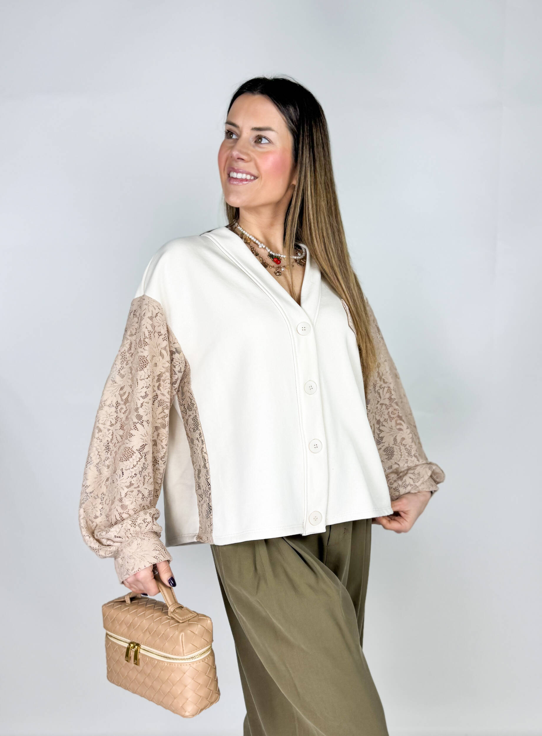 Cardigan Monday color panna in morbida maglia garzata scollato a V e chiuso con bottoni sul davanti. Maniche e profili in pizzo beige. Schiena color beige con simpatica scritta impressa. Finta taschina a filetto in pizzo sul petto. Bello da ufficio o da tempo libero, look casual chic. Abbinalo a pantaloni sartoriali o a jeans.