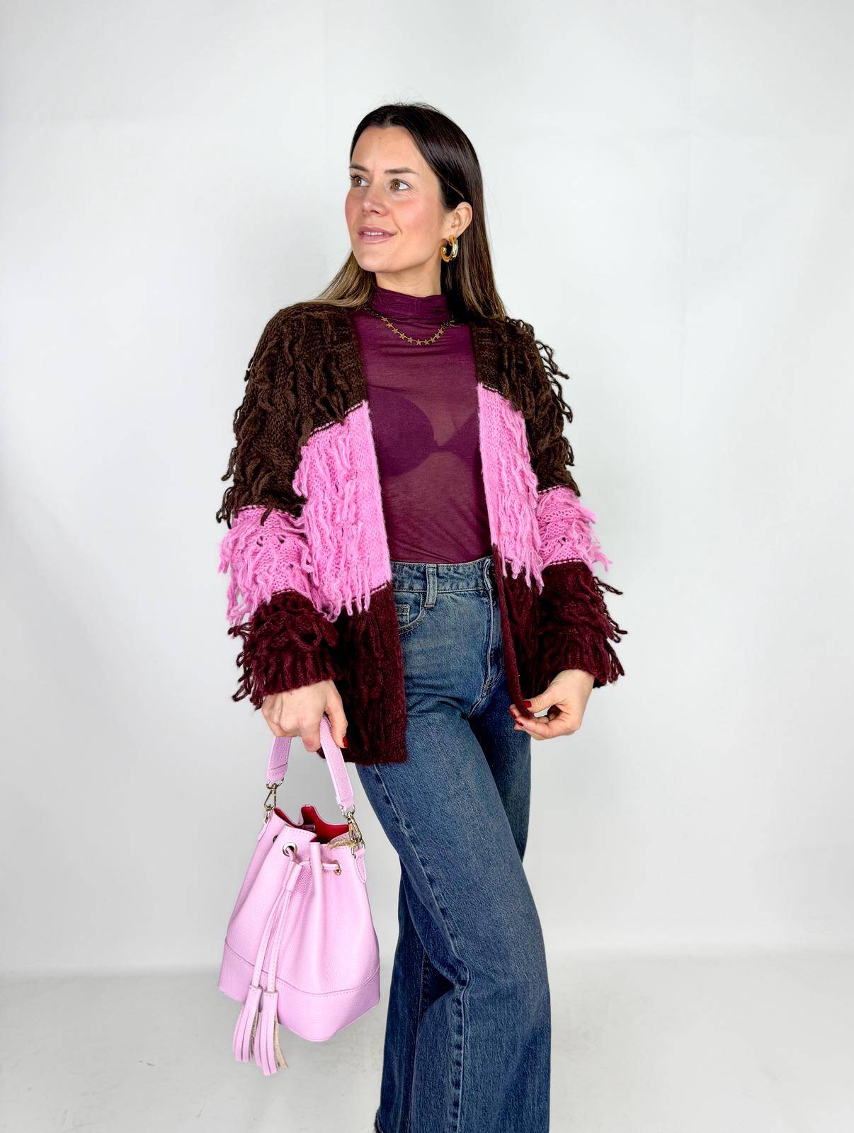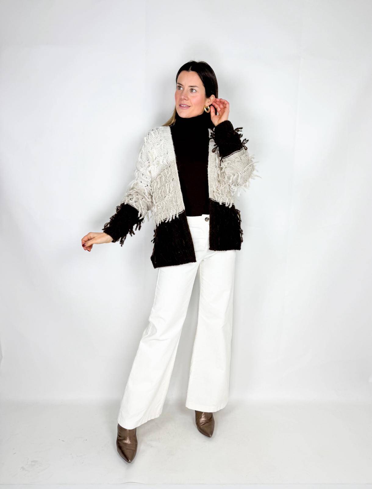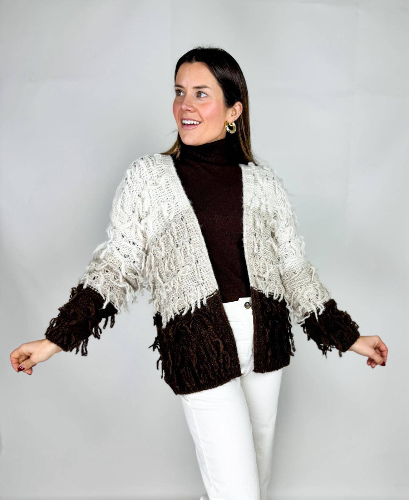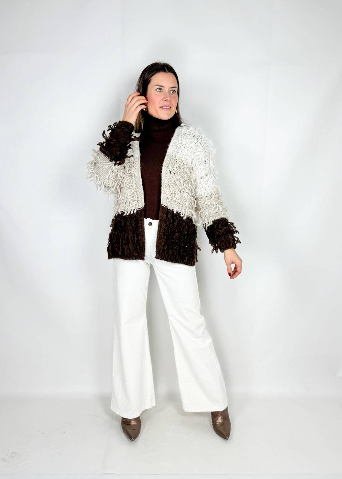 Cardigan Sara, sfrangiato in morbida maglia calda, aperto sul davanti. Vestibilità oversize.
