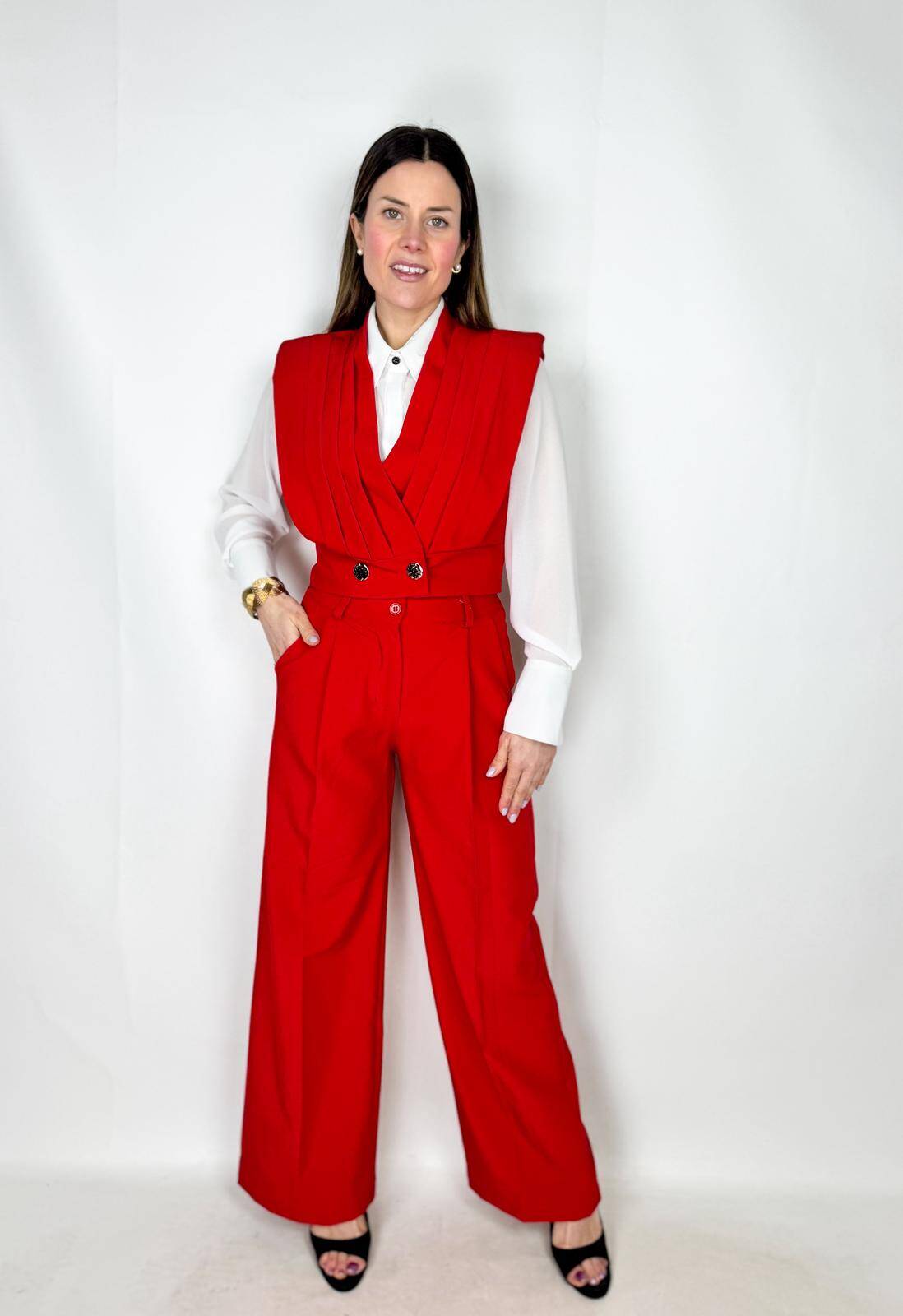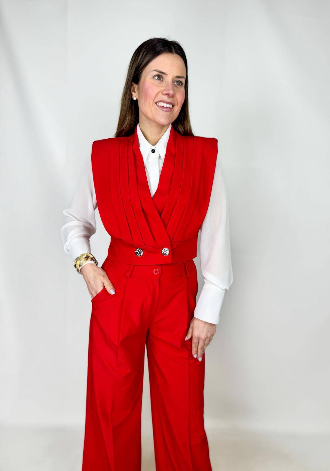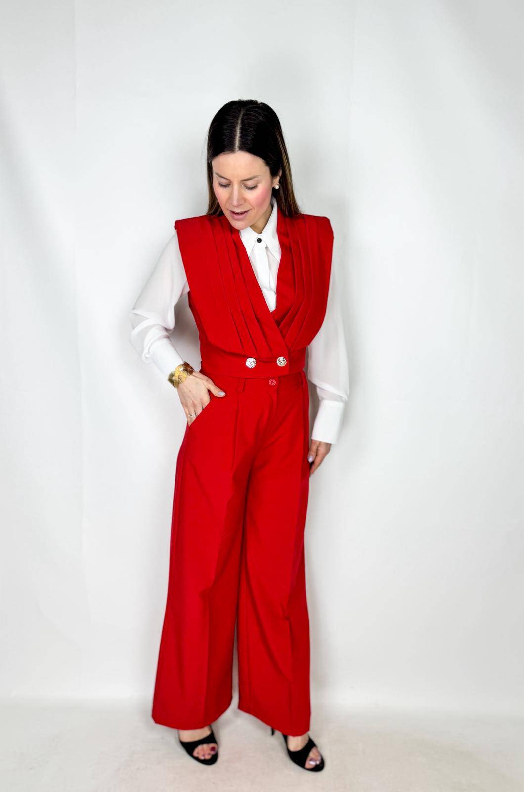 Il gilet doppiopetto, protagonista del look, è caratterizzato da un raffinato drappeggio sul davanti che dona movimento e ricercatezza. I bottoni dorati aggiungono un tocco luminoso e sofisticato, esaltando l’eleganza dell’insieme.
