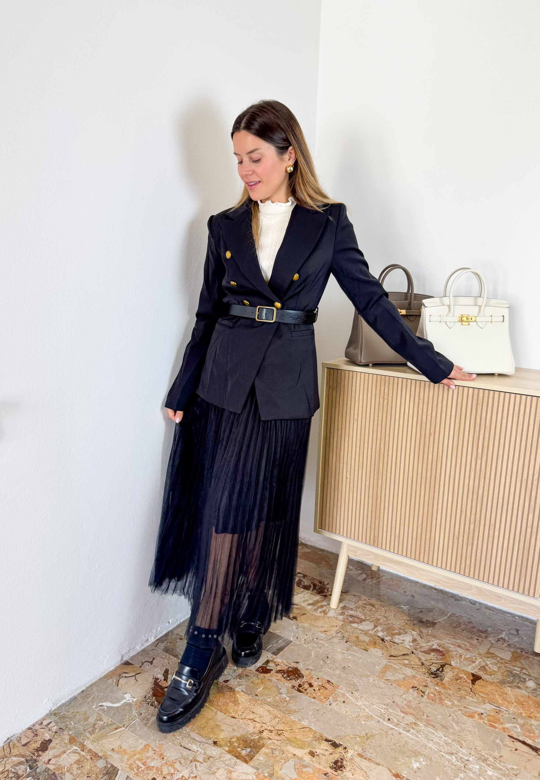 Completo Ivonne composto da gonna plissettata in toulle con sottogonna in cotone. Elasticizzata in vita. Blazer doppiopetto con collo revers, foderato. Cintura inclusa.