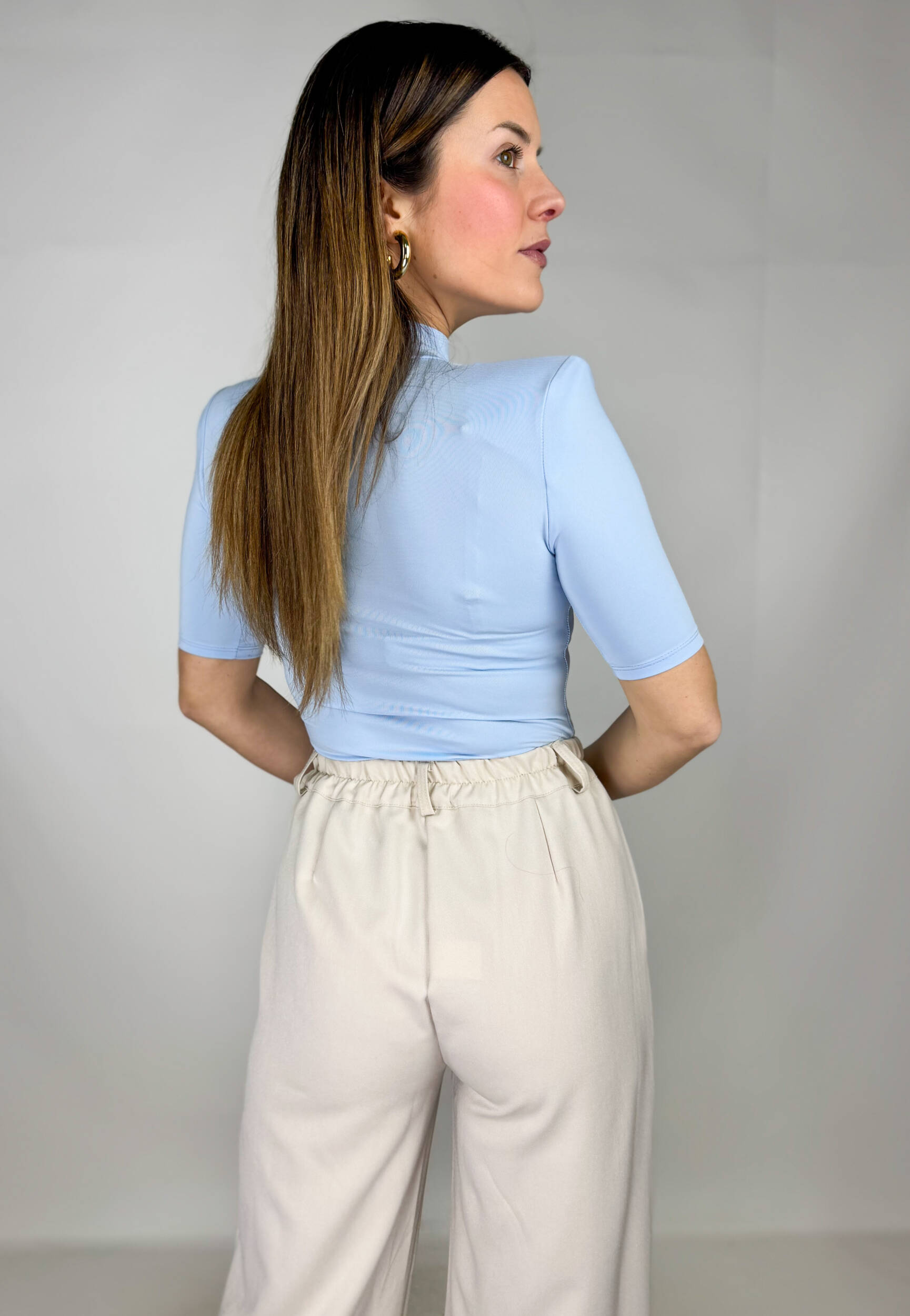 Il pantalone a palazzo completa l’outfit con una linea fluida e sofisticata, allungando otticamente la figura e garantendo comfort e libertà di movimento. Elasticizzato in vita.