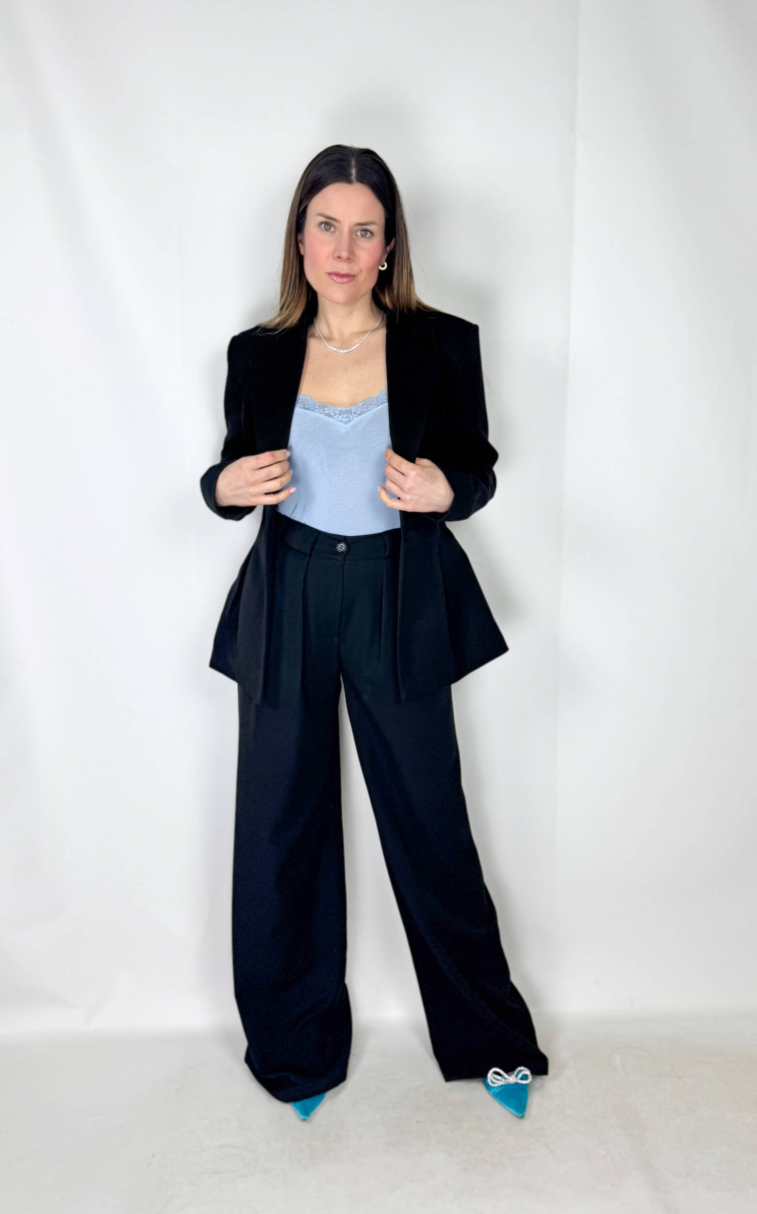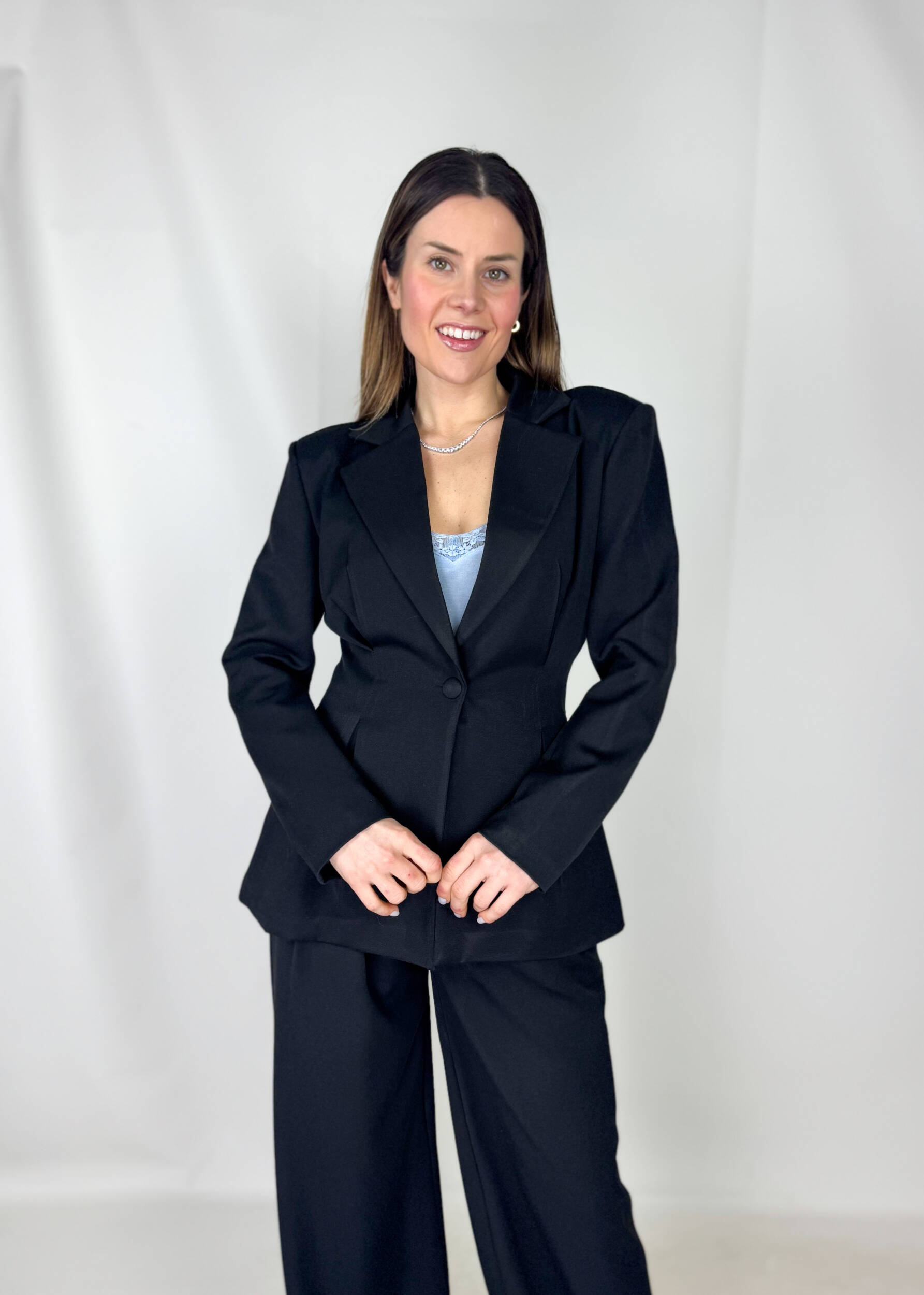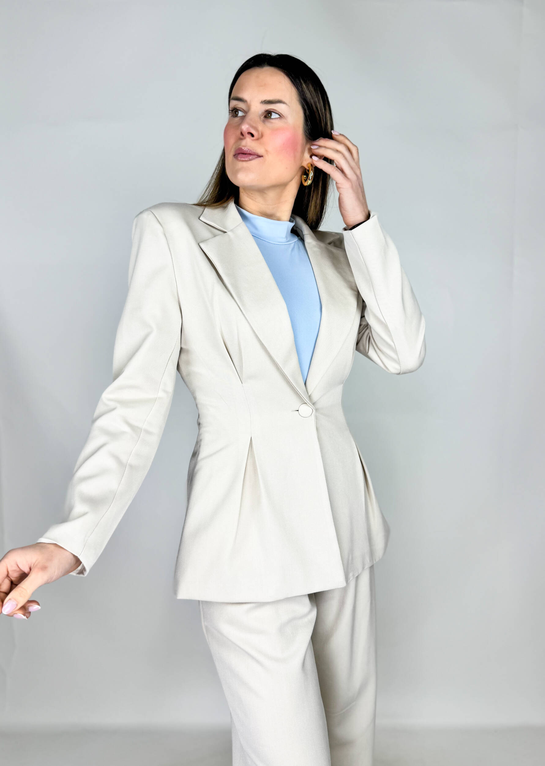 Raffinato, deciso e incredibilmente femminile: questo completo è la scelta perfetta per chi desidera un look elegante ma di forte personalità. Il blazer, impreziosito da pence in vita, valorizza la silhouette creando un effetto slanciato e armonioso, mentre le spalline leggermente pronunciate donano struttura e carattere al design.