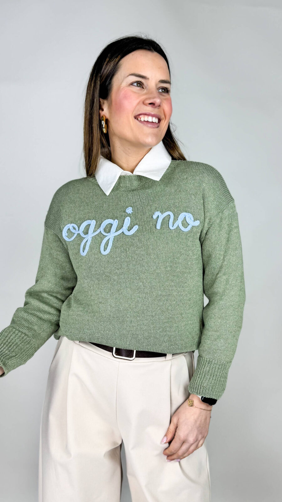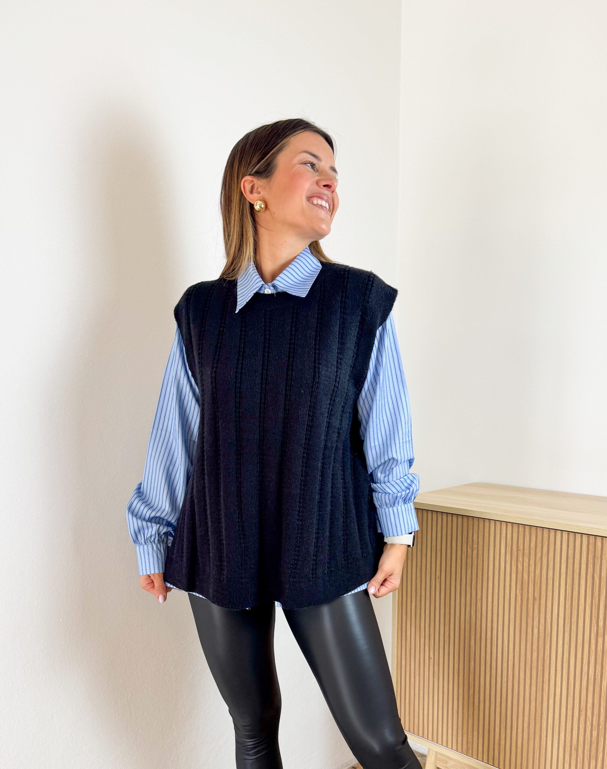 Coordinato College composto da camicia azzurra a righe e gilet girocollo nero in maglia lavorata.