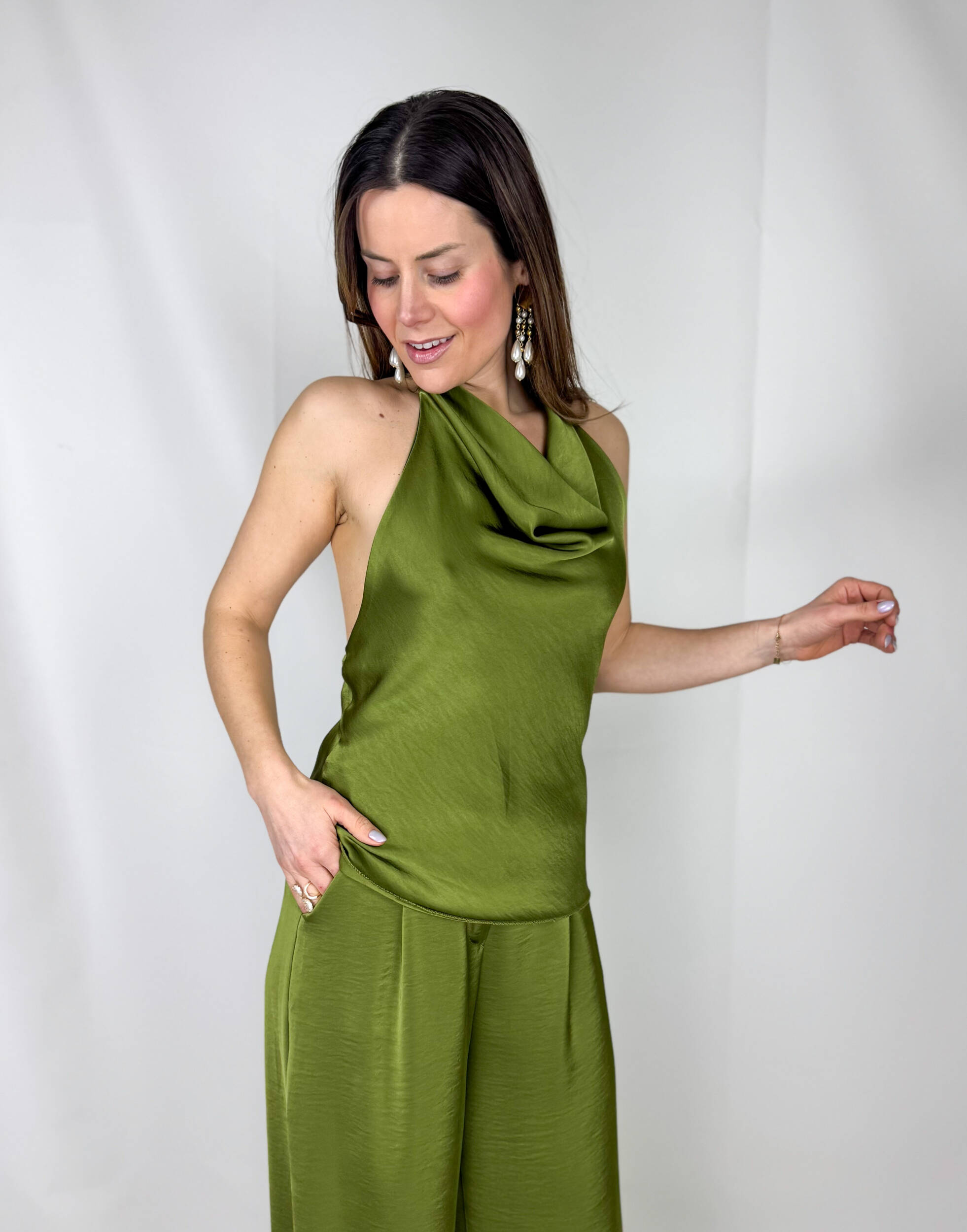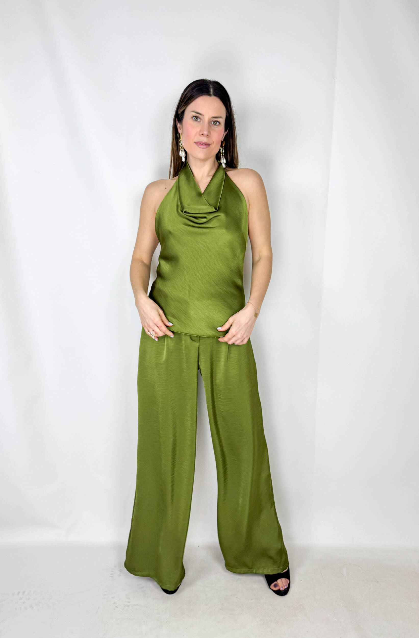 Coordinato Halter perfetto per un look sofisticato e femminile. Questo set è composto da un top modello halter allacciato dietro al collo che valorizza le spalle e lascia la schiena leggermente scoperta, creando una linea elegante e sensuale.