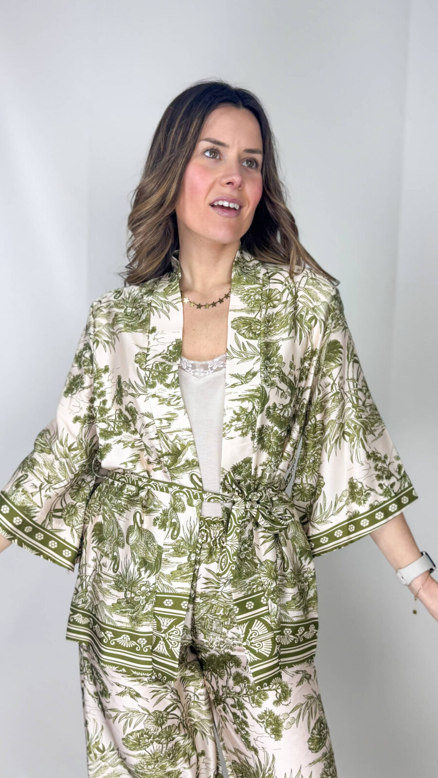 Il top completa il set con un tocco delicato e ricercato: caratterizzato da un elastico arricciato sulla schiena, si adatta perfettamente al corpo esaltando le forme con naturalezza. La balza in pizzo sul fondo aggiunge una nota romantica e sofisticata.