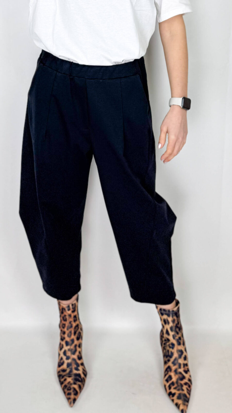 Pantaloni a palazzo con pence in vita e elastico sul retro, che assicurano una vestibilità confortevole e valorizzano la silhouette, unendo eleganza e praticità.