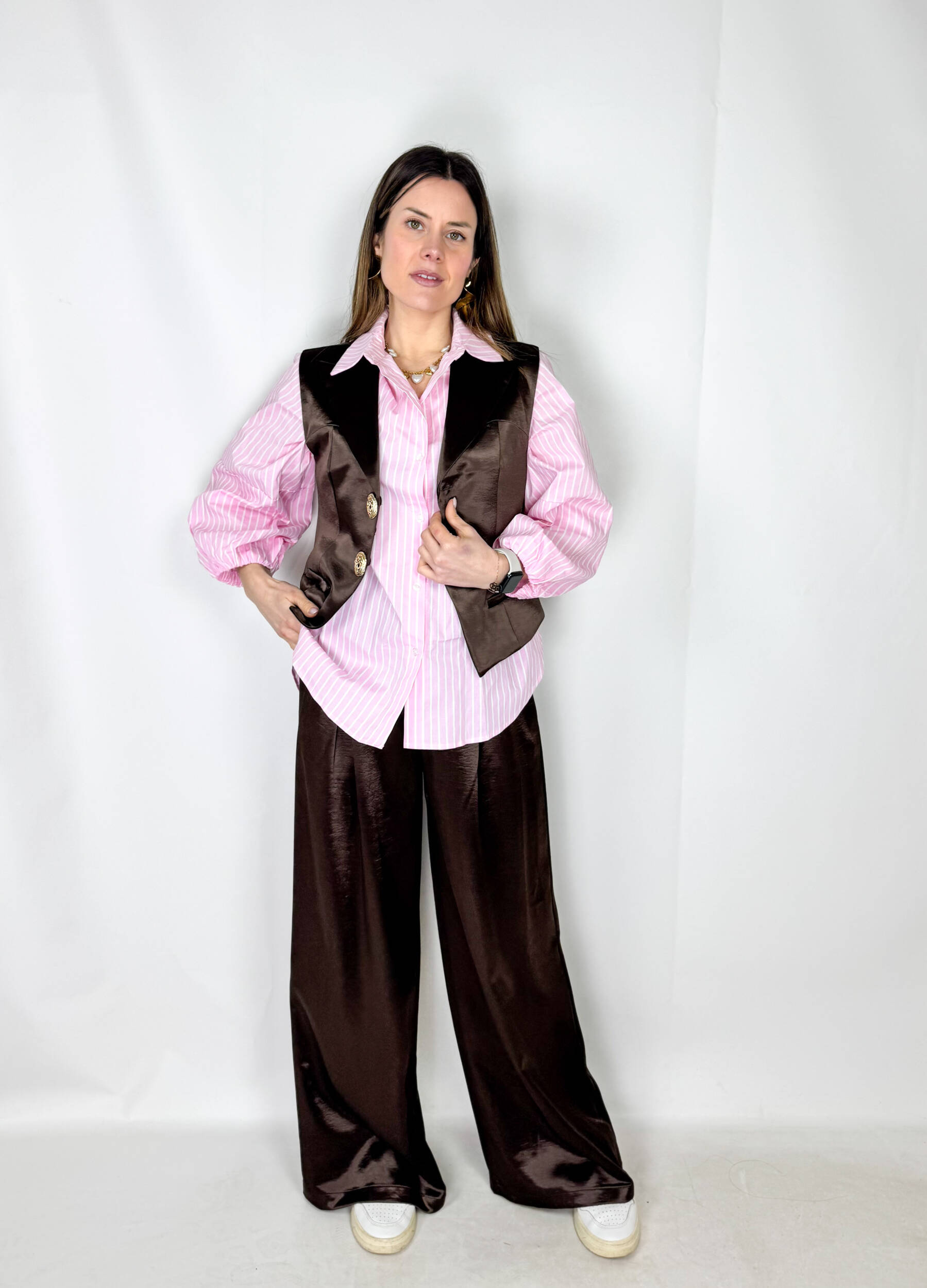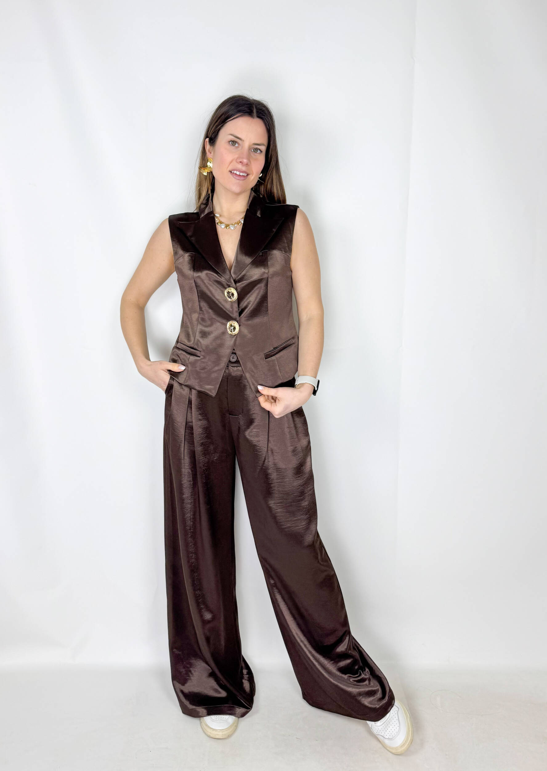 Il tessuto lucido satinato conferisce un effetto raffinato e leggermente brillante, perfetto per chi ama capi di tendenza che uniscono stile e comodità.