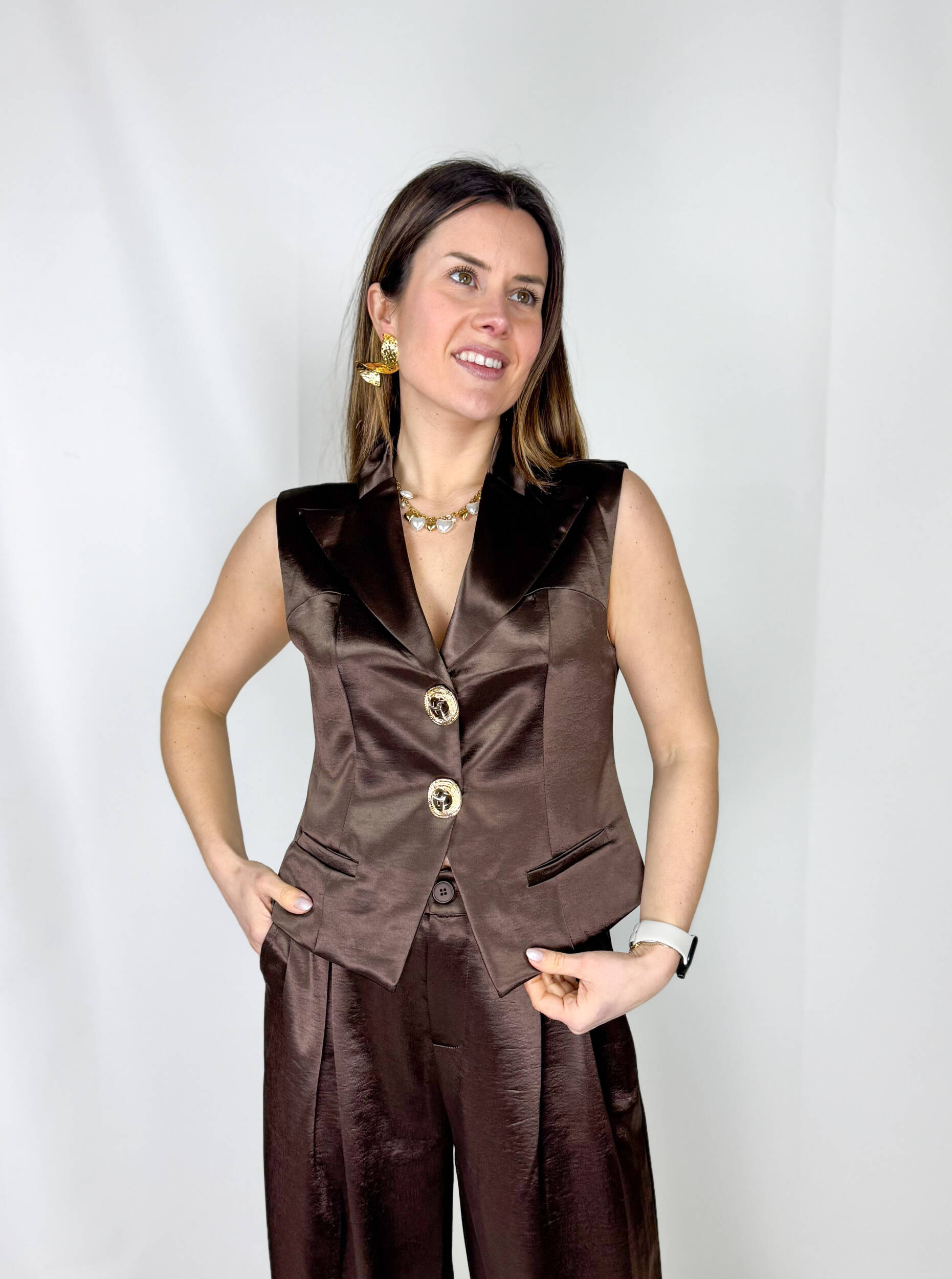 Gilet con tasche a filetto, scollatura a V e bottoni gioiello, dettaglio prezioso che aggiunge luce e raffinatezza al capo, rendendolo ideale anche per occasioni più formali.