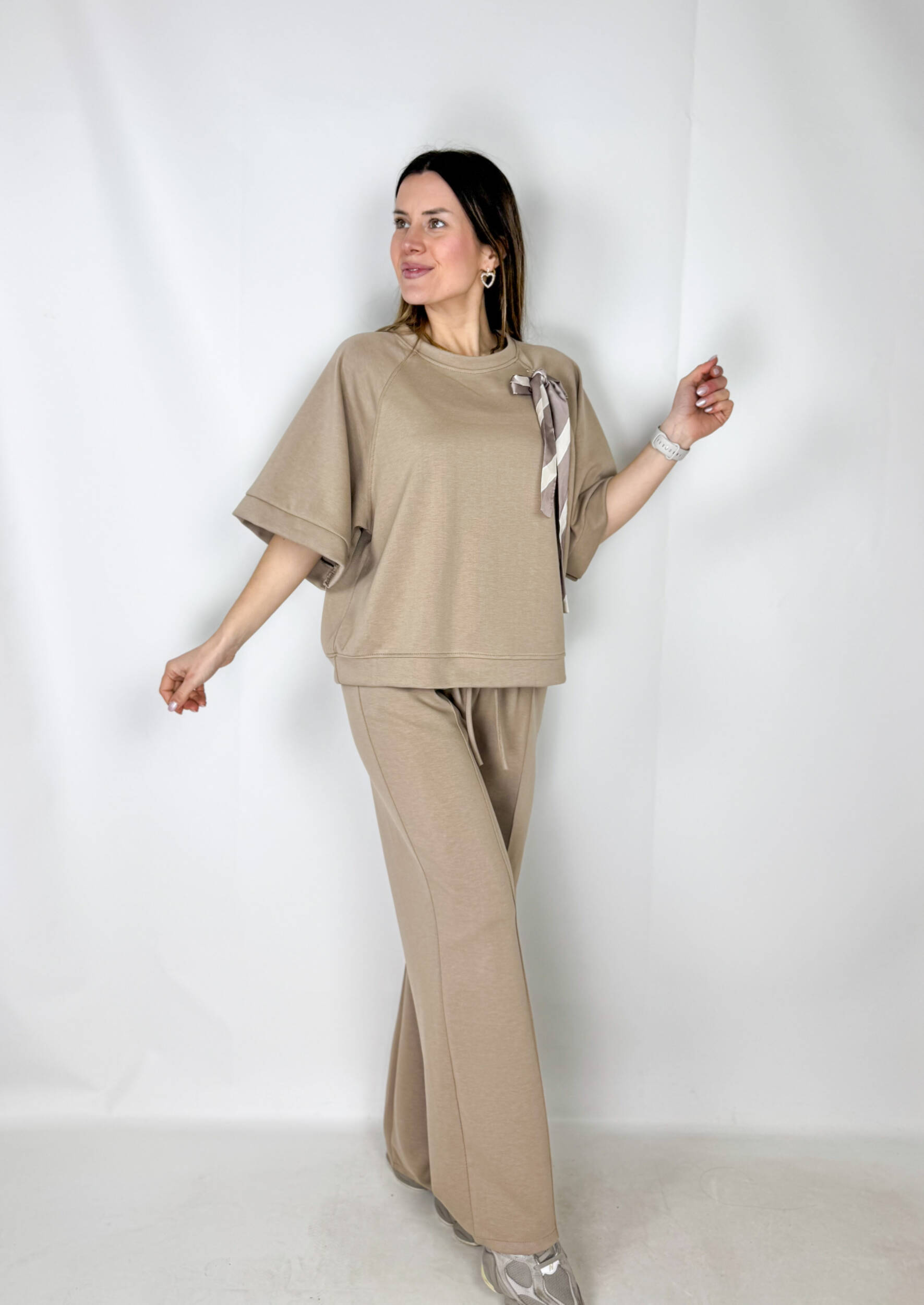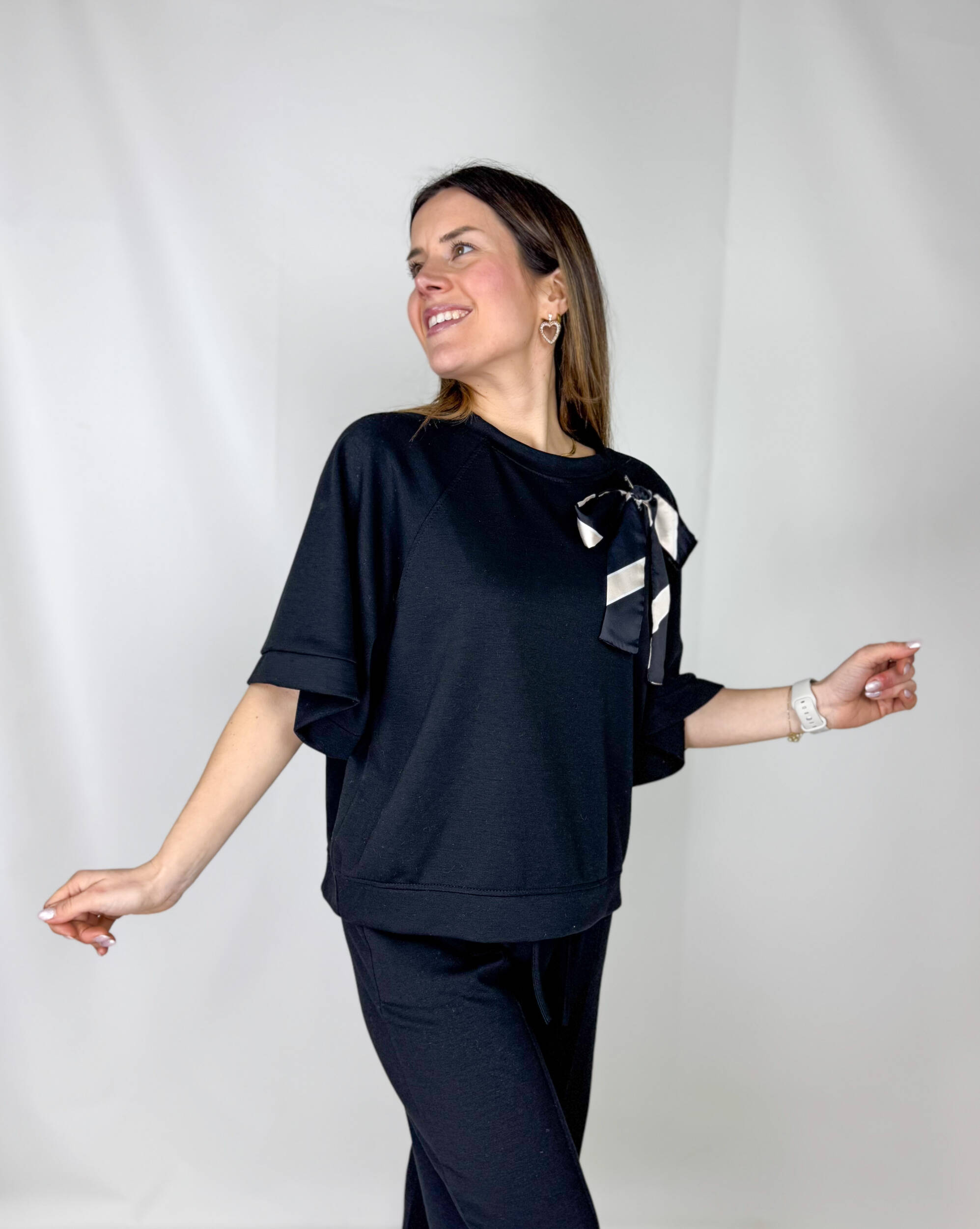 Felpa girocollo comfy con maniche ampie corte, perfetta per un look rilassato ma curato, impreziosita da una spilla con fiocco sul petto che aggiunge un dettaglio femminile e originale.