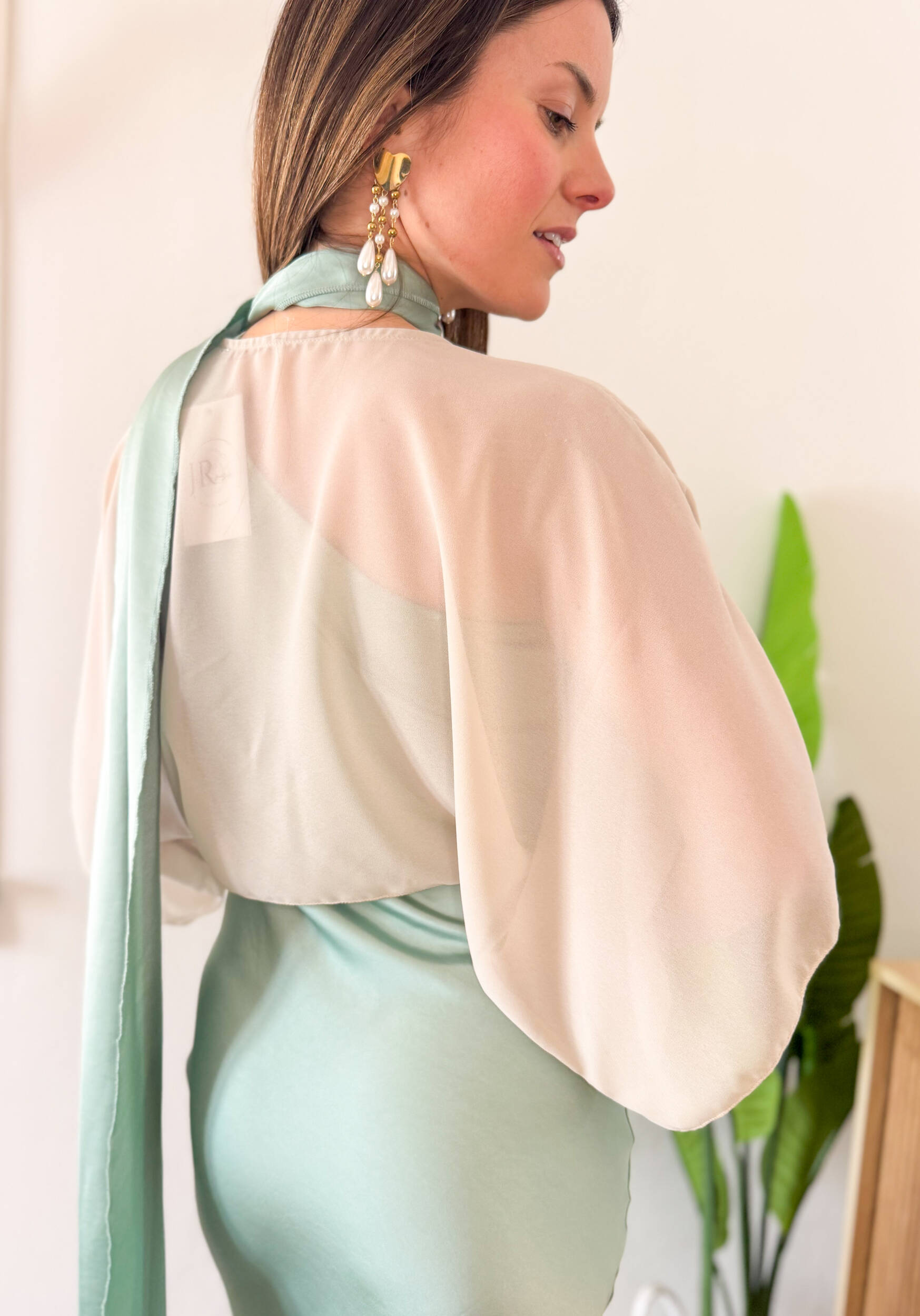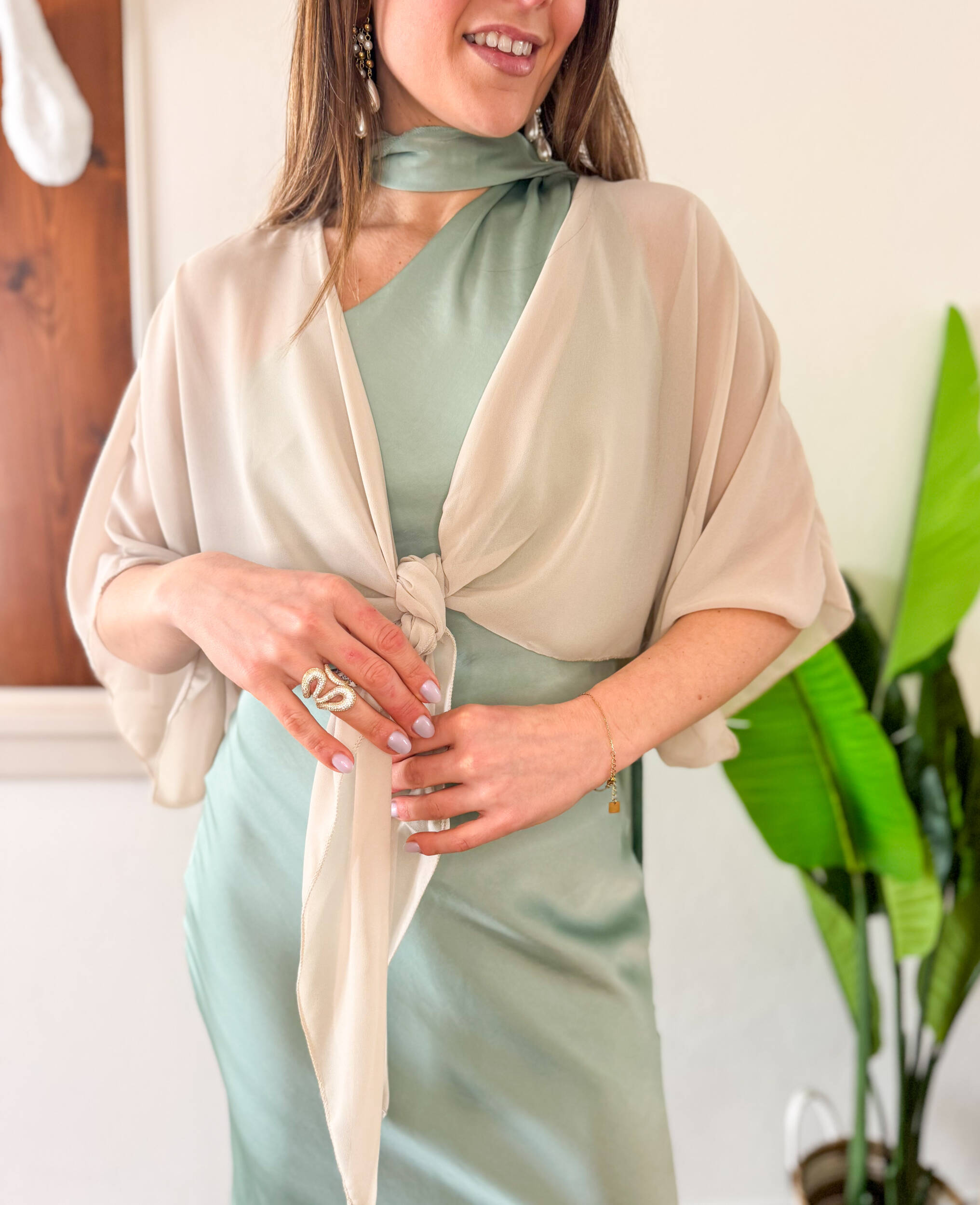 Coprispalle Grace elegante in tessuto leggero e velato, perfetto per completare abiti da cerimonia con un tocco di raffinatezza. Il modello si allaccia delicatamente sul petto, creando un effetto morbido e femminile. Le maniche corte ampie donano movimento e leggerezza, rendendolo ideale da indossare sopra abiti eleganti durante cerimonie ed eventi speciali.