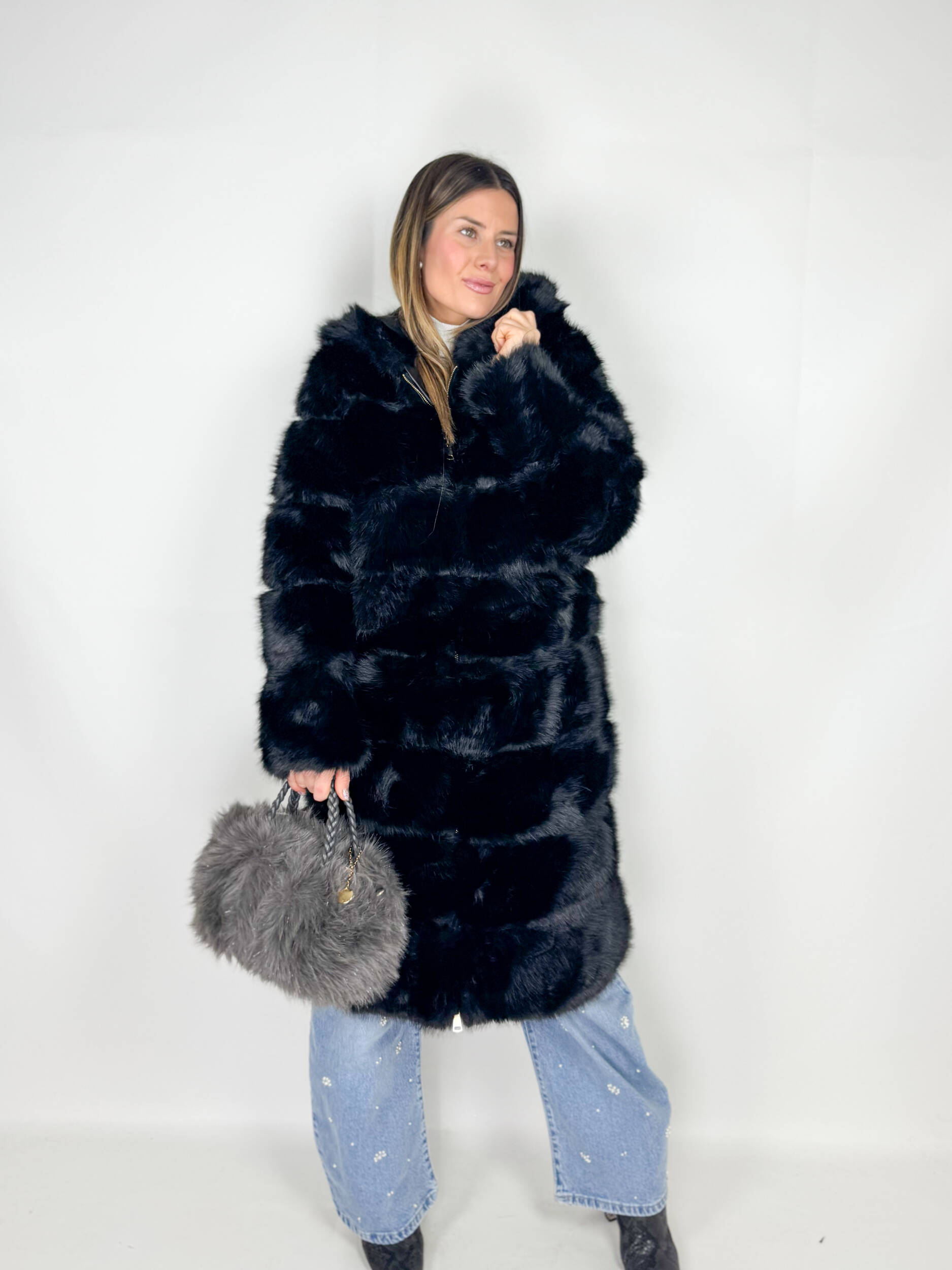 Giacca Aspen in morbida pelliccia ecologica nera lunga al ginocchio. Con cappuccio. Chiusa con zip sul davanti. La fodera interna non fa passare aria, pesantezza invernale.