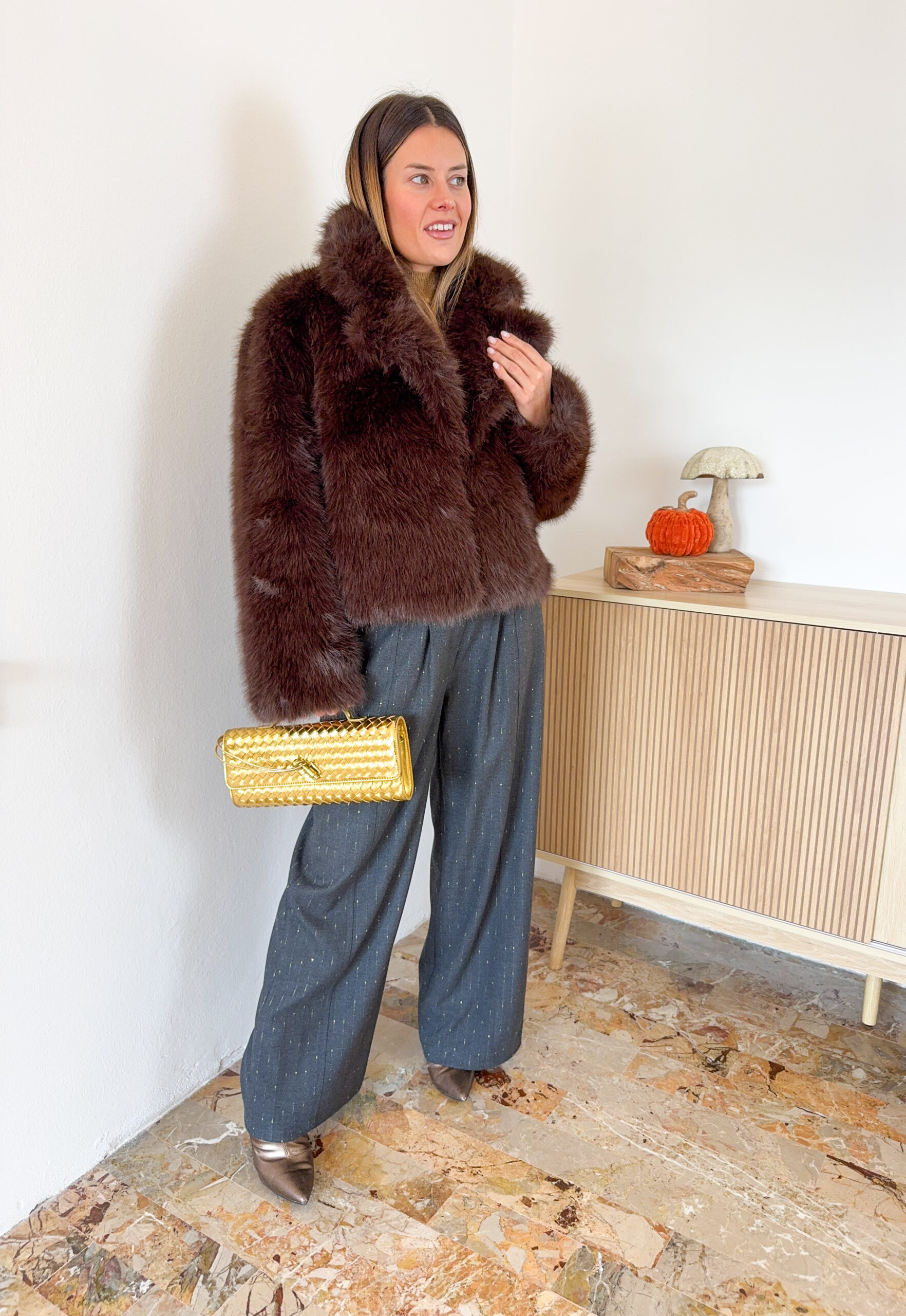 Giacca Ecopelliccia Brown con collo revers, chiusa con gancetto sul davanti. Con tasche.