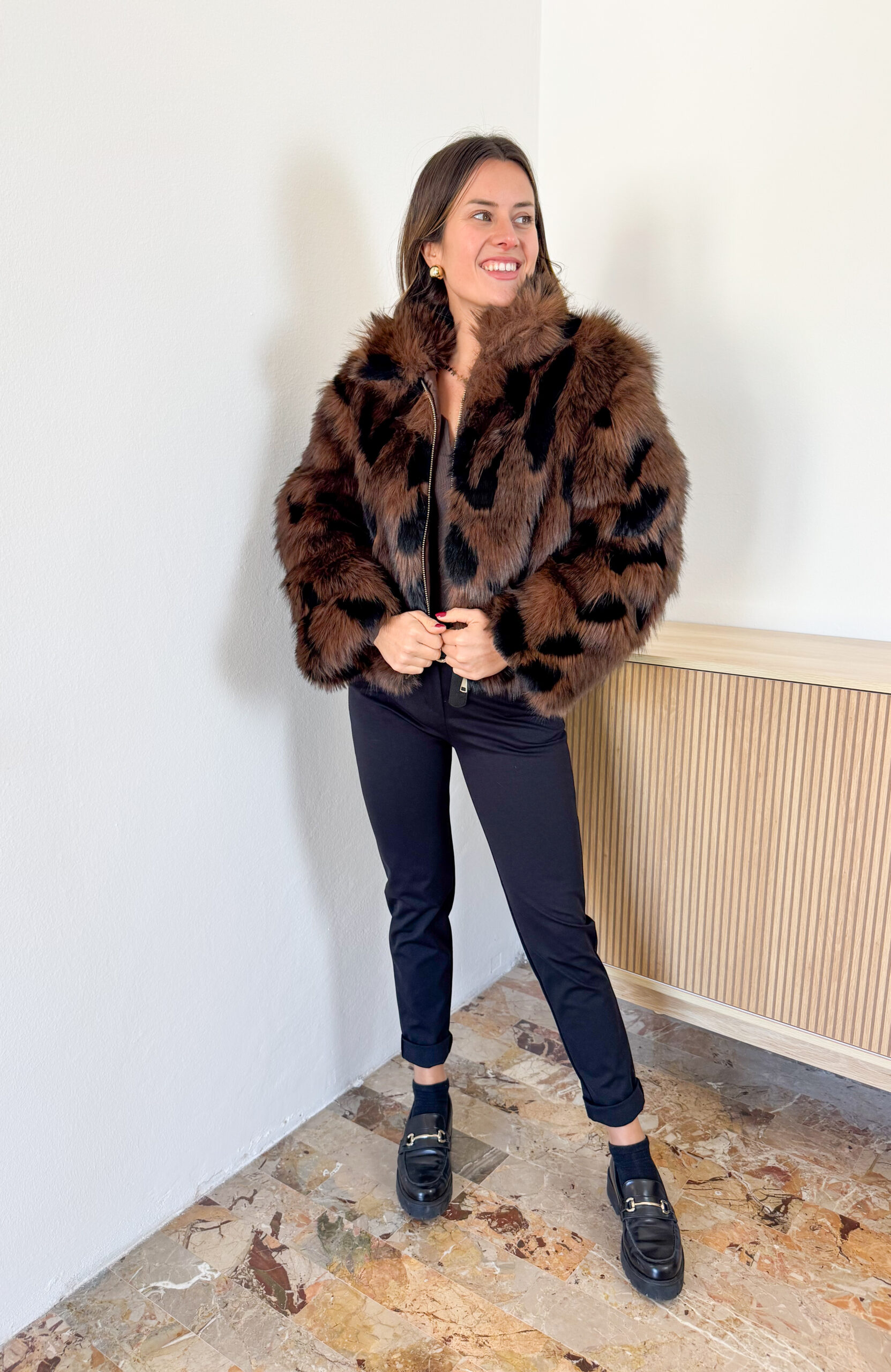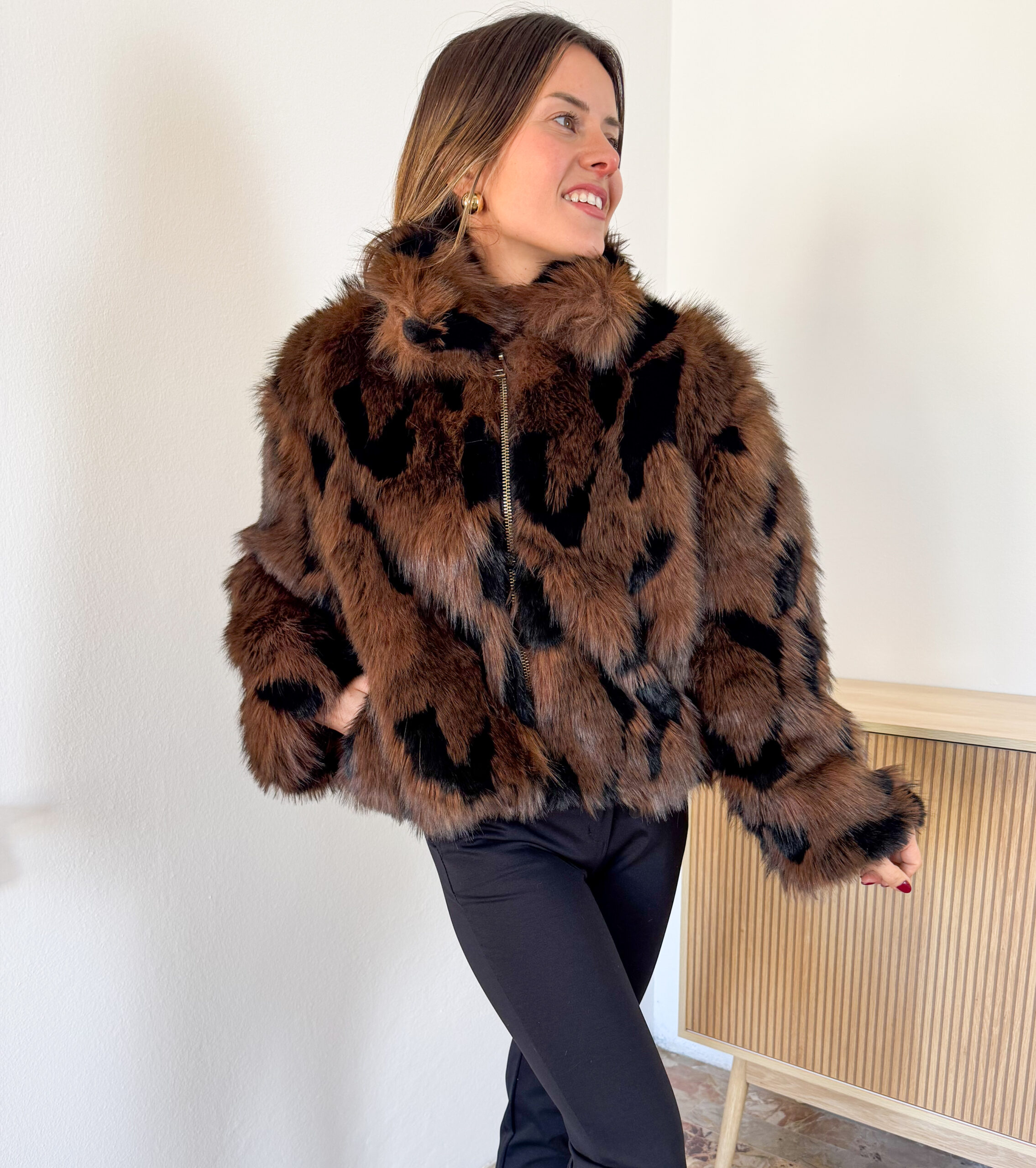 Giacca Natalia in ecopelliccia bicolore. Chiusa con zip dorata sul davanti. Collo a lupetto. Foderata. Con tasche.