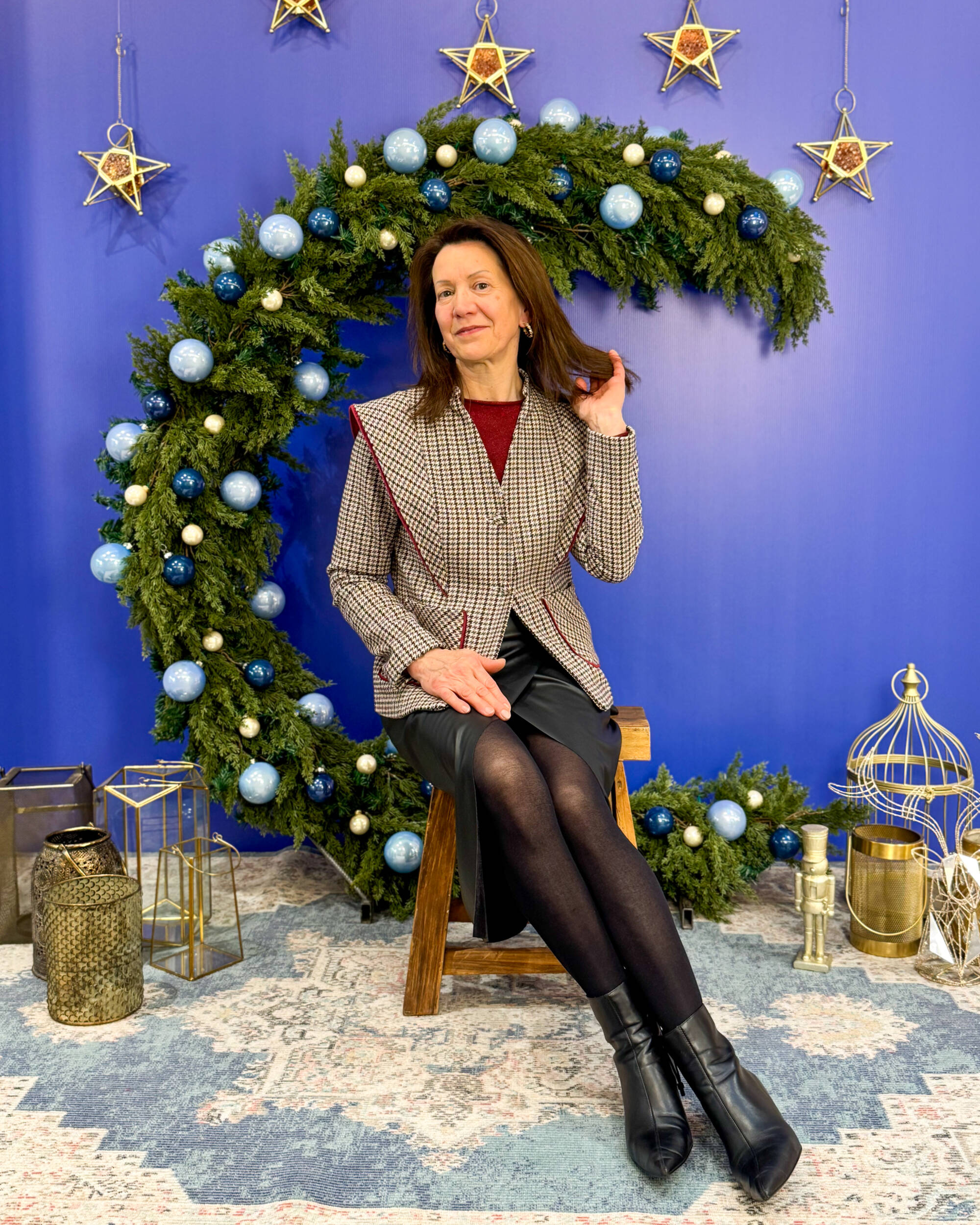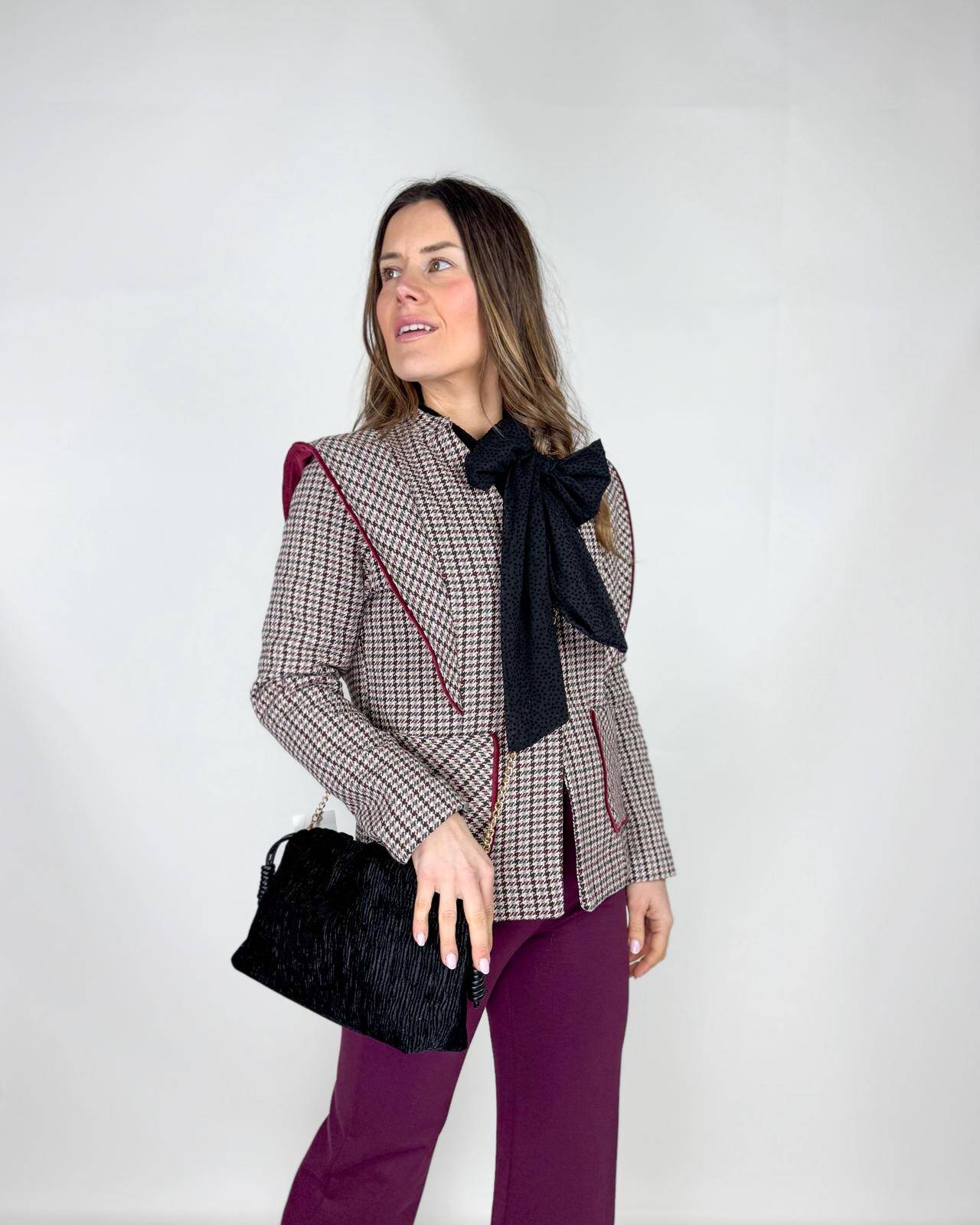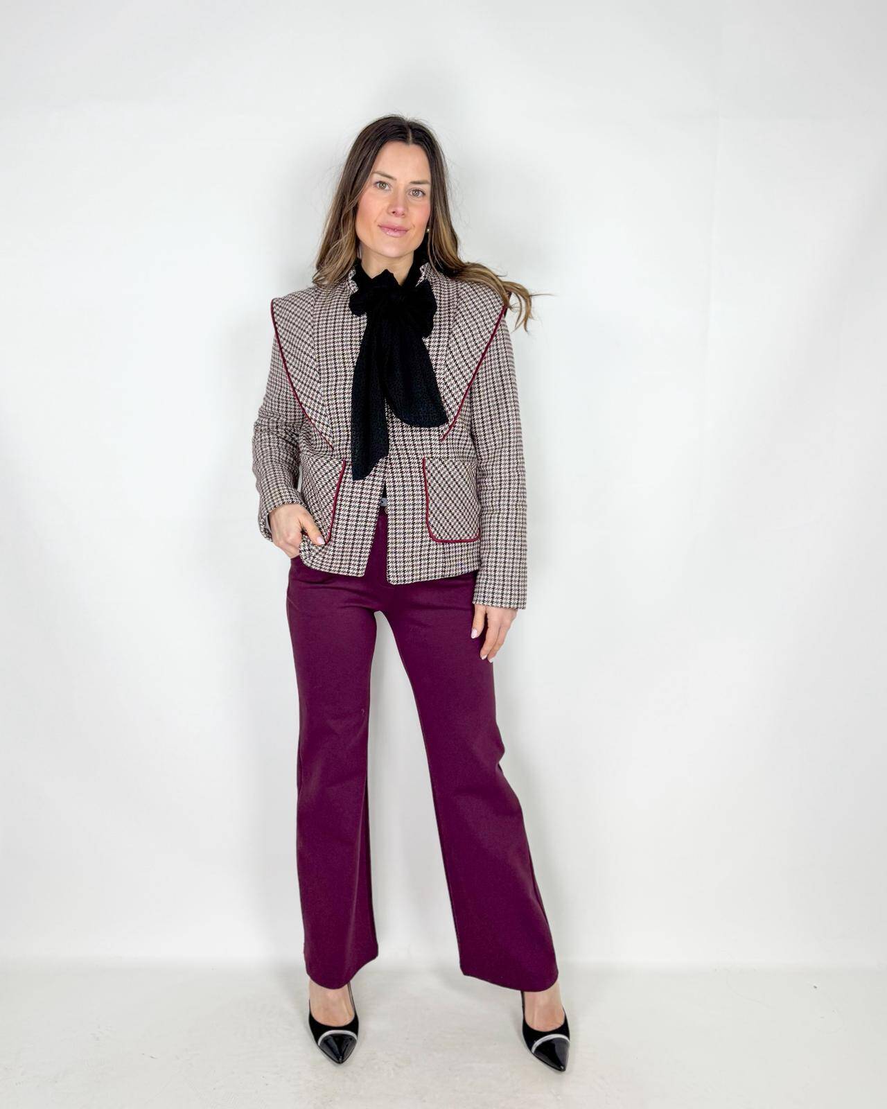 Giacca Woman in fantasia pied de poulle chiusa con 2 bottoni sul davanti. Con balze sulle spalle. Collo alla coreana e tasche a filetto in vita. Arrichisce il pantalone più semplice.