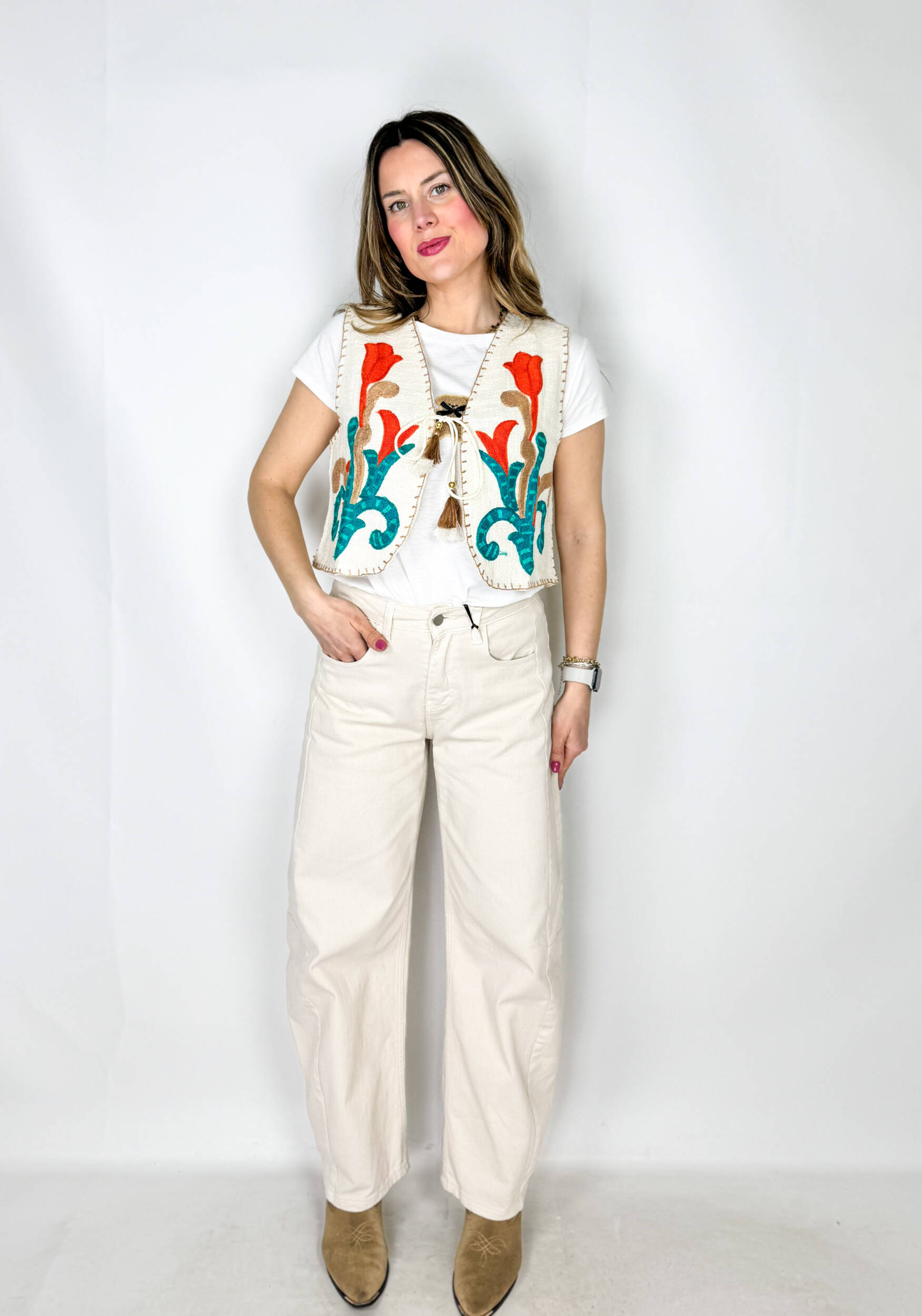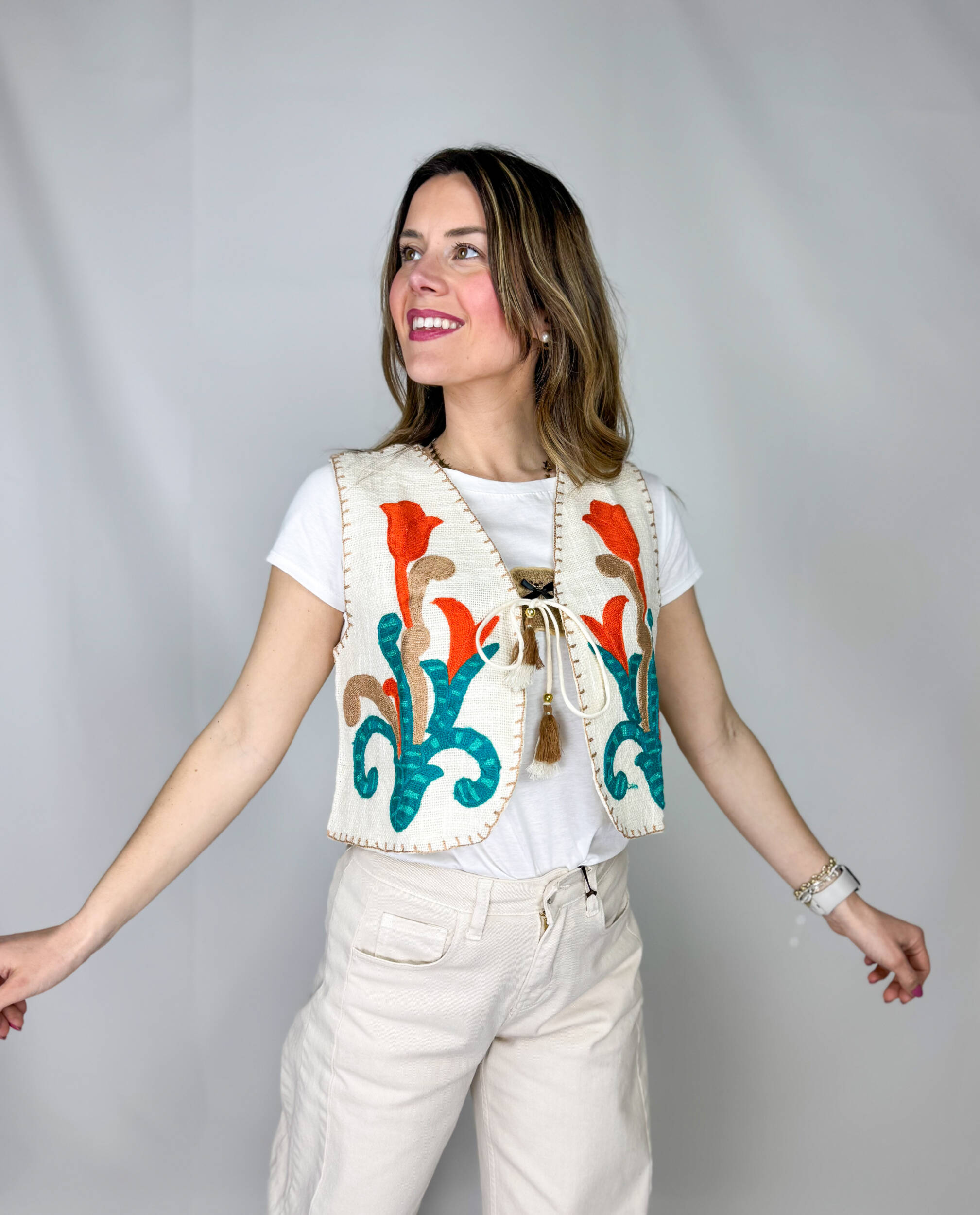Gilet Boho in 100% cotone, interamente realizzato a mano, espressione di artigianalità e cura per i dettagli. La superficie è arricchita da ricami colorati che donano vivacità e unicità al capo, rendendolo un vero pezzo distintivo. La chiusura con asola sul petto aggiunge un tocco delicato e funzionale.