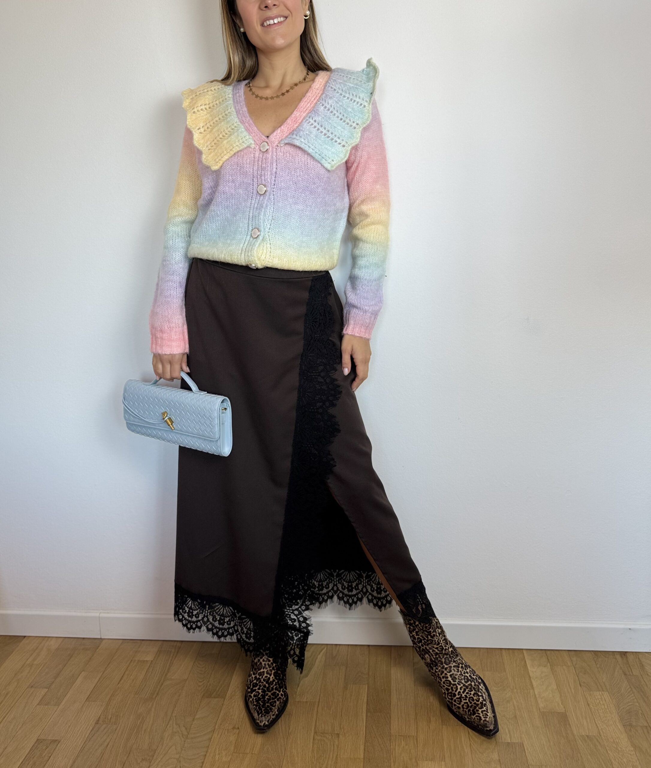 Golfino Rainbow multicolore scollo a V con balza e bottoni gioiello.