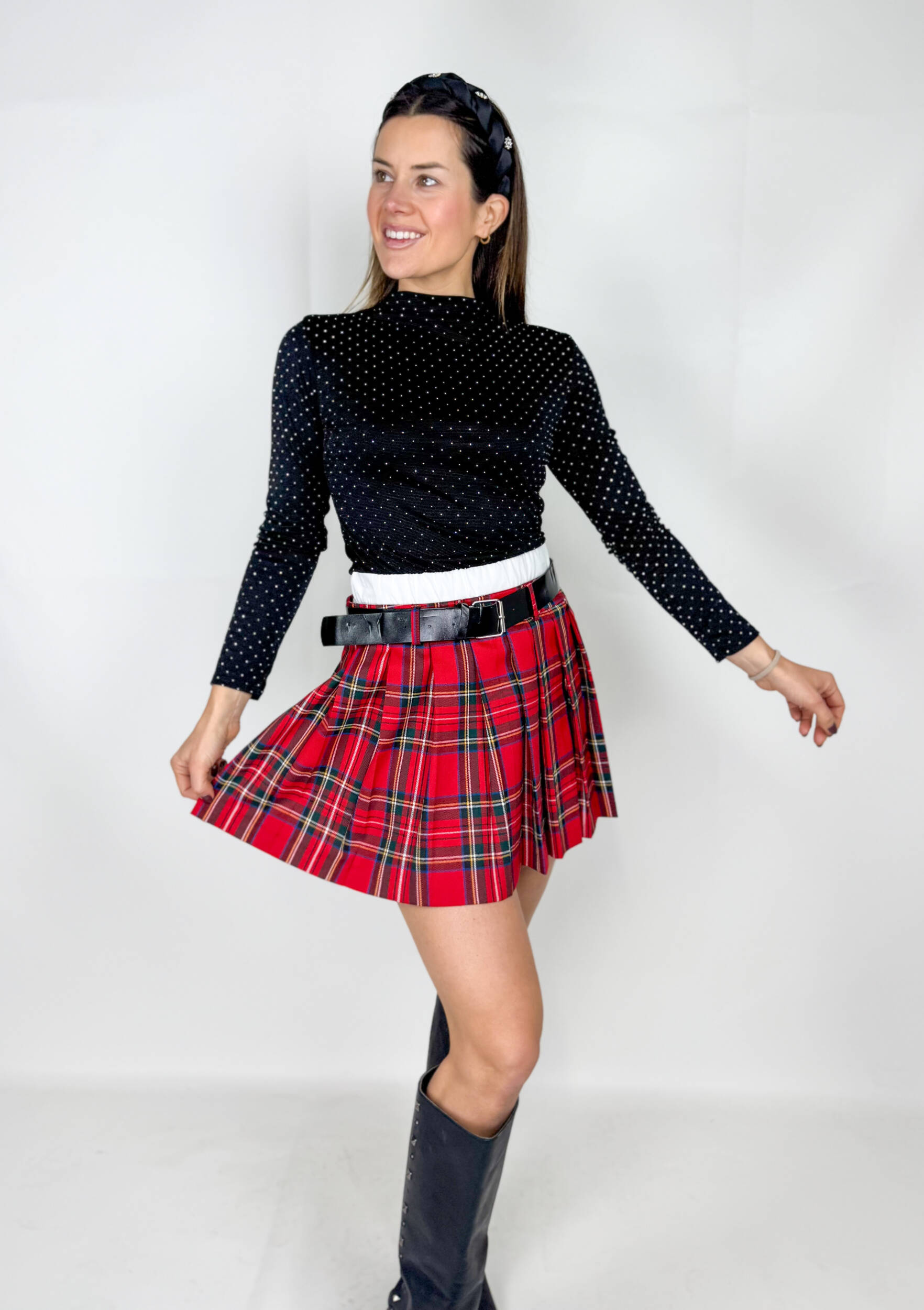 Gonna Christmas in fantasia scozzese plissettata. Elastico bianco in vita e cintura regolabile. Chiusura con zip sul fianco. Classica ma con un tocco di stile.