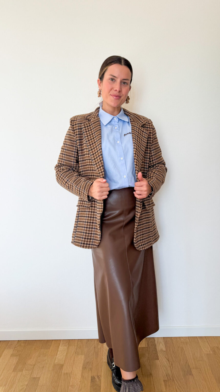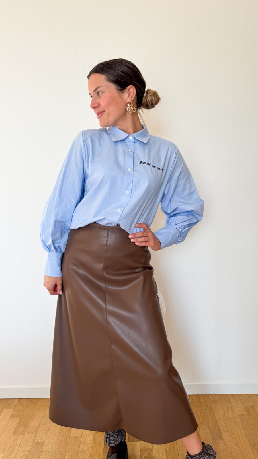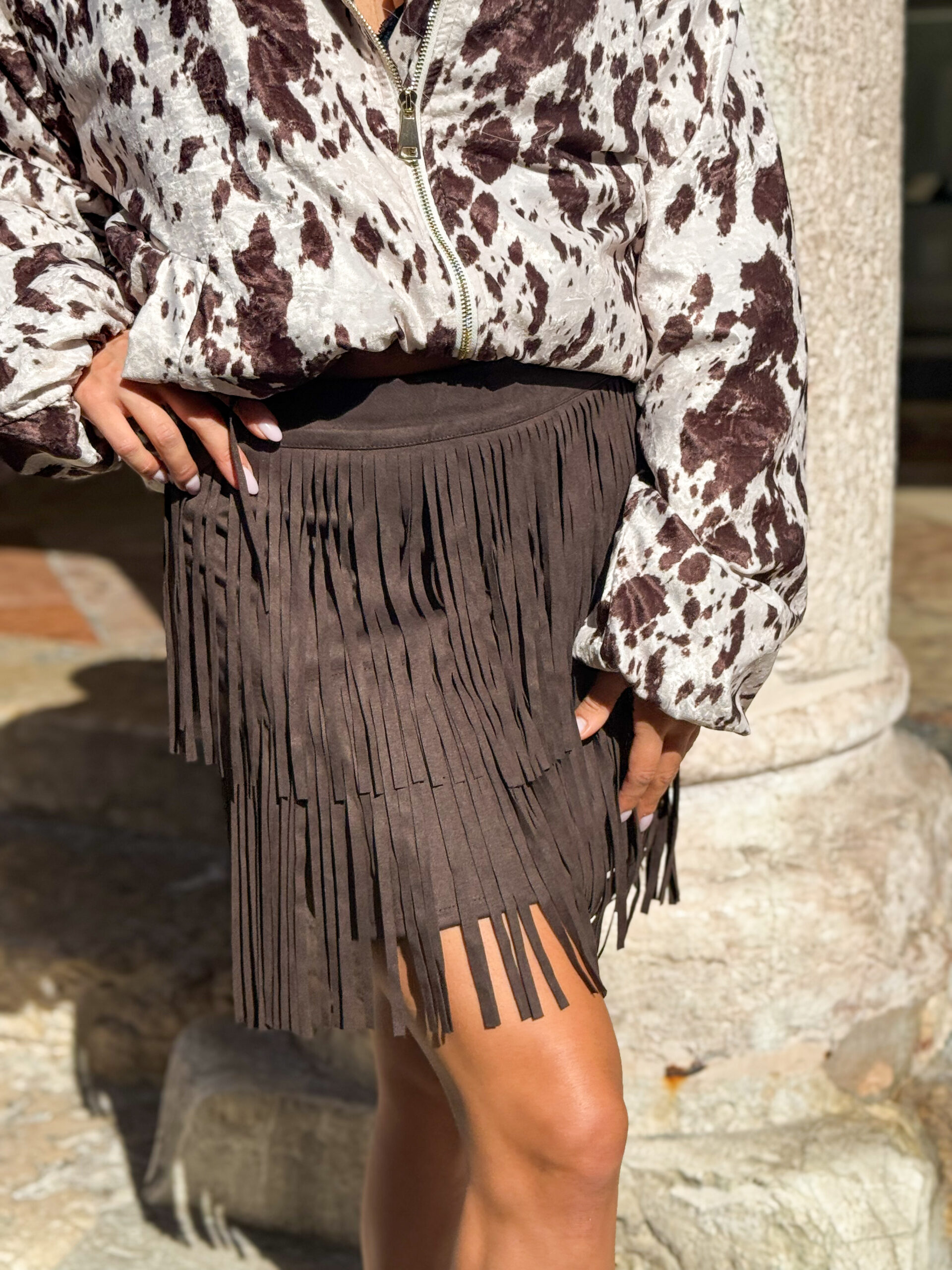 Gonna scamosciata marrone a frange, taglia M, chiusa con zip sul fianco.