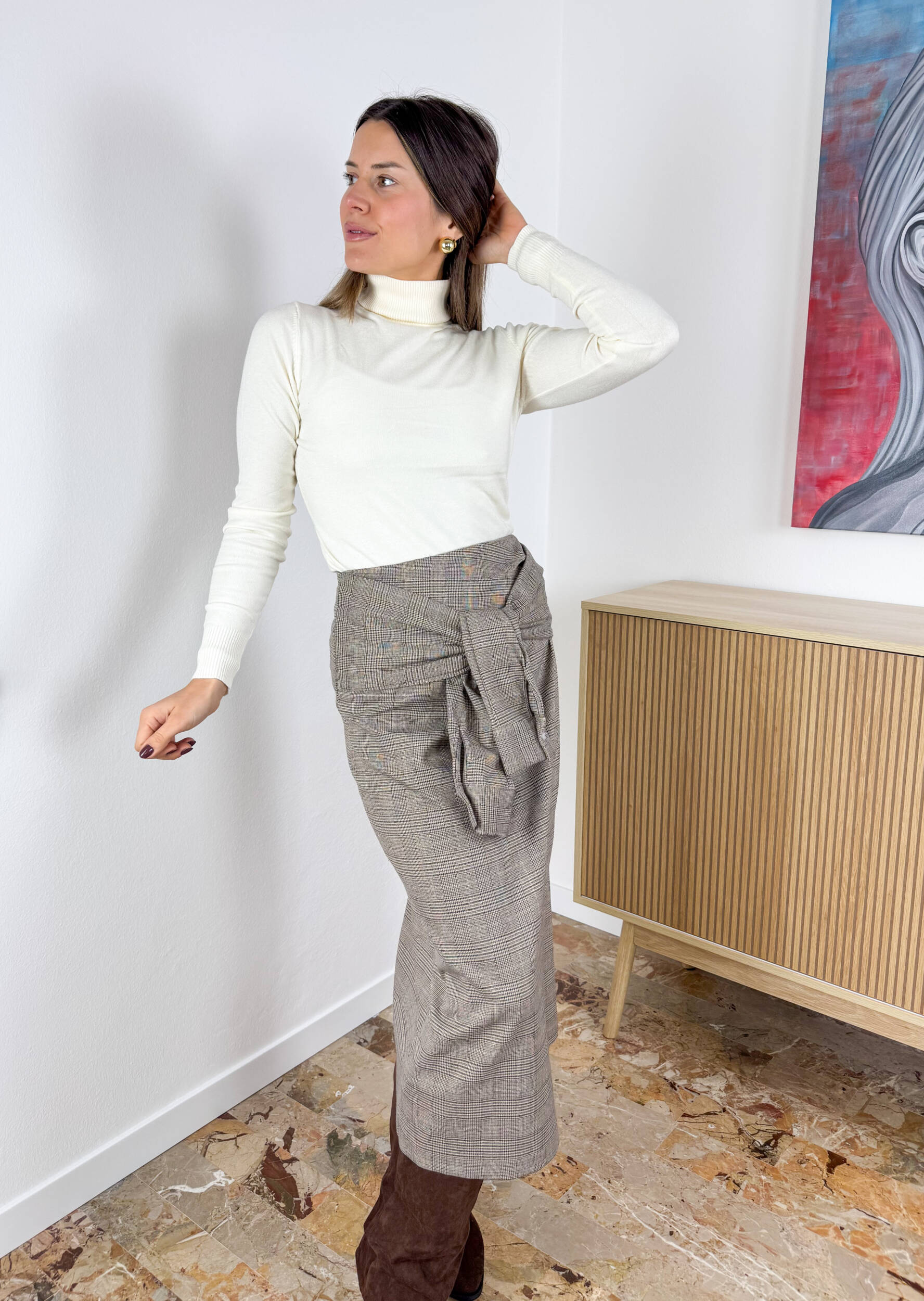 Gonna Giove modello longuette in fantasia. Colorazione del marrone, beige, dorato e rosa. Dettaglio maniche allacciate sul davanti. Con spacchetto frontale. Chiusura con zip sulla schiena.
