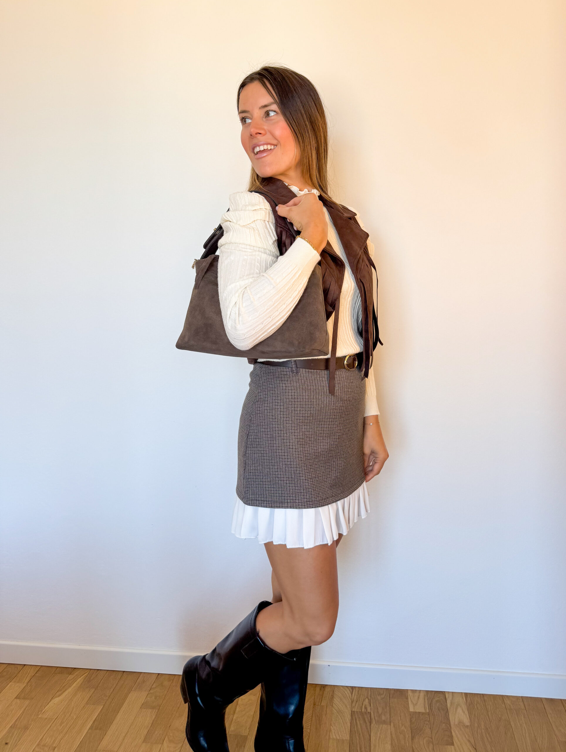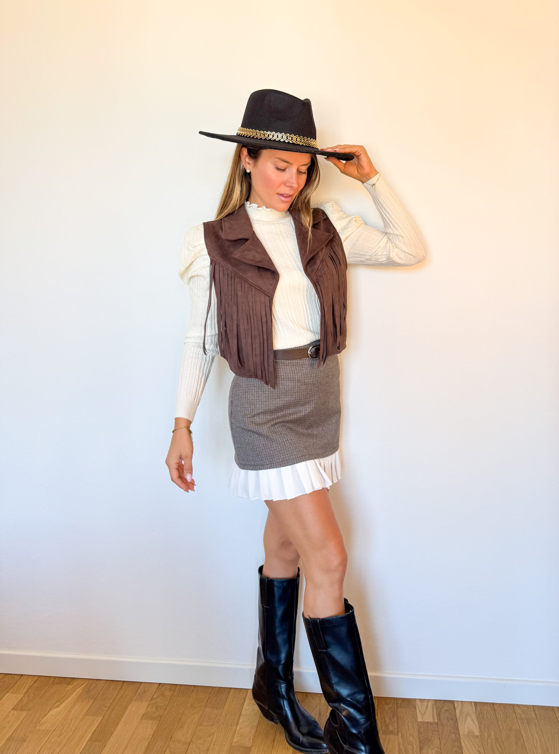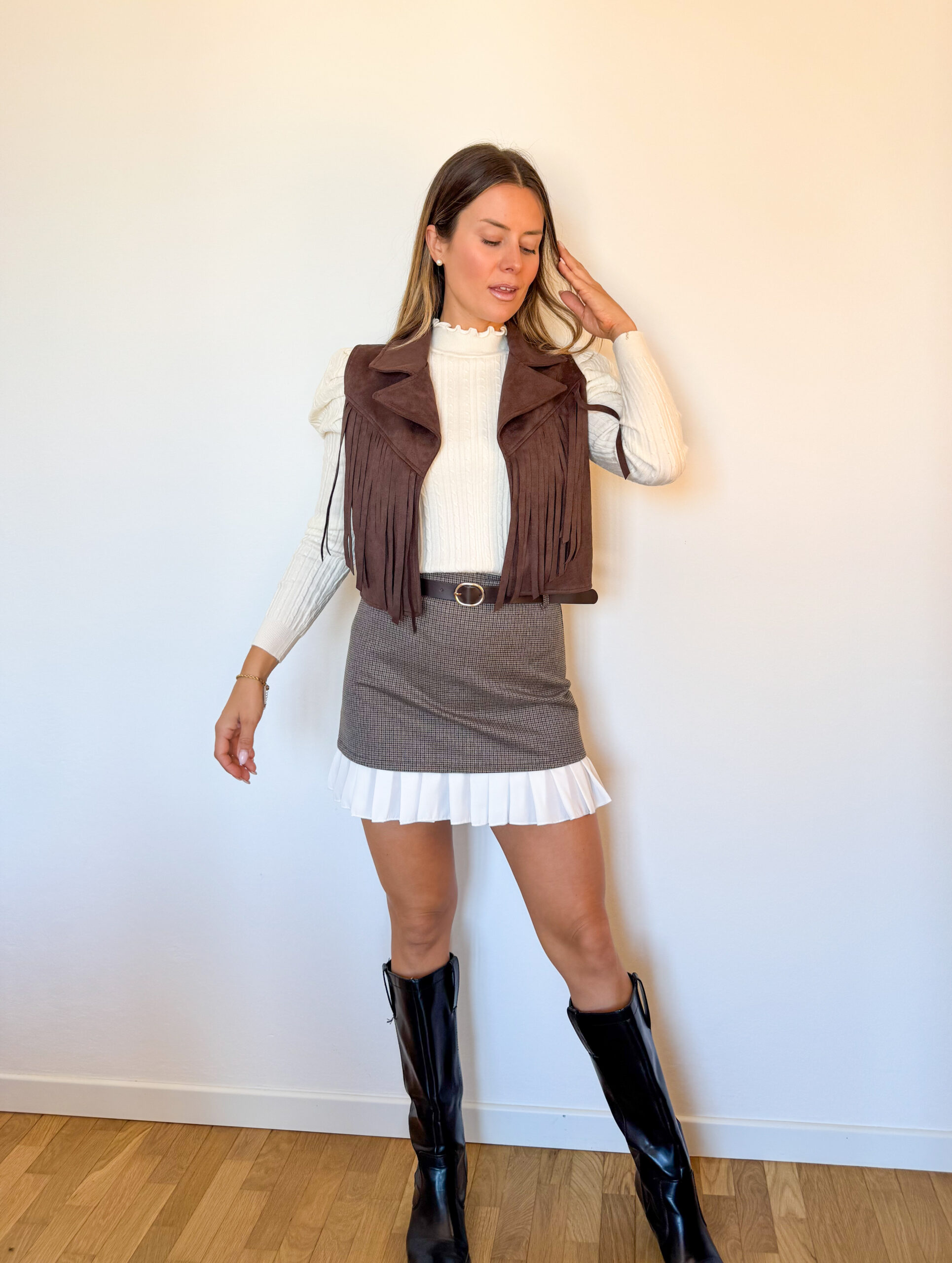 Gonna Rachele in fantasia con balza arricciata sul fondo, chiusura con zip sulla schiena e cintura in vita regolabile. Con fodera.