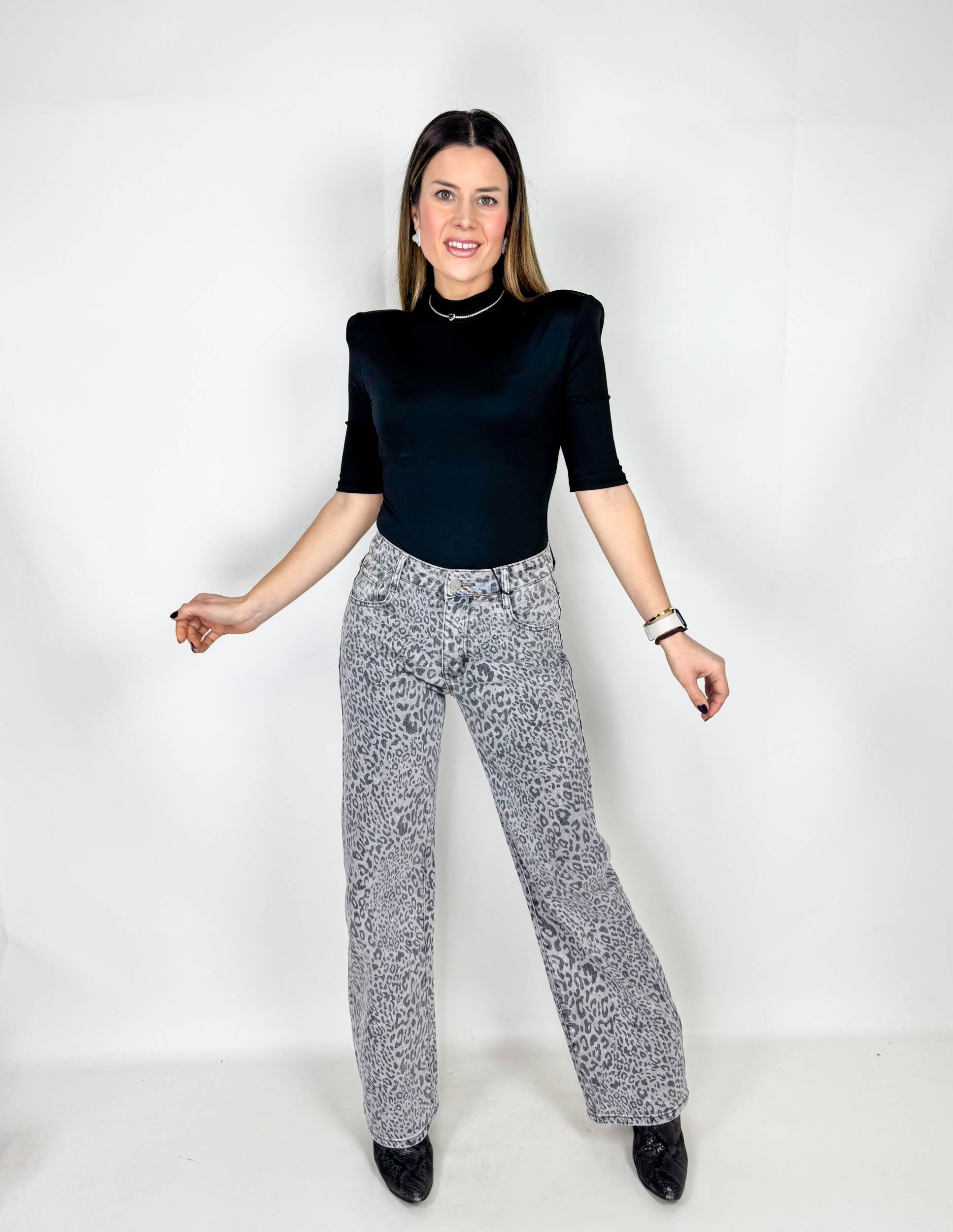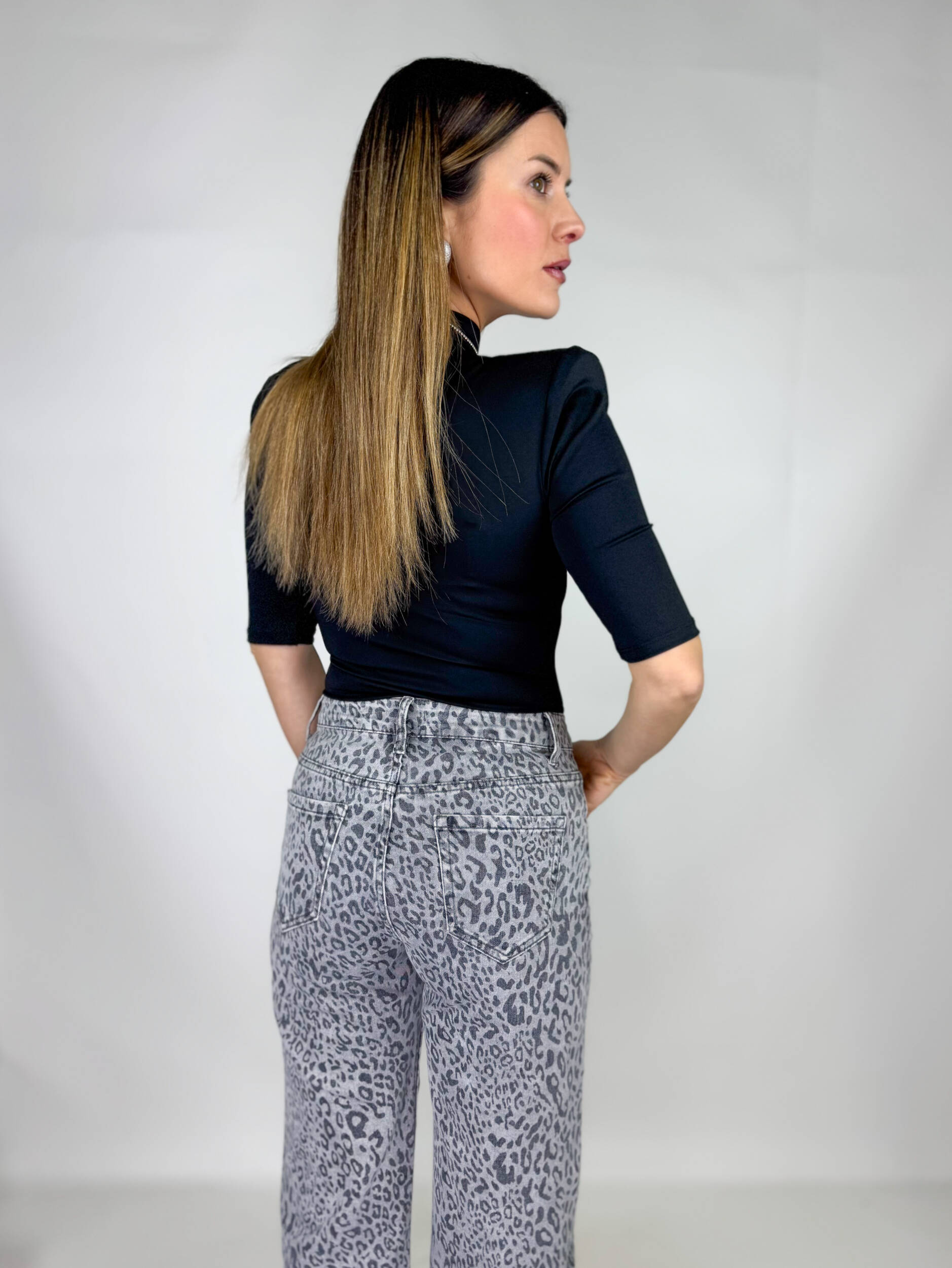 Jeans Africa modello a gamba dritta in fantasia leopardata sui toni del grigio. Chiusura con bottone e zip. Con tasche. Altezza vita: media.