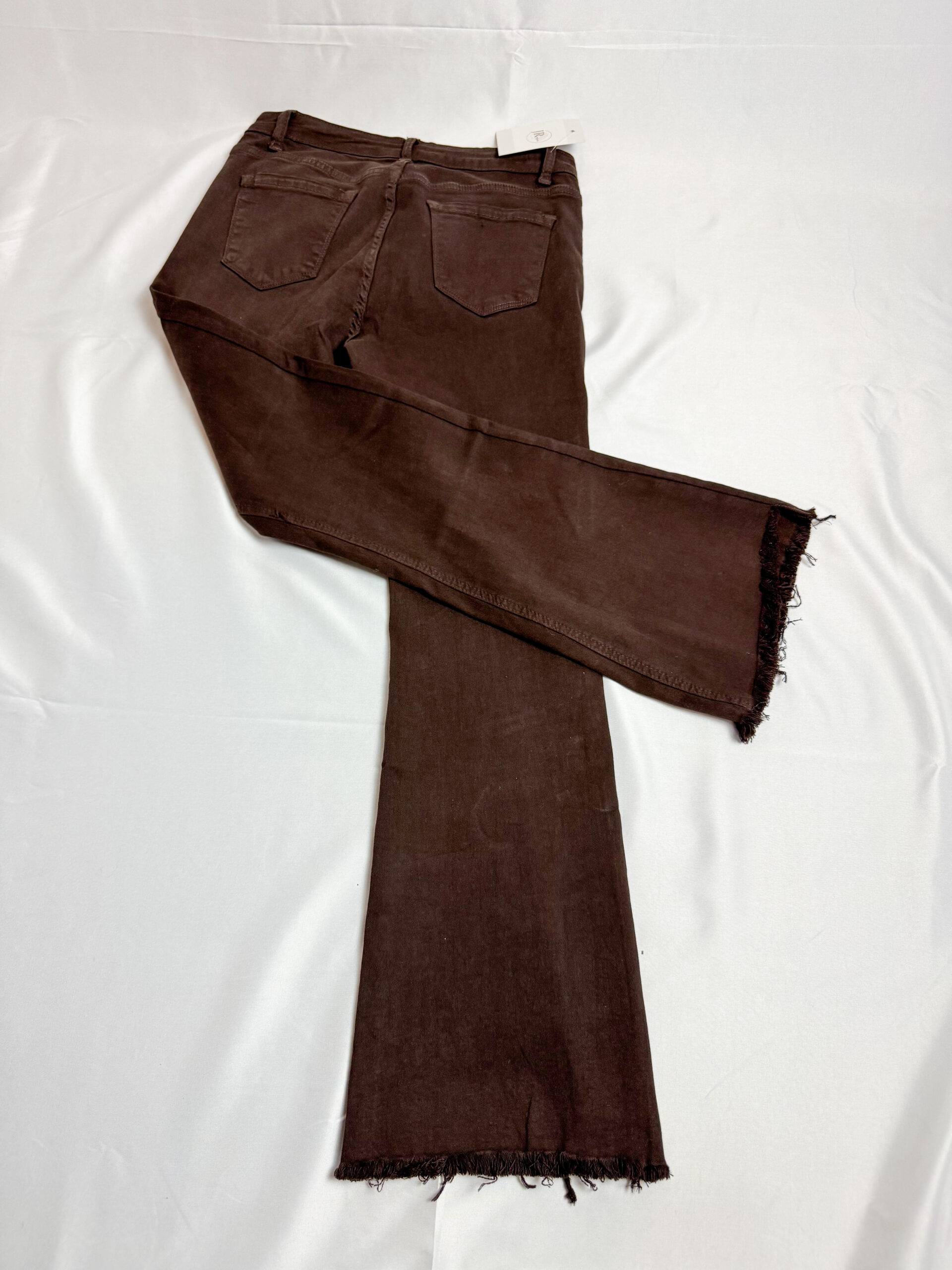 Jeans Brown color cioccolato con fondo sfrangiato a campana. Chiusura con zip e bottone. Con passanti.